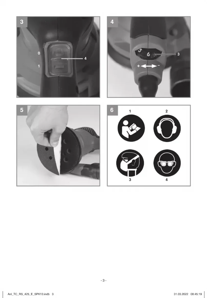 Durch Drehen des Drehzahlreglers (3) können Sie die Drehzahl vorwählen. Plus-Richtung: höhere Drehzahl Minus-Richtung: niedrigere Drehzahl