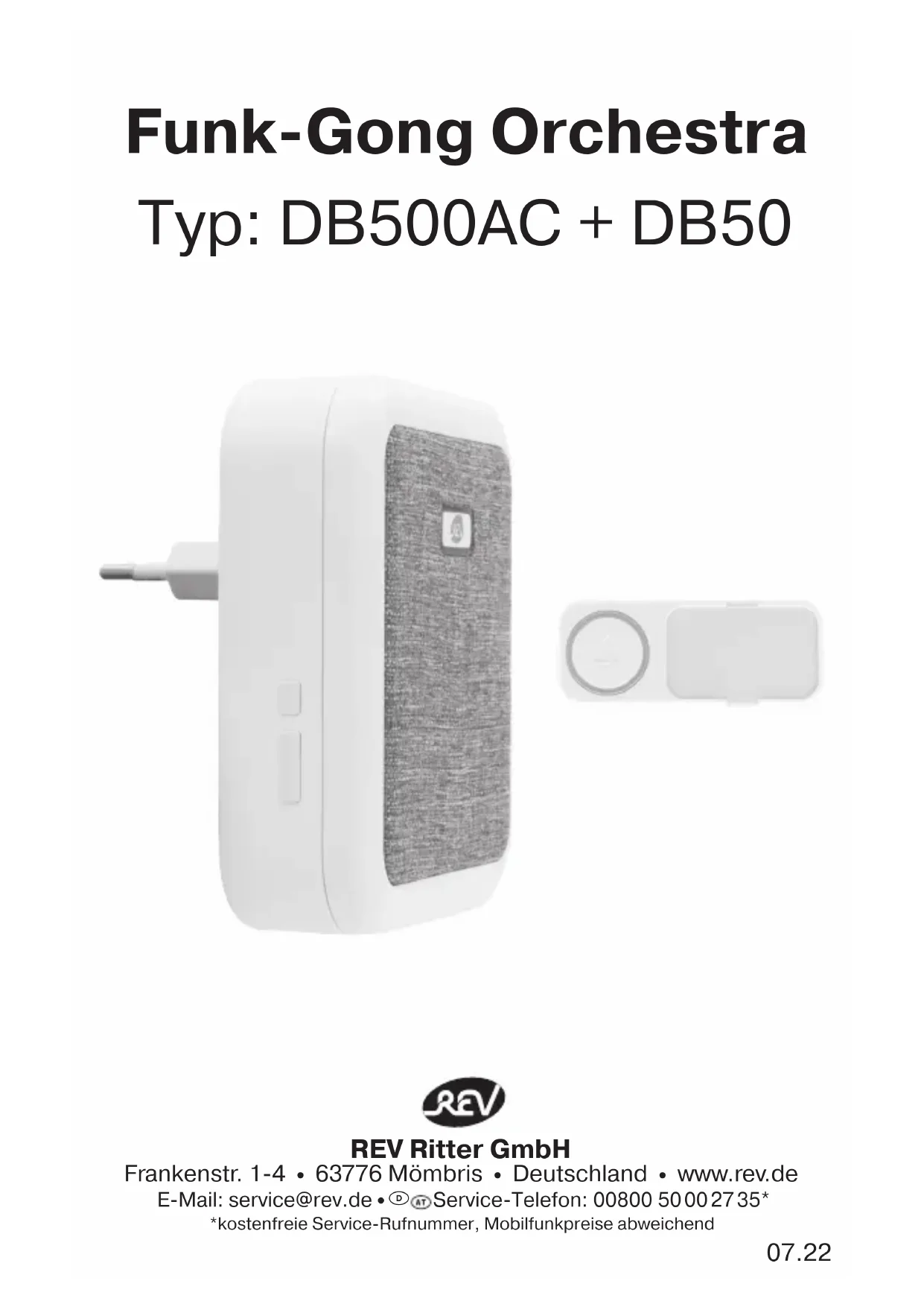 - Überprüfen Sie die Batterien von Empfänger (Gong) und Sender (Klingeltaster, Bewegungsmelder, Fensterkontakt). Wechseln Sie die Batterien, wenn notwendig. Lautstärkeeinstellung/Melodienauswahl Drücken Sie die Taste „Lautstärke“/„Melodie vorwärts/rückwärts“ so oft, bis die gewünschte Lautstärke/Melodie ertönt. Die Lautstärke können Sie jederzeit ändern und ist unabhängig vom zugehörigen Sender. Die zuletzt ausgewählte Lautstärke wird automatisch gespeichert. Sie können weiterhin durch Drücken von „Melodie vorwärts/rückwärts“ verschiedene Klingeltöne abspielen. Dies hat keinen Einfluss auf den gespeicherten Klingelton bei der Codierung zwischen Sender und Empfänger.5 WEEE-Entsorgungshinweis Gebrauchte Elektro- und Elektronikgeräte dürfen gemäß europäischer Vorgaben nicht mehr zum unsortierten Abfall gegeben werden. Das Symbol der Abfalltonne auf Rädern weist auf die Notwendigkeit der getrennten Sammlung hin. Helfen auch Sie mit beim Umweltschutz und sorgen dafür, dieses Gerät, wenn Sie es nicht mehr nutzen, in die hierfür vorgesehenen Systeme der Getrenntsammlung zu geben. RICHTLINIE 2012/19/EU DES EUROPÄISCHEN PARLAMENTS UND DES RATES vom 04. Juli 2012 über Elektro- und Elektronik-Altgeräte. Batterie-Entsorgungshinweis Batterien und Akkus dürfen nicht in den Hausmüll. Jeder Verbraucher ist gesetzlich verpflichtet, alle Batterien und Akkus, egal ob sie Schadstoffe enthalten oder nicht, bei einer Sammelstelle seiner Gemeinde/seines Stadtteils oder im Handel abzugeben, damit sie einer umweltschonenden Entsorgung zugeführt werden können. Batterien und Akkus bitte nur in entladenem Zustand abgeben! CE-Konformitätserklärung Hiermit erklärt REV Ritter GmbH, dass der Funkanlagentyp DB500AC + DB50 der RICHTLINIE 2014/53/EU entspricht. Vollständige CE-Konformitätserklärung siehe unter: www.rev.de unter der entsprechenden Artikel- oder Typnummer. Service Haben Sie Fragen zu unserem Produkt oder eine Beanstandung, dann informieren Sie sich bitte im Internet unter www.rev.de über die Kontaktaufnahme und Retourenabwicklung oder senden eine E-Mail an service@rev.de. Wir weisen darauf hin, dass wir keine Sendungen ohne Retourennummer bearbeiten können und deren Annahme verweigern müssen. Kompatible Produkte Artikelnummer Typnummer Bezeichnung 0082600103 DB500 + DB50 Funkgong Orchestra Quadrat weiß + Klingeltaster Orchestra weiß 0082610103 DB500AC + DB50 Funkgong Orchestra Quadrat für Steckdose weiß + Klingeltaster Orchestra weiß 0082620103 DB400 + DB50 Funkgong Orchestra Rechteck weiß + Klingeltaster Orchestra weiß 0082630103 DB400AC + DB50 Funkgong Orchestra Rechteck für Steckdose weiß + Klingeltaster Orchestra weiß 0083950103 DB50 Funkklingeltaster Orchestra weiß 0083960103 SA-IR07-NWX03-D Funkbewegungsmelder Orchestra weiß 0083970103 SA-MC08-N04-D Funkfensterkontakt Orchestra weiß 0082650103 B6 (AC) + B6 (DC) + DB50 Funkgong-Set Orchestra Gong Q + Gong Q Steckdose weiß + Klingeltaster weiß 0082640103 B7 (DC)