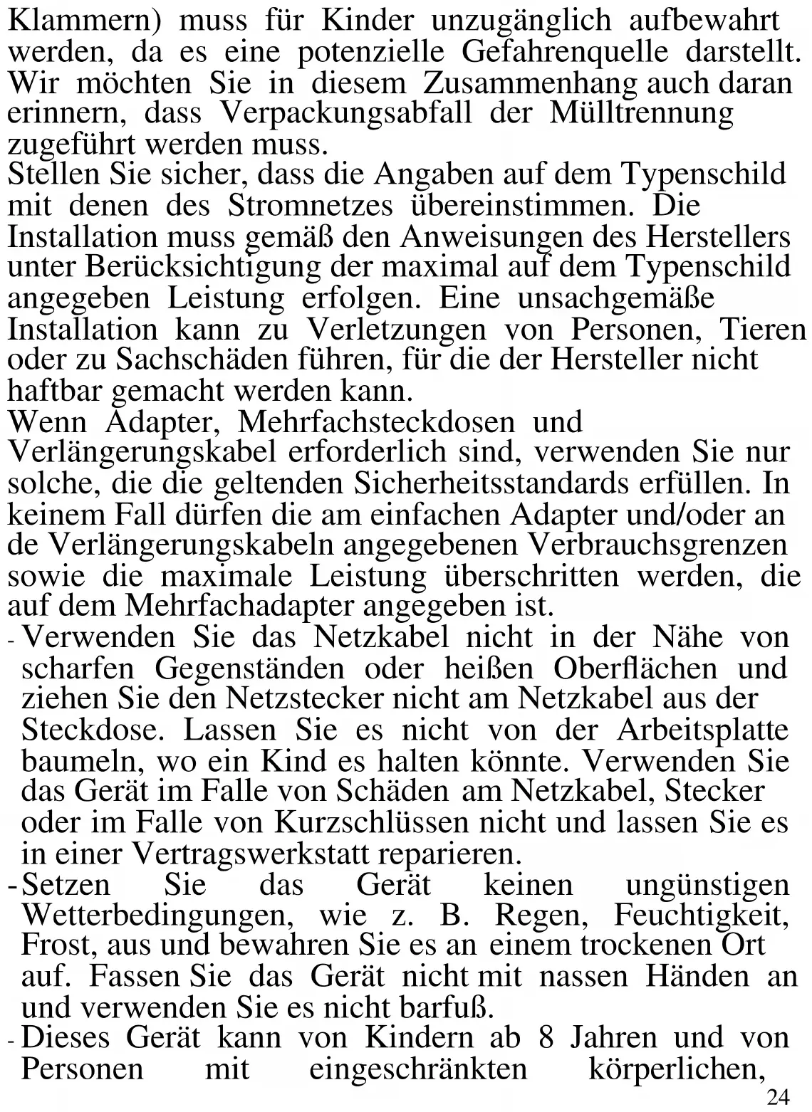 DEUTSCH: HINWEISE: Verwenden Sie das Gerät nur nach den Anweisungen in dieser Bedienungsanleitung. Jede anderweitige Verwendung gilt als unsachgemäß und gefährlich, und der Hersteller kann für Schäden nicht haftbar gemacht werden, die durch eine unsachgemäße, falsche oder unvernünftige Verwendung verursacht werden. Stellen Sie vor der Verwendung sicher, dass das Gerät unversehrt ist. Im Zweifelsfall verwenden Sie es nicht und wenden Sie sich an den Kundendienst. Verpackungsmaterial (Plastiktüten, Styropor, Nägel,24 Klammern) muss für Kinder unzugänglich aufbewahrt werden, da es eine potenzielle Gefahrenquelle darstellt. Wir möchten Sie in diesem Zusammenhang auch daran erinnern, dass Verpackungsabfall der Mülltrennung zugeführt werden muss. Stellen Sie sicher, dass die Angaben auf dem Typenschild mit denen des Stromnetzes übereinstimmen. Die Installation muss gemäß den Anweisungen des Herstellers unter Berücksichtigung der maximal auf dem Typenschild angegeben Leistung erfolgen. Eine unsachgemäße Installation kann zu Verletzungen von Personen, Tieren oder zu Sachschäden führen, für die der Hersteller nicht haftbar gemacht werden kann. Wenn Adapter, Mehrfachsteckdosen und Verlängerungskabel erforderlich sind, verwenden Sie nur solche, die die geltenden Sicherheitsstandards erfüllen. In keinem Fall dürfen die am einfachen Adapter und/oder an de Verlängerungskabeln angegebenen Verbrauchsgrenzen sowie die maximale Leistung überschritten werden, die auf dem Mehrfachadapter angegeben ist. - Verwenden Sie das Netzkabel nicht in der Nähe von scharfen Gegenständen oder heißen Oberflächen und ziehen Sie den Netzstecker nicht am Netzkabel aus der Steckdose. Lassen Sie es nicht von der Arbeitsplatte baumeln, wo ein Kind es halten könnte. Verwenden Sie das Gerät im Falle von Schäden am Netzkabel, Stecker oder im Falle von Kurzschlüssen nicht und lassen Sie es in einer Vertragswerkstatt reparieren. - Setzen Sie das Gerät keinen ungünstigen Wetterbedingungen, wie z. B. Regen, Feuchtigkeit, Frost, aus und bewahren Sie es an einem trockenen Ort auf. Fassen Sie das Gerät nicht mit nassen Händen an und verwenden Sie es nicht barfuß. - Dieses Gerät kann von Kindern ab 8 Jahren und von Personen mit eingeschränkten körperlichen,25 sensorischen oder geistigen Fähigkeiten oder mangelnder Erfahrung und Kenntnissen verwendet werden, wenn sie beaufsichtigt oder instruiert wurden, um das Gerät sicher zu verwenden und die damit verbundenen Gefahren zu verstehen. Kinder dürfen nicht mit dem Gerät spielen. Reinigung und Benutzerwartung dürfen nicht von Kindern ohne Aufsicht durchgeführt werden. - Kinder dürfen nicht mit dem Gerät spielen. - Bewahren Sie das Gerät und sein Netzanschluss außerhalb der Reichweite von Kinder unter 8 Jahren. Wenn das Netzkabel beschädigt ist oder wenn ein Fehler vorliegt, darf das Gerät nicht manipuliert werden. Jede Reparatur muss vom Hersteller oder seinem technischen Kundendienst oder in jedem Fall von einer Person mit ähnlicher Qualifikation durchgeführt werden, um jegliches Risiko zu vermeiden. Die Nichtbeachtung der vorstehenden Bestimmungen kann die Sicherheit des Geräts beeinträchtigen und die Garantiebedingungen ungültig machen. WARNUNG: Dieses Gerät enthält eine Heizfunktion. Oberflächen, außer die funktionellen Oberflächen können hohe Temperaturen entwickeln. Da die Temperaturen von verschiedene Personen unterschiedlich wahrgenommen werden, sollte dieses Gerät mit VORSICHT verwendet werden. Halten Sie das Gerät ausschließlich auf Griffflächen die abhalten und verwenden Sie solche Hitzeschutzmaßen. Dieses Gerät ist nur für den Hausgebrauch oder gleichwertiges bestimmt, in Situationen wie bspw.: Kantinen in kleinen Firmen oder ähnliche Arbeitsumgebungen, von Kunden in Hotels, Motels oder andere Art von touristische Unterkunft, wie ländlicher oder Wohn –Tourismus. Das Gerät darf nicht mit einer Zeitschaltuhr oder mit26 einem separaten Fernwirksystem betrieben werden Führen Sie vor jedem Gebrauch das Netzkabel aus. Setzen Sie das Produkt keinen Stößen aus, es könnte beschädigt werden. Verwenden Sie nur originale und kompatible Teile und Zubehör. ALLGEMEINE HINWEISE Die hintere Rückseite des Geräts soll gegen eine Wand gestellt werden. Stellen Sie das Gerät auf eine stabile und ebene Fläche. Keine heißen Oberflächen berühren. Benutzen Sie immer Griffe und Schalter. Um Elektroschocks zu vermeiden, den Netzkabel, den Stecker oder den Körper niemals in Wasser oder andere Flüssigkeiten tauchen Ziehen Sie den Netzstecker aus der Steckdose, wenn das Gerät nicht gebraucht wird, vor Teile angebracht oder entfernt werden und vor dem Reinigen Die Benutzung von Zubehörteile die nicht vom Hersteller empfohlen werden, können Schäden oder Verletzungen verursachen die nicht von der Garantie abgedeckt werden Stellen Sie das Gerät nicht auf oder in der Nähe eines heißen Gas-oder Elektrokoches oder aufgeheizten Backofen BESCHREIBUNG FE60 1 Stecker und Netzkabel 2 Zeitschaltuhr 3 Bedienschalter 4 Betriebslampe 5 Temperaturwahlschalter 6 obere Abdeckung 7 Griff 8 Grillrost 9 Backblech 10 Heizelemente 11Backblech Griff 12 Spieß 13 Spießgriff INBETRIEBNAHME Vor der Verwendung alle Zubehörteile und den Garraum sorgfältig waschen. Lassen Sie den Garraum während 30 min. mit der Tür offen lüften und dann schalten Sie den Ofen für ein paar Minuten leer ein. Vor dem ersten Garen, lassen Sie den Ofen während 10 min. mit seiner maximal Temperatur funktionieren und wählen Sie beide Heizelemente. Bedienfeld Mit dem Bedienschalter (3) ist es möglich nur die untere, obere oder beide Widerstandskräften zu wählen.27 Position 1 (Grillen): schaltet die obere Widerstandskraft ein (Grill kochen) und Spieß Position 2: schaltet die untere Widerstandskraft ein Position 3 (Anbraten): schaltet die untere und obere Widerstandskraft ein. Position 4: schaltet die obere Widerstandskraft und die Ventilation ein Posit