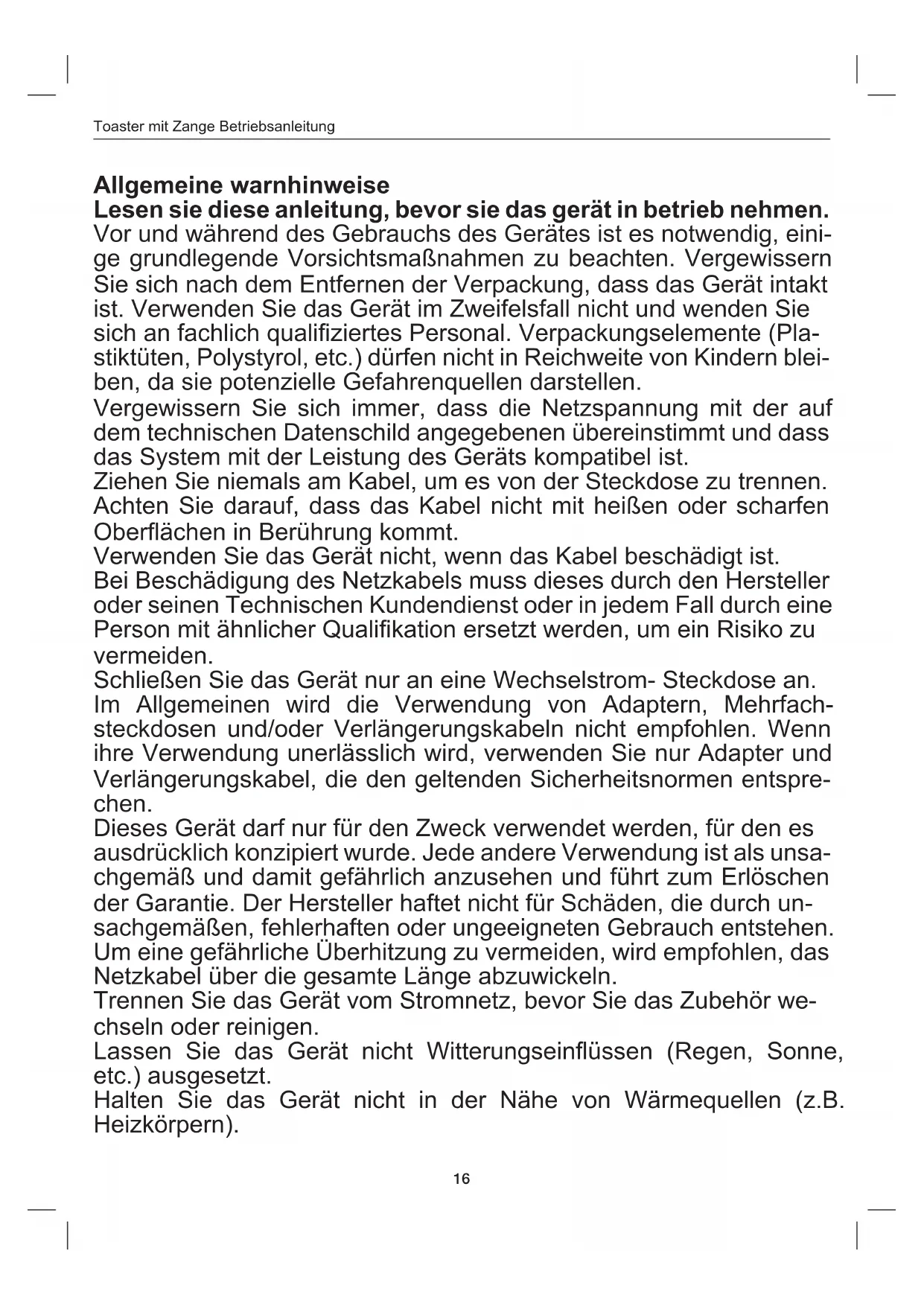 Dieses Gerät darf nicht von Personen (einschließlich Kindern) mit ein- geschränkten körperlichen, sensorischen oder geistigen Fähigkeiten verwendet werden; von Personen, denen die Erfahrung und Kennt- nisse über das Gerät fehlen, es sei denn, sie werden von einer für ihre Sicherheit verantwortlichen Person sorgfältig überwacht oder gut in die Bedienung des Geräts eingewiesen. Achten Sie darauf, dass Kinder nicht mit dem Gerät spielen. Wenn Sie sich entscheiden, dieses Gerät als Abfall zu entsorgen, wird empfohlen, es außer Betrieb zu setzen. Es wird auch empfohlen, teile des gerätes, die eine gefahr darstellen können, sicher zu entsorgen. Die- ses gerät darf nicht von kindern benutzt werden. Be- wahren sie das gerät ausserhalb der reichweite von kindern auf. Sicherheitsvorschriften Lesen sie aufmerksam die gebrauchsanleitung bevor sie ihr gerät benutzen, und behalten sie sie Für künftige benutzungen. Benutzen sie das gerät nur zu haushaltszwecken, um brotscheiben zu toasten, und wie in der bedienungsanleitung angegeben. Benutzen sie das gerät mit dem kompletten mitgelieferten zubehör. Benutzen sie kein anderes zubehör, weil dies eine gefahr für den be- nutzer darstellt und das gerät dadurch beschädigt werden Könnte. Der toaster wird heiβ während des gebrauchs. Berühren sie nur die plastikteile und nicht die metallteile bis das gerät völlig abgekühlt ist. Personen (einschließlich kinder), die aufgrund ihrer physischen, sen- sorischen oder geistigen fähigkeiten oder ihrer unerfahrenheit oder unkenntnis nicht in der lage sind, das gerät sicher zu benutzen, soll- ten dieses gerät nicht ohne aufsicht oder anweisung durch eine ve- rantwortliche person benutzen. Kinder sollten beaufsichtigt werden, um sicherzustellen, dass sie nicht mit dem gerät spielen. Achtung: bei gebrauch von elektrogeräten ist es zwingend notwen- dig, dass alle sicherheitshinweise beachtet werden um feuergefahr, gefahr eines elektrischen schlags und verletzungsgefahr vorzubeu- gen. Ziehen sie den stecker aus der steckdose, wenn ihr gerät nicht benutzt wird.Toaster mit Zange Betriebsanleitung