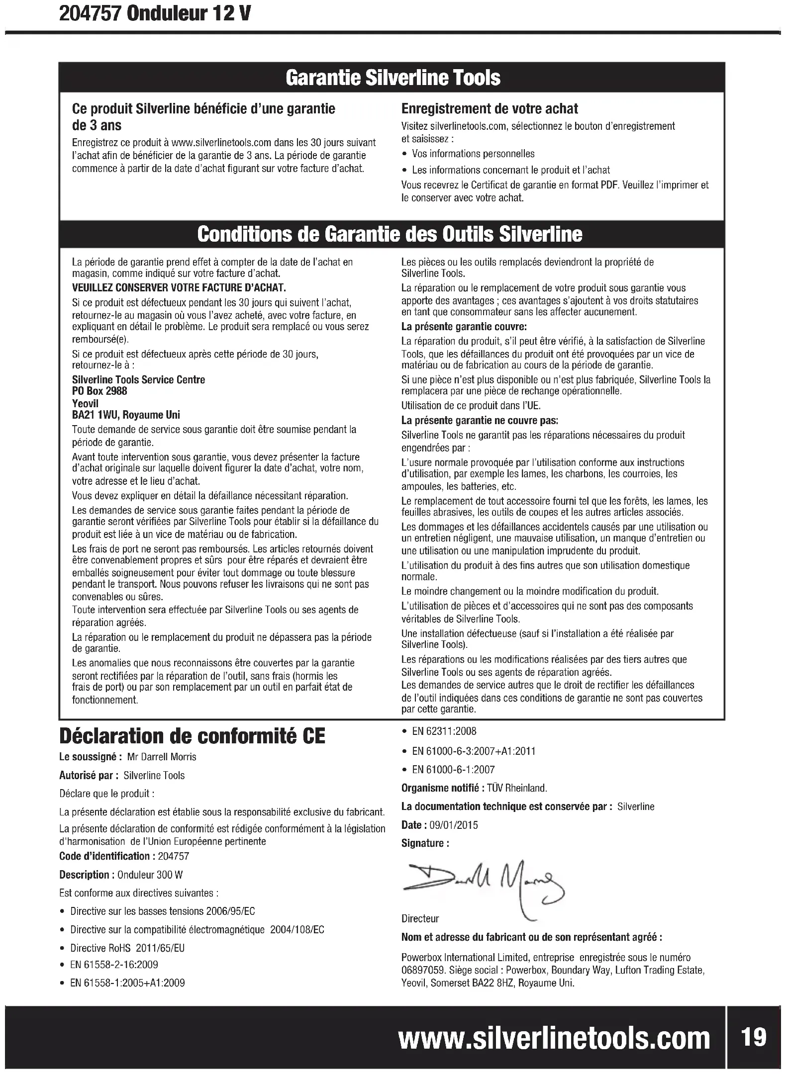 204757 Spannungswandler, 12 V EU-Konformitätserklärung Name des Unterzeichners: Mr Darrell Morris Bevollmächtigter: Silverline Tools Erklärt, dass das Produkt: Die alleinige Verantwortung für die Ausstellung dieser Erklärung trägt der Hersteller. Der Gegenstand der Erklärung erfüllt die einschlägigen Harmonisierungsrechtsvorschriften der Gemeinschaft. Ident.-Nr.: 204757 Produktbeschreibung: 300-W-Wechselrichter Den folgenden Richtlinien entspricht: