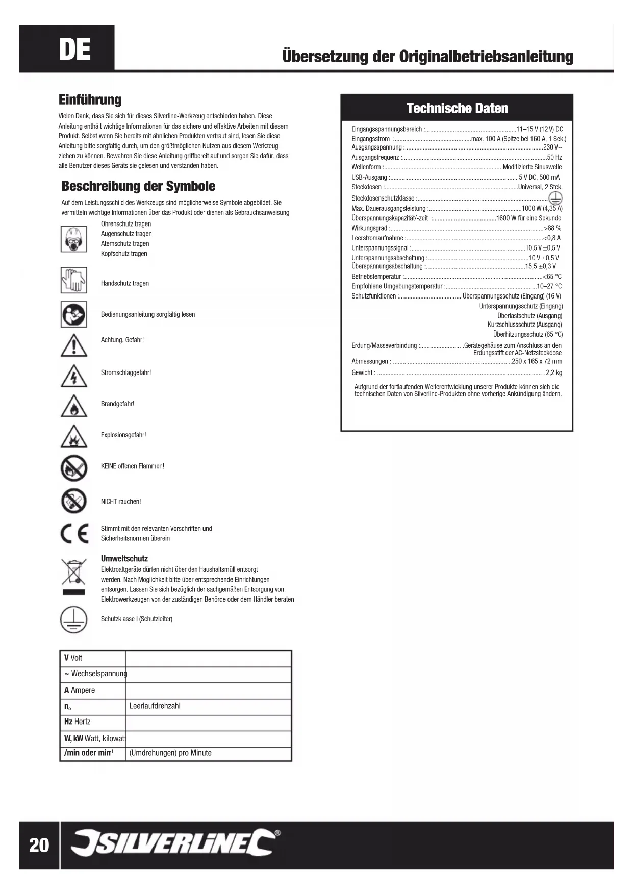 168754 Spannungswandler, 12 V Garantiebedingungen für Silverline Tools Silverline Tools Garantie Dieses Silverline-Produkt wird mit einer 3-Jahres- Garantie angeboten Registrieren Sie dieses Produkt unter silverlinetools.com innerhalb von 30 Tagen nach dem Kauf, um die 3-Jahres-Garantie zu aktivieren. Der Garantiezeitraum beginnt mit dem Kaufdatum auf Ihrem Kaufbeleg. Registrierung Ihres Kaufs Gehen Sie zu: silverlinetools.com, wählen Sie den Link Registrierung und geben Sie Folgendes ein:• Ihre persönlichen Angaben• Produktdetails und KaufinformationenSobald dieses Produkt registriert worden ist, wird Ihre Garantiebescheinigung im PDF-Format erzeugt. Bitte drucken Sie sie aus und bewahren Sie sie zusammen mit Ihrem Produkt auf.Der Garantiezeitraum beginnt mit dem Kaufdatum im Einzelhandel, das auf dem Kaufbeleg angegeben ist.BITTE BEWAHREN SIE IHREN KAUFBELEG AUFFalls dieses Produkt innerhalb von 30 Tagen nach dem Kauf einen Defekt aufweisen sollte, bringen Sie es bitte mit Ihrem Kaufbeleg zu dem Fachhändler, bei dem es gekauft wurde, und informieren Sie ihn über die Mängel. Das Gerät wird ersetzt oder der Kaufpreis zurückerstattet.Falls dieses Produkt nach Ablauf von 30 Tagen nach dem Kauf einen Mangel aufweist, senden Sie es an:Silverline Tools Service CentrePO Box 2988YeovilBA21 1WU, GroßbritannienDer Garantieanspruch muss während der Garantiezeit gestellt werden.Sie müssen den Originalkaufbeleg mit Angabe des Kaufdatums einreichen und Ihren Namen und Ihre Adresse sowie den Ort des Kaufs angeben, bevor etwaige Arbeiten durchgeführt werden können.Sie müssen genaue Angaben über den zu behebenden Defekt machen.Alle innerhalb der Garantiefrist gemachten Forderungen werden von Silverline Tools daraufhin überprüft werden, ob es sich bei den Mängeln um einen Material- oder Fertigungsfehler handelt.Versandkosten werden nicht zurückerstattet. Alle Produkte sollten sich in sauberem und sicherem Zustand befinden und sorgfältig verpackt zur Reparatur eingeschickt werden, um Schäden oder Verletzungen während des Transports zu vermeiden. Die Annahme ungeeigneter oder unsicherer Lieferungen kann von uns verweigert werden.Alle Arbeiten werden von Silverline Tools oder seinen autorisierten Reparaturwerkstätten durchgeführt.Die Reparatur oder der Ersatz des Produkts führt nicht zur Verlängerung des Garantiezeitraums.Mängel, bei denen unsere Prüfung ergibt, dass sie unter die Garantie fallen, werden durch kostenlose Reparatur des Werkzeugs (ohne Versandkosten) oder Ersatz durch ein Werkzeug in einwandfreiem Zustand behoben.Einbehaltene Werkzeuge oder Teile, die ersetzt wurden, gehen in den Besitz von Silverline Tools über.Die Reparatur bzw. der Ersatz Ihres Produkts unter dieser Garantie erfolgt zusätzlich zu Ihren gesetzlichen Rechten als Verbraucher und hat keine nachteiligen Folgen auf diese.Durch die Garantie abgedeckt ist:Die Reparatur des Produkts, nachdem zur Zufriedenheit von Silverline Tools nachgewiesen wurde, dass der Defekt durch fehlerhaftes Material oder mangelhafte Arbeitsausführung bedingt ist und in den Garantiezeitraum fällt.Wenn ein Ersatzteil nicht mehr erhältlich ist oder nicht mehr hergestellt wird, kann Silverline Tools es gegen einen funktionellen Ersatz austauschen.Verwendung des Produkts innerhalb der EU.Durch die Garantie nicht abgedeckt ist:Silverline Tools garantiert keine Reparaturen, die durch Folgendes erforderlich geworden sind:Normale Verschleißerscheinungen, die trotz Verwendung entsprechend der Bedienungsanleitung entstehen, z.B. an Messern, Bürsten, Riemen, Glühbirnen, Batterien usw. Ersatz von mitgeliefertem Zubehör wie etwa Bohrspitzen, Messern, Sandpapier, Schneidscheiben und anderen zugehörigen Teilen.Unfallschäden und Fehler, die durch unsachgemäße Verwendung oder Wartung, Missbrauch, Nachlässigkeit oder fahrlässige Bedienung oder Handhabung des Produkts entstanden sind.Verwendung des Produkts für andere als normale Haushaltszwecke.Jegliche Veränderungen oder Modifikationen des Produkts.Die Verwendung von Teilen oder Zubehör, die keine Originalkomponenten von Silverline Tools sind.Fehlerhafte Montage (außer, wenn von Silverline Tools vorgenommen).Reparaturen oder Änderungen, die von anderen als Silverline Tools oder seinen autorisieren Reparaturwerkstätten durchgeführt wurden.Ansprüche, die über die Rechte zur Behebung von Mängeln an dem in diesen Garantiebedingungen genannten Werkzeug hinausgehen. Konformitätserklärung Name des Unterzeichners: Mr Darrell MorrisBevollmächtiger: Silverline ToolsErklärt, dass das Produkt: Die alleinige Verantwortung für die Ausstellung dieser Erklärung trägt der Hersteller. Der Gegenstand der Erklärung erfüllt die einschlägigen Harmonisierungsrechtsvorschriften der Gemeinschaft.Produktbezeichnung: Spannungswandler, 1000 WIdent.-Nr.: 168754Den folgenden Richtlinien und Normen entspricht: • Niederspannungsrichtlinie 2006/95/EG• EMV-Richtlinie 2004/108/EC• RoHS-Richtlinie 2011/65/EU• EN 61558-2-16:2009• EN 61558-1:2005+A1:2009• EN 62311:2008• EN 61000-6-3:2007+A1:2011• EN 61000-6-1:2007Techn. Unterlagen bei: Silverline ToolsBenannte Stelle: TÜV Rheinland.Datum: 01/11/2013Unterschrift:Direktor Name und Anschrift des Herstellers oder seines niedergelassenen Bevollmächtigten:Powerbox International Limited, Handelsregisternummer 06897059. Eingetragene Anschrift: Powerbox, Boundary Way, Lufton Trading Estate, Yeovil, Somerset BA22 8HZ, Großbritannien168754_Z1MANPRO1.indd 27 21/11/2016 15:29Descripción de los símbolos Los símbolos siguientes pueden aparecer en la placa de características de su herramienta. Éstos representan información importante sobre el producto o instrucciones relativas a su usoLleve protección auditivaLleve protección ocularLleve protección respiratoriaLleve un casco de seguridadLleve guantes de seguridad Lea el manual de instrucciones