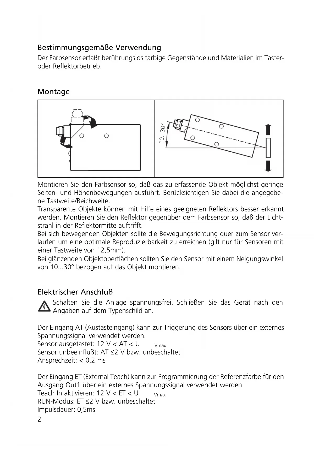 Sachnr. 5306389 - 701235/03 09/2005Bestimmungsgemäße Verwendung Der Farbsensor erfaßt berührungslos farbige Gegenstände und Materialien im Taster- oder Reflektorbetrieb. Montage Montieren Sie den Farbsensor so, daß das zu erfassende Objekt möglichst geringe Seiten- und Höhenbewegungen ausführt. Berücksichtigen Sie dabei die angegebe- ne Tastweite/Reichweite. Transparente Objekte können mit Hilfe eines geeigneten Reflektors besser erkannt werden. Montieren Sie den Reflektor gegenüber dem Farbsensor so, daß der Licht- strahl in der Reflektormitte auftrifft. Bei sich bewegenden Objekten sollte die Bewegungsrichtung quer zum Sensor ver- laufen um eine optimale Reproduzierbarkeit zu erreichen (gilt nur für Sensoren mit einer Tastweite von 12,5mm). Bei glänzenden Objektoberflächen sollten Sie den Sensor mit einem Neigungswinkel von 10...30° bezogen auf das Objekt montieren. Elektrischer Anschluß Schalten Sie die Anlage spannungsfrei. Schließen Sie das Gerät nach den Angaben auf dem Typenschild an. Der Eingang AT (Austasteingang) kann zur Triggerung des Sensors über ein externes Spannungssignal verwendet werden. Sensor ausgetastet: 12 V < AT < U Vmax Sensor unbeeinflußt: AT ≤ 2 V bzw. unbeschaltet Ansprechzeit: < 0,2 ms Der Eingang ET (External Teach) kann zur Programmierung der Referenzfarbe für den Ausgang Out1 über ein externes Spannungssignal verwendet werden. Teach In aktivieren: 12 V < ET < U Vmax RUN-Modus: ET ≤ 2 V bzw. unbeschaltet Impulsdauer: 0,5ms