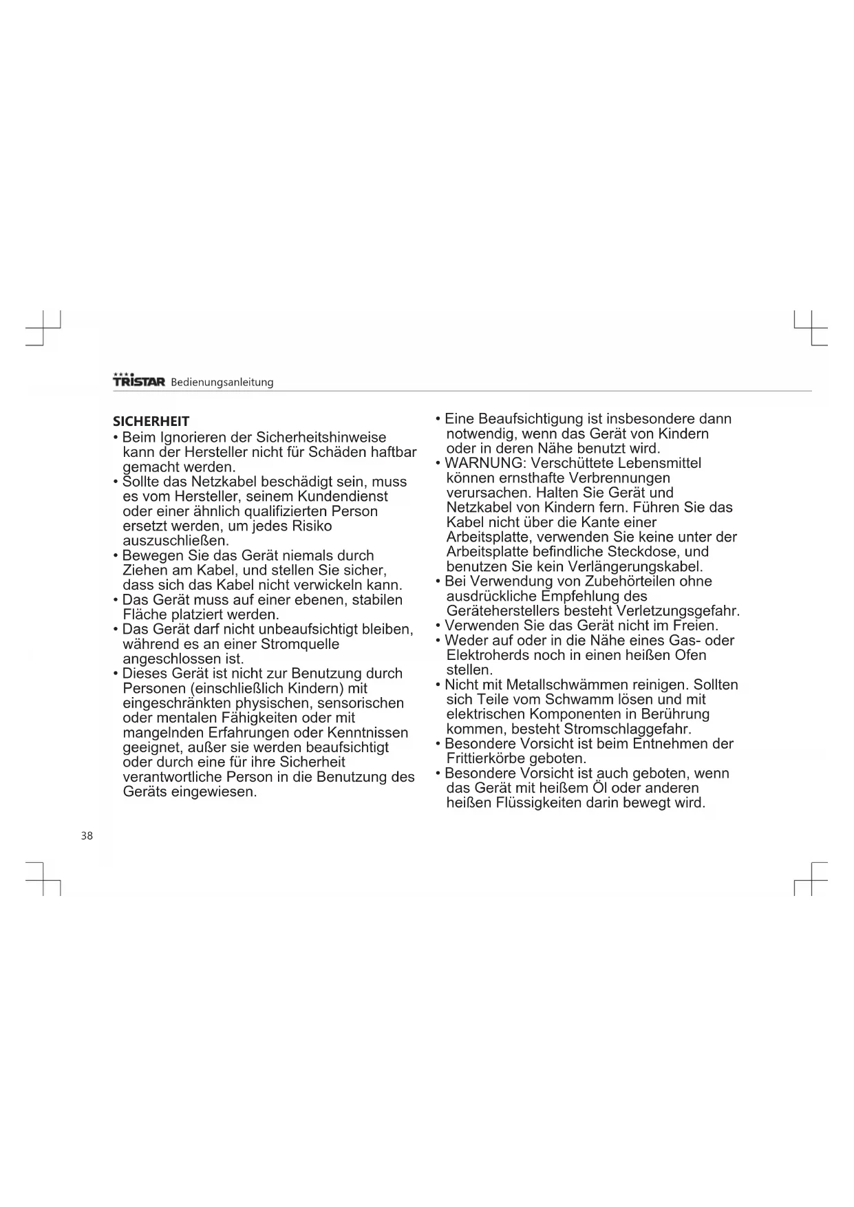 E2 - Kurzschluss beim Temperatursensor. UMWELT Dieses Gerät darf am Ende seiner Lebenszeit nicht im Hausmüll entsorgt werden, sondern muss an einer Sammelstelle für das Recyceln von elektrischen und elektronischen Haushaltsgeräten abgegeben werden. Das Symbol auf dem Gerät, in der Bedienungsanleitung und auf der Verpackung macht Sie auf dieses wichtige Thema aufmerksam. Die in diesem Gerät verwendeten Materialien können recycelt werden. Durch das Recyceln gebrauchter Haushaltsgeräte leisten Sie einen wichtigen Beitrag zum Umweltschutz. Fragen Sie Ihre örtliche Behörde nach Informationen über eine Sammelstelle. Support Sämtliche Informationen und Ersatzteile finden Sie unter service.tristar.eu! DEManual de instrucciones