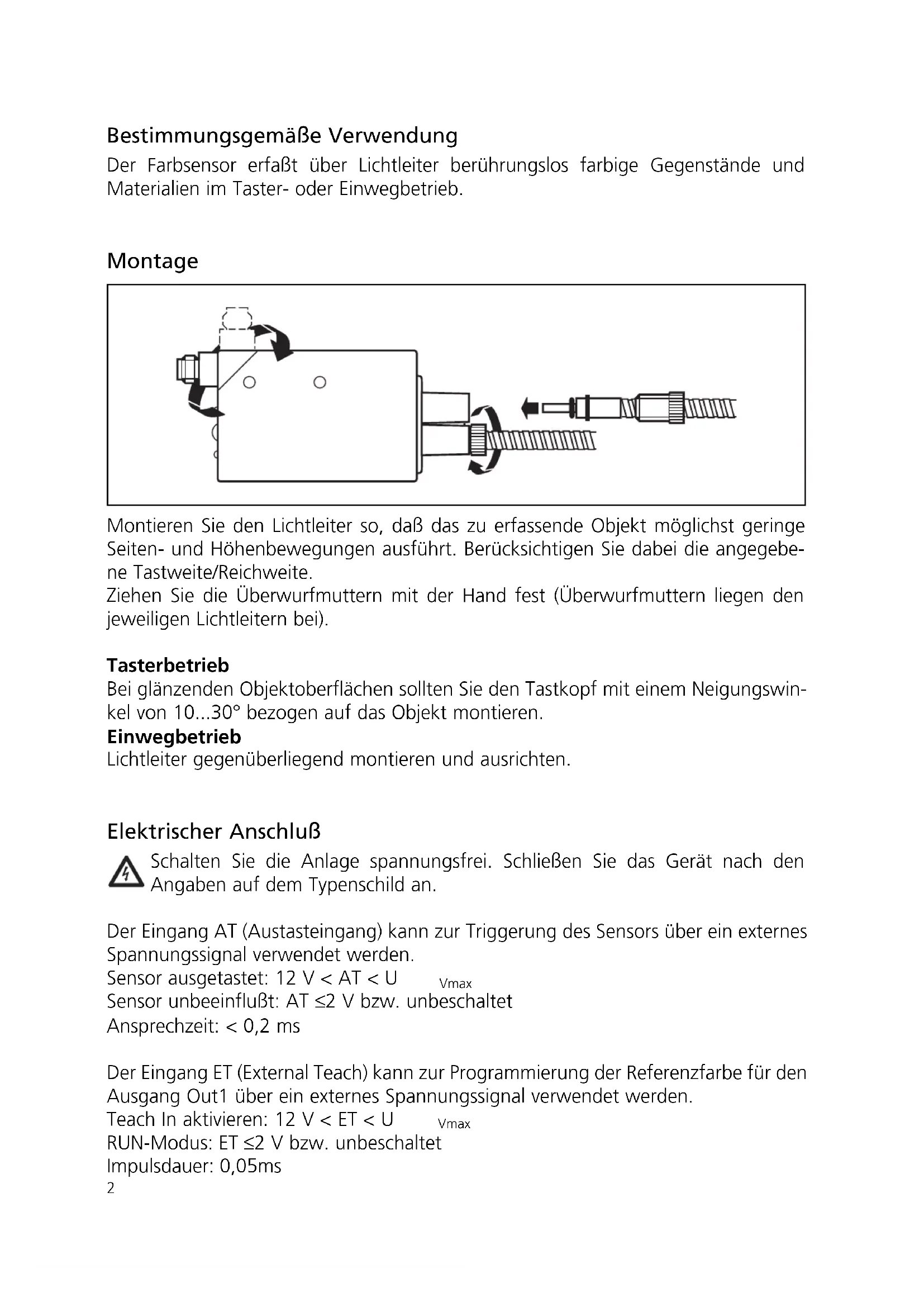 Sachnr. 5308379 - 701360/00 03/1999Bestimmungsgemäße Verwendung Der Farbsensor erfaßt über Lichtleiter berührungslos farbige Gegenstände und Materialien im Taster- oder Einwegbetrieb. Montage Montieren Sie den Lichtleiter so, daß das zu erfassende Objekt möglichst geringe Seiten- und Höhenbewegungen ausführt. Berücksichtigen Sie dabei die angegebe- ne Tastweite/Reichweite. Ziehen Sie die Überwurfmuttern mit der Hand fest (Überwurfmuttern liegen den jeweiligen Lichtleitern bei). Tasterbetrieb Bei glänzenden Objektoberflächen sollten Sie den Tastkopf mit einem Neigungswin- kel von 10...30° bezogen auf das Objekt montieren. Einwegbetrieb Lichtleiter gegenüberliegend montieren und ausrichten. Elektrischer Anschluß Schalten Sie die Anlage spannungsfrei. Schließen Sie das Gerät nach den Angaben auf dem Typenschild an. Der Eingang AT (Austasteingang) kann zur Triggerung des Sensors über ein externes Spannungssignal verwendet werden. Sensor ausgetastet: 12 V < AT < U Vmax Sensor unbeeinflußt: AT ≤ 2 V bzw. unbeschaltet Ansprechzeit: < 0,2 ms Der Eingang ET (External Teach) kann zur Programmierung der Referenzfarbe für den Ausgang Out1 über ein externes Spannungssignal verwendet werden. Teach In aktivieren: 12 V < ET < U Vmax RUN-Modus: ET ≤ 2 V bzw. unbeschaltet Impulsdauer: 0,05ms 2Bedien- und Anzeigeelemente Einstell- und Programmierhinweise Stellen Sie den Drehschalter Farbtoleranz (Tolerance) auf die gewünschte Farbauflö- sung. 1= geringer Toleranzbereich zur Erkennung auch geringer Farb- nuancen 3= Grundeinstellung 5= großer Toleranzbereich zur Erkennung von Farbfamilien bzw. Farbgruppen