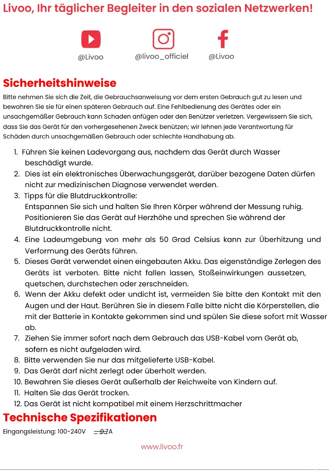 Technische Spezifikationen Eingangsleistung: 100-240V 0.7A @livoo_officiel @Livoo @Livoowww.livoo.fr Akku: 3,7 240mAh Die Akkulaufzeit beträgt 15 Tage im Standby; bis zu 6 Tagen im Betriebszustand. Kompatibel mit Android und iOS. Wasserdichtigkeit nach Schutzart IP67 (geschützt gegen Eintauchen in Wasser bis zu 1 m für 30 Minuten). Kompatible Systeme: Android 8.0 oder IOS 8.0 oder höher; Bluetooth 5.0 oder höher. Warnung: Bei diesem Produkt handelt es sich nicht um ein medizinisches Gerät. Uhren und ihre Anwendungen sollten nicht zur Diagnose, Behandlung oder Vorbeugung von Leiden oder Erkrankungen verwendet werden. Für die Umstellung Ihrer Trainings- und Schlafgewohnheiten, stellen Sie sicher, dass Sie einen Facharzt konsultieren, um ernsthafte Folgewirkungen und Verletzungen zu vermeiden. Wir behalten uns das Recht vor, die in diesem Handbuch beschriebenen Funktionen ohne Vorankündigung zu ändern und zu verbessern sowie kontinuierlich die Bestandteile des Produkts zu aktualisieren. Beziehen Sie sich für alle Inhalte auf das tatsächliche Produkt. Bitte stellen Sie das Tragen des intelligenten Armbands ein, falls eine Hautallergie oder ein unbequemes Tragegefühl auftritt. Verhindern Sie ein zu enges Anliegen des Armbands, um die Luftzirkulation zu gewährleisten. Verwendung des Gerätes Aufladen des Geräts (Abb. 1) Laden Sie das Gerät vor dem Erstgebrauch vollständig auf. Stecken Sie das USB-Magnetkabel in den Ladeanschluss und verbinden Sie den USB-Stecker des Ladekabels mit einem USB-Gerät, das in der Lage ist, Ihr Gerät aufzuladen. Sobald das Gerät erfolgreich verbunden ist, wird auf dem Bildschirm die Ausführung des Ladezustands angezeigt. Ihr Gerät kann während des Ladevorgangs nicht benutzt werden. Achten Sie auf die maximale Ladespannung des Geräts (5 V), um Schäden am Gerät zu vermeiden. Herunterladen und Kopplung (Abb. 2) Halten Sie zum Einschalten Ihrer Smartwatch den seitlichen Knopf für 3 Sekunden gedrückt. Laden Sie die Anwendung JYouPro entweder mit Hilfe des QR-Codes in diesem Dokument herunter oder indem Sie die Anwendung direkt im AppStore oder bei Google Play suchen. Installieren Sie die App. Der QR-Code für die Anwendung ist ebenfalls direkt in der Uhr abrufbar, unter dem Menüpunkt Einstellungen > App herunterladen. Kopplung (Abb. 3-4-5) Nachdem Sie die Anwendung heruntergeladen und auf Ihrem Mobilgerät installiert haben, folgen Sie bitte den Anweisungen der Anwendung, um sie nach Ihren Wünschen und mit Ihren persönlichen Daten einzurichten. Aktivieren Sie Bluetooth auf Ihrem Mobilgerät. Klicken Sie in der Anwendung auf das Menü „Gerät“. Klicken Sie in diesem Menü auf „Über QR-Code verbinden“. Alle verfügbaren Bluetooth-Geräte werden angezeigt. Klicken Sie auf das Gerät TEC619 in dieser Liste. Anmerkung: Bluetooth-Geräte können nur einzeln gekoppelt werden. Stellen Sie sicher, dass Sie das vorherige Bluetooth-Gerät abgetrennt haben, wenn Sie eine Verbindung zu einem neuen Gerät herstellen. Umschalten der Menüschnittstellen des Hauptbildschirms (Abb. 5-6). Sobald Sie die Uhr mit Ihrem Gerät gekoppelt haben, werden die Uhrzeit und das Datum Ihres Handys mit der Uhr synchronisiert (Abb. 6). Um das Hintergrundbild Ihrer Uhr zu ändern, halten Sie den Bildschirm für 4 Sekunden gedrückt. Wählen Sie dann durch Antippen das gewünschte Hintergrundbild aus den verfügbaren Hintergrundbildern aus.www.livoo.fr Hinweis: Über die Anwendung können Sie auch neue Hintergrundbilder auf die Uhr laden, indem Sie die Menüs „Benutzerdefiniertes Hintergrundbild“ oder „Zifferblatt-Einstellungen“ verwenden. Gerät entfernen (Abb. 7) Sie können die Verbindung zwischen der Uhr und Ihrem Gerät jederzeit über die Anwendung aufheben, indem Sie auf „Gerät trennen“ klicken. Menünavigation der Uhr Nach einigen Sekunden ohne Eingabe schaltet sich der Bildschirm der Uhr aus. Sie können ihn erneut einschalten, indem Sie auf den seitlichen Knopf der Uhr drücken. Sobald der Bildschirm eingeschaltet ist, wischen Sie über den Bildschirm, um auf die verschiedenen Schnittstellen zuzugreifen. Durch Drücken des seitlichen Knopfes der Uhr können Sie zum vorherigen Bildschirm zurückkehren.