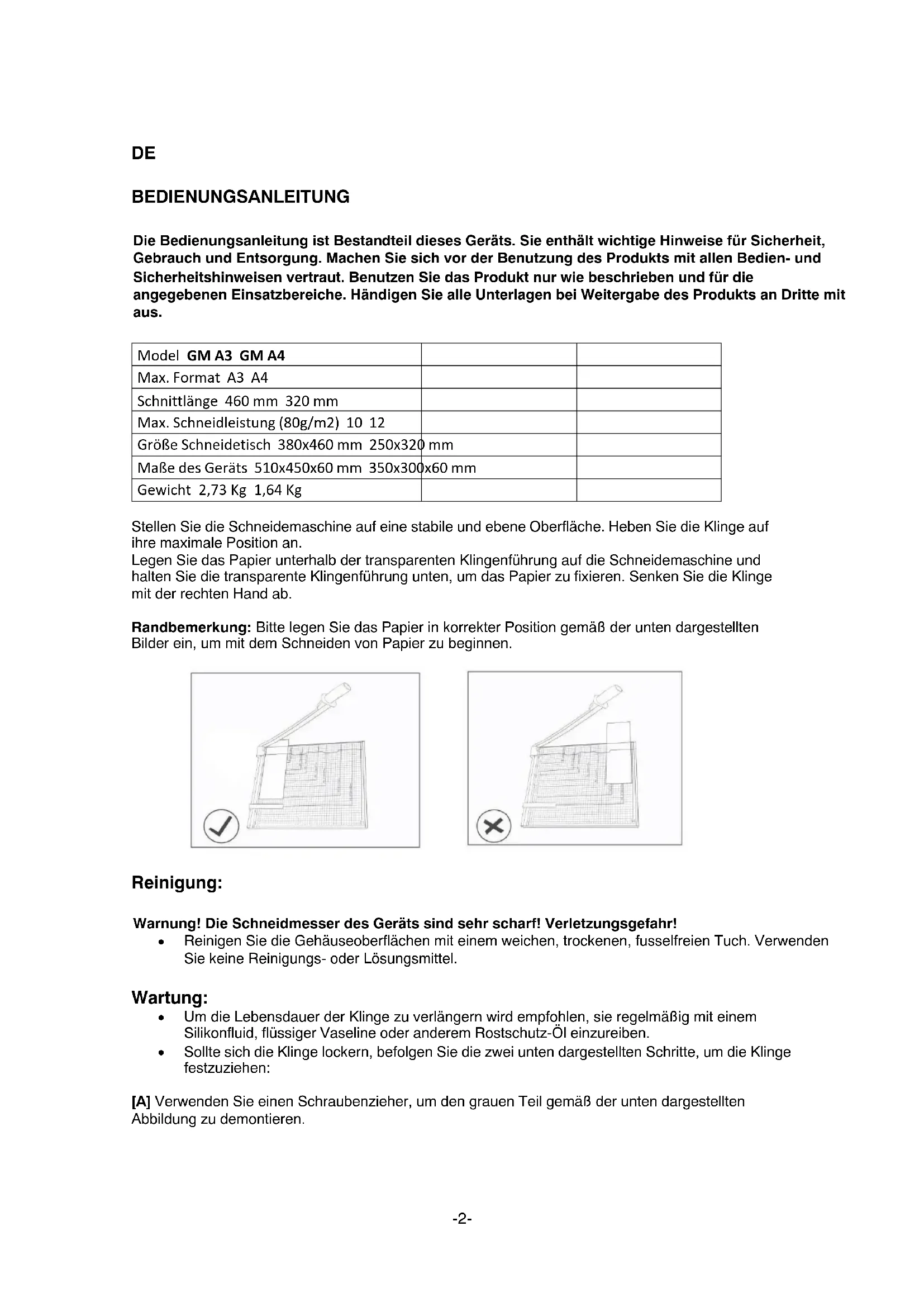 BEDIENUNGSANLEITUNG Die Bedienungsanleitung ist Bestandteil dieses Geräts. Sie enthält wichtige Hinweise für Sicherheit, Gebrauch und Entsorgung. Machen Sie sich vor der Benutzung des Produkts mit allen Bedien- und Sicherheitshinweisen vertraut. Benutzen Sie das Produkt nur wie beschrieben und für die angegebenen Einsatzbereiche. Händigen Sie alle Unterlagen bei Weitergabe des Produkts an Dritte mit aus. Model GM A3 GM A4 Max. Format A3 A4 Schnittlänge 460 mm 320 mm Max. Schneidleistung (80g/m2) 10 12 Größe Schneidetisch 380x460 mm 250x320 mm Maße des Geräts 510x450x60 mm 350x300x60 mm Gewicht 2,73 Kg 1,64 Kg Stellen Sie die Schneidemaschine auf eine stabile und ebene Oberfläche. Heben Sie die Klinge auf ihre maximale Position an. Legen Sie das Papier unterhalb der transparenten Klingenführung auf die Schneidemaschine und halten Sie die transparente Klingenführung unten, um das Papier zu fixieren. Senken Sie die Klinge mit der rechten Hand ab. Randbemerkung: Bitte legen Sie das Papier in korrekter Position gemäß der unten dargestellten Bilder ein, um mit dem Schneiden von Papier zu beginnen.