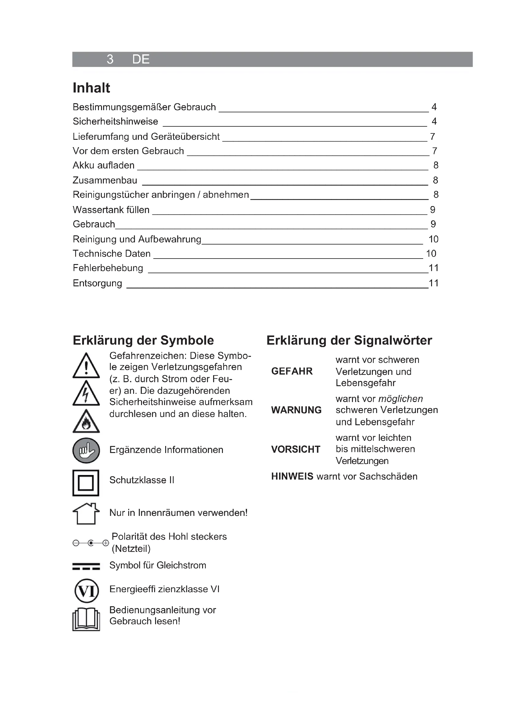 Handleiding vanaf pagina 30 004763 DE Inhalt Bestimmungsgemäßer Gebrauch _______________________________________ 4 Sicherheitshinweise _________________________________________________ 4 Lieferumfang und Geräteübersicht ______________________________________ 7 Vor dem ersten Gebrauch _____________________________________________ 7 Akku aufl aden ______________________________________________________ 8 Zusammenbau _____________________________________________________ 8 Reinigungstücher anbringen / abnehmen _________________________________ 8 Wassertank füllen ___________________________________________________ 9 Gebrauch__________________________________________________________ 9 Reinigung und Auf b ewahrung _________________________________________ 10 Technische Daten __________________________________________________ 10 Fehlerbehebung ____________________________________________________11 Entsorgung ________________________________________________________11 Erklärung der Symbole Gefahrenzeichen: Diese Symbo- le zeigen Verletzungsgefahren (z. B. durch Strom oder Feu- er) an. Die dazugehörenden Sicherheitshinweise aufmerksam durchlesen und an diese halten. Ergänzende Informationen Schutzklasse II Nur in Innenräumen verwenden! Polarität des Hohl steckers (Netzteil) Symbol für Gleichstrom Energieeffi zienzklasse VI Bedienungsanleitung vor Gebrauch lesen! Erklärung der Signalwörter GEFAHR warnt vor schweren Verletzungen und Lebensgefahr WARNUNG warnt vor möglichen schweren Verletzungen und Lebensgefahr VORSICHT warnt vor leichten bis mittelschweren Verletzungen HINWEIS warnt vor SachschädenDE 4 Bestimmungsgemäßer Gebrauch