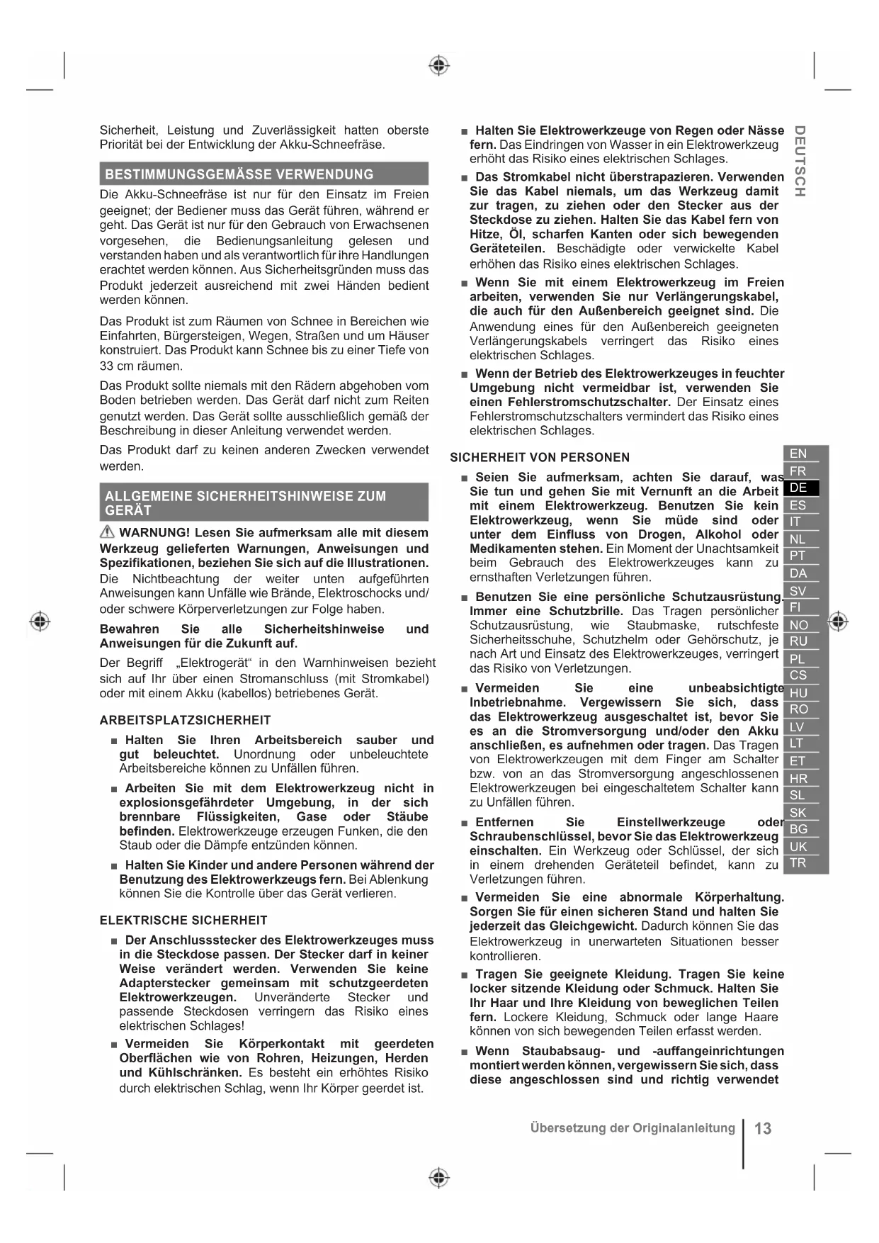 Übersetzung der Originalanleitung■ Gehen Sie umsichtig vor, um ein Ausrutschen oder Stürzen zu verhindern, vor allem wenn die Schneefräse rückwärts bewegt wird. ■ Stellen Sie die Gehäusehöhe des Sammlers so ein, dass dieser Kies oder Schotter passieren kann. ■ Versuchen Sie niemals, Justierungen an der Maschine vorzunehmen, während der Motor läuft. ■ Das Gerät kann Hände und Füße abtrennen und Gegenstände schleudern. Bei Nichtbeachtung der folgenden Sicherheitsanweisungen können ernsthafte Verletzungen die Folge sein. ■ Vergessen Sie nie, dass der Benutzer verantwortlich ist für Unfälle und Gefahren, die an Eigentum Fremder oder an anderen Personen entstehen könnte. VORBEREITUNG ■ Untersuchen Sie den Bereich, in dem die Maschine verwendet werden soll gründlich, und entfernen Sie alle Fußmatten, Bretter, Drähte und andere Gegenstände. ■ Kuppeln Sie alle Kupplungen aus und schalten Sie in den Leerlauf, bevor Sie den Motor starten. ■ Tragen Sie beim Betrieb der Maschine immer ausreichende Winterkleidung und rutschfestes Schuhwerk. Vermeiden Sie weite Kleidung, oder Kleidung mit Schnüren oder Bändern zu tragen; sie können sich in beweglichen Teilen verfangen. ■ Binden Sie lange Haare zurück, so dass diese sich über Schulterhöhe befinden um zu verhindern, dass sie sich in beweglichen Teilen verfangen. ■ Tragen Sie während des Betriebs oder beim Durchführen von Anpassungen oder Reparaturen immer eine Sicherheitsbrille oder einen Augenschutz, um die Augen vor Fremdkörpern zu schützen, die vom Gerät geschleudert werden können. ■ Stellen Sie vor jeder Benutzung sicher, dass alle Bedienelemente und Sicherheitsvorrichtung ordnungsgemäß funktionieren. Bedienen Sie das Gerät nicht, wenn der Ausschalter das Gerät nicht ausschaltet. ■ Prüfen Sie vor jedem Gebrauch, ob das Gehäuse unbeschädigt ist und ob Schutzvorrichtungen und Griffe vorhanden und ordnungsgemäß befestigt sind. VERWENDUNG ■ Benutzen Sie das Produkt nicht, wenn die Gefahr von Blitzschlag besteht. ■ Bewegen Sie Ihre Hände oder Füße nicht in die Nähe von rotierenden Teilen oder unter diese. Halten Sie den Bereich der Auswurföffnung stets frei. Halten Sie sich stets von allen Auswurföffnungen fern. ■ Gehen Sie bei Betrieb in der Nähe von Schotter- oder Kieswegen oder auf diesen mit extremer Vorsicht vor. Seien Sie Wachsam in Bezug auf versteckte Gefährdungen, wenn Sie in die Maschine in der Nähe von öffentlichen Straßen betrieben. ■ Um das Verletzungsrisiko bei Kontakt mit beweglichen Teilen zu verringern, schalten Sie das Gerät immer aus und nehmen Sie den Akkusatz heraus. Stellen Sie sicher, dass alle bewegliche Teile vollständig angehalten sind: ● Überprüfen Sie das Produkt auf Schäden, nachdem ein Fremdkörper getroffen wurde ● bevor Sie das Produkt reinigen oder eine Blockierung entfernen ● bevor Sie das Produkt unbeaufsichtigt zurücklassen ● bevor Sie das Produkt prüfen, reinigen oder daran arbeiten ● wenn das Produkt anfängt, ungewöhnlich zu vibrieren (sofort überprüfen um). Vibrationen sind allgemein ein Warnzeichen, das auf Störungen hinweist. ■ Benutzen Sie das Produkt quer entlang von Hängen, niemals nach oben und unten. Seien Sie extrem vorsichtig, wenn Sie auf Hängen die Fahrtrichtung wechseln. Versuchen Sie nicht, steile Hänge zu räumen. ■ Betreiben Sie das Produkt niemals ohne ordnungsgemäß angebrachte Schutzvorrichtungen, Abdeckungen oder andere Sicherheitssysteme. ■ Lenken Sie den Auswurf niemals in Richtung von Menschen oder in Bereiche, wo Sachschäden die Folge sein könnten Halten Sie unbeteiligte Personen aus dem Arbeitsbereich fern, insbesondere Kinder, aber auch Tiere. ■ Überlasten Sie die Kapazität der Maschine nicht, indem Sie versuchen, den Schnee zu schnell zu räumen. ■ Betreiben Sie die Maschine niemals bei hohen Transportgeschwindigkeiten auf rutschigen Oberflächen. Schauen Sie nach hinten und seien Sie vorsichtig, wenn Sie das Produkt im Rückwärtsgang betreiben. ■ Trennen Sie die Leistung vom Sammler/Laufrad, wenn die Schneefräse transportiert oder nicht verwendet wird. ■ Verwenden Sie ausschließlich original Ersatzteile, Zubehör und Aufsätze des Herstellers. ■ Bedienen Sie das Gerät niemals ohne gute Sicht bzw. ohne gutes Licht. Wahren Sie stets Standsicherheit und halten Sie sich gut an den Handgriffen fest. Gehen Sie stets im Schritttempo; laufen Sie niemals. ■ Stellen Sie das Produkt niemals auf einen Untergrund, außer einen sauberen und harten Untergrund, wenn der Motor läuft. Kies, Sand und anderes Geröll können mit dem Lufteinlass aufgenommen werden und in Richtung Benutzer oder Passanten geschleudert werden, und so schwere Verletzungen verursachen. ■ Betreiben Sie das Produkt niemals in der Nähe von Glasgehäusen, Kraftfahrzeugen, Fenstern oder Türen ohne die richtige Einstellung des Auswurföffnung. ■ Falls das Gerät herunterfällt, hart aufprallt oder abnormal zu vibrieren beginnt, schalten Sie das Gerät unverzüglich aus, untersuchen Sie es auf Schäden oder versuchen Sie, die Ursache für die Vibrationen herauszufinden. Jeder Schaden sollte durch den autorisierten Kundendienst ordnungsgemäß repariert oder ausgetauscht werden. ■ Betreiben Sie das Gerät nur bei Temperaturen zwischen 0 und 40 °C. ■ Bewahren Sie das Gerät bei einer Umgebungstemperatur von 0 bis 40 °C auf.