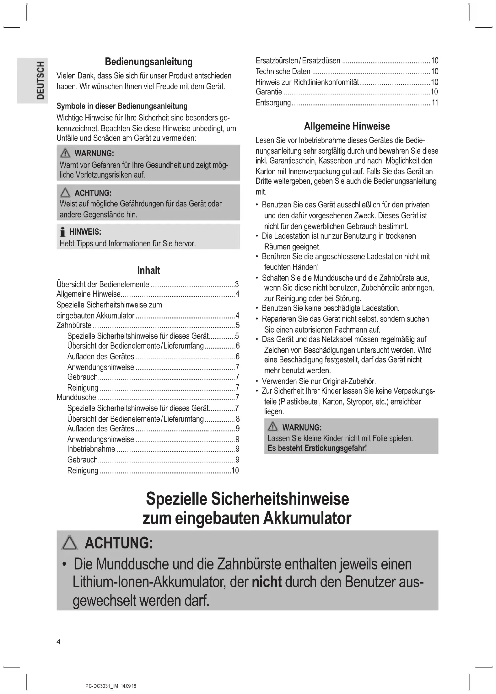 - Die Munddusche und die Zahnbürste enthalten jeweils einen Lithium-Ionen-Akkumulator, der nicht durch den Benutzer aus- gewechselt werden darf.PC-DC3031_IM 14.09.18