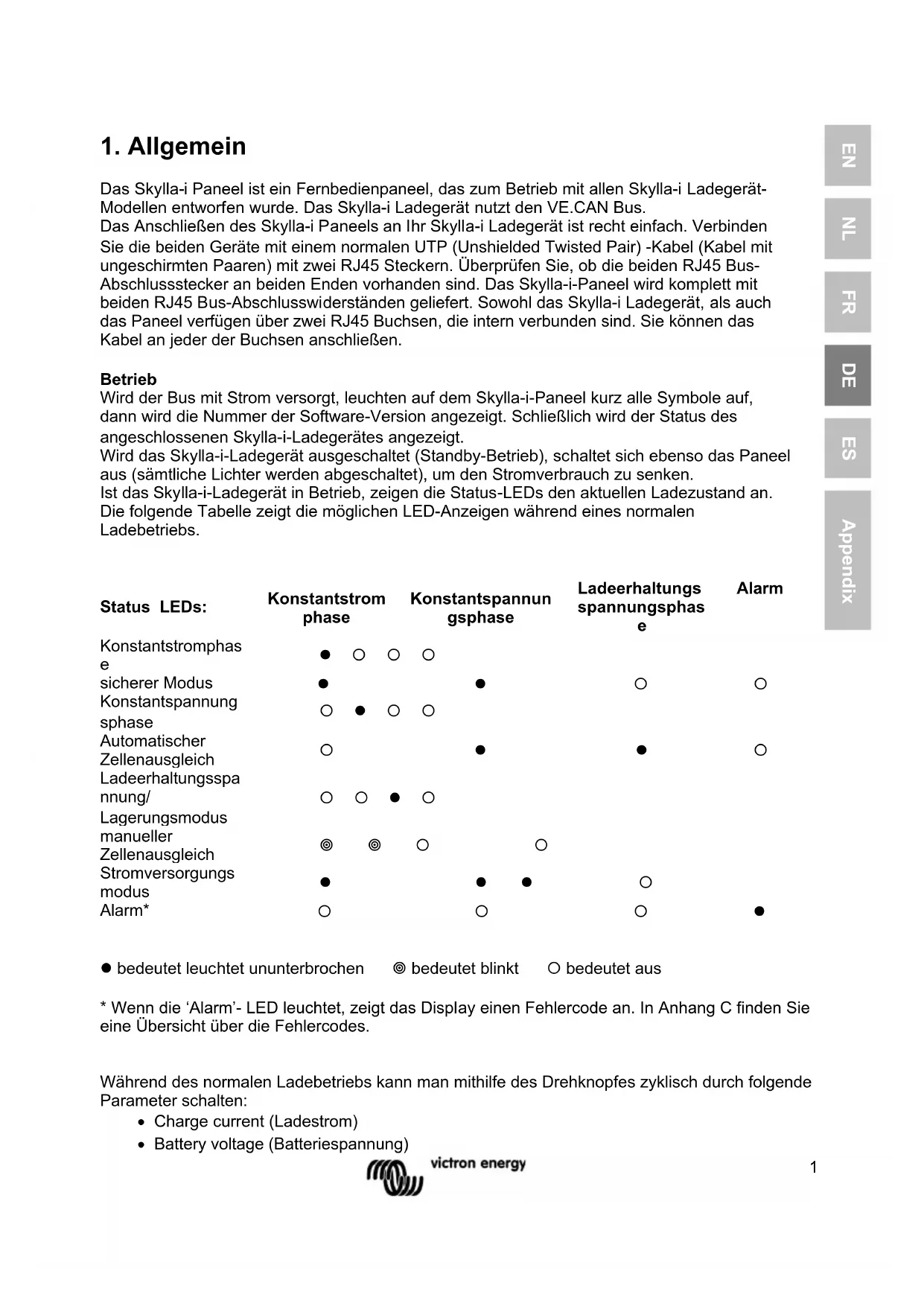Mehrere Skylla-i Steuerpaneele lassen sich mit einem Ladegerät verbinden bzw. mit einem Set synchronisierter und parallelgeschalteter Ladegeräte. Bei einer betriebsbereit gelieferten Installation muss nichts konfiguriert werden. Es ist ausreichend, alle Skylla-i-Geräte und das Bedienpaneel anzuschließen sowie die Abschlusswiderstände3 EN NL FR DE ES Appendix anzubringen. Nur bei Installationen, bei denen mehrere Skylla-i-Geräte sich im selben VE.Can-Netzwerk befinden, während sie unterschiedliche Batteriebänke laden, müssen die Einstellungen geändert werden, damit die Geräte sich nicht synchronisieren. Skylla-i- Ladegeräte und Skylla-i-Bedienpaneel erkennen sich aufgrund der Geräteinstanz. Die Standard-Geräteinstanz ist sowohl für Bedienpaneele als auch für Skylla-i-Geräte Null. Verwenden Sie zur Änderung der Geräteinstanz ein NMEA2000 Netzwerk-Tool, zum Beispiel Actisense oder Maretron. Um die Geräteinstanz beim Skylla-i-Bedien-Paneel manuell auf Null zurückzusetzen, halten Sie den Druckknopf auf der Rückseite vier Sekunden lang gedrückt. Nach diesen vier Sekunden startet das Paneel neu (sämtliche LEDS leuchten kurzzeitig auf). Die Geräteinstanz ist dann auf Null gesetzt. Beachten Sie auch die neuste Version des Skylla-i-Handbuchs. Dieses enthält eine Liste der Fehler- und Warn-Codes. Bitte beachten Sie, dass die genannten Funktionen ab der Firmware v.2.00 sowohl bei dem Skylla-i als auch dem Skylla-i-Bedienpaneel verfügbar sind.1 EN NL FR DE ES Appendix