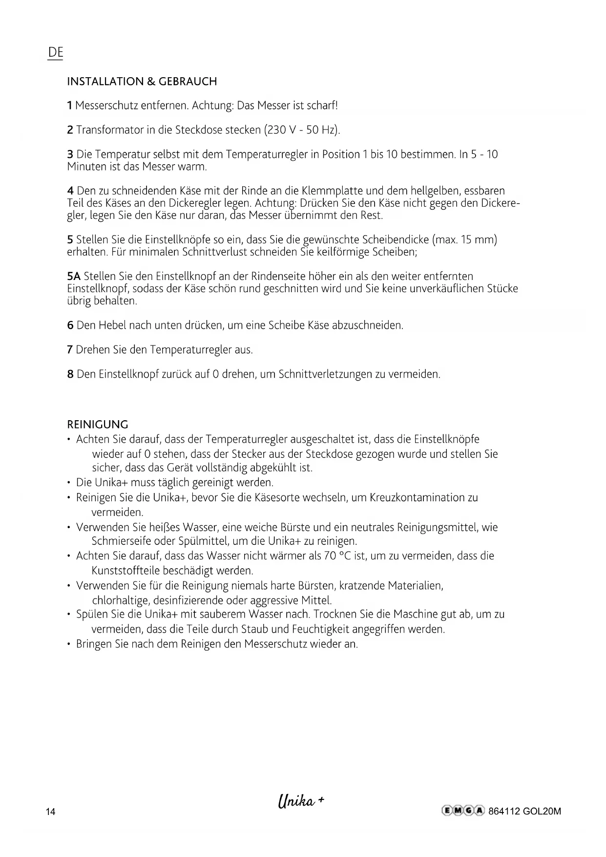 INSTALLATION & GEBRAUCH 1 Messerschutz entfernen. Achtung: Das Messer ist scharf! 2 Transformator in die Steckdose stecken (230 V - 50 Hz). 3 Die Temperatur selbst mit dem Temperaturregler in Position 1 bis 10 bestimmen. In 5 - 10 Minuten ist das Messer warm. 4 Den zu schneidenden Käse mit der Rinde an die Klemmplatte und dem hellgelben, essbaren Teil des Käses an den Dickeregler legen. Achtung: Drücken Sie den Käse nicht gegen den Dickere- gler, legen Sie den Käse nur daran, das Messer übernimmt den Rest. 5 Stellen Sie die Einstellknöpfe so ein, dass Sie die gewünschte Scheibendicke (max. 15 mm) erhalten. Für minimalen Schnittverlust schneiden Sie keilförmige Scheiben; 5A Stellen Sie den Einstellknopf an der Rindenseite höher ein als den weiter entfernten Einstellknopf, sodass der Käse schön rund geschnitten wird und Sie keine unverkäuflichen Stücke übrig behalten. 6 Den Hebel nach unten drücken, um eine Scheibe Käse abzuschneiden. 7 Drehen Sie den Temperaturregler aus. 8 Den Einstellknopf zurück auf 0 drehen, um Schnittverletzungen zu vermeiden. Unika + Unika + REINIGUNG