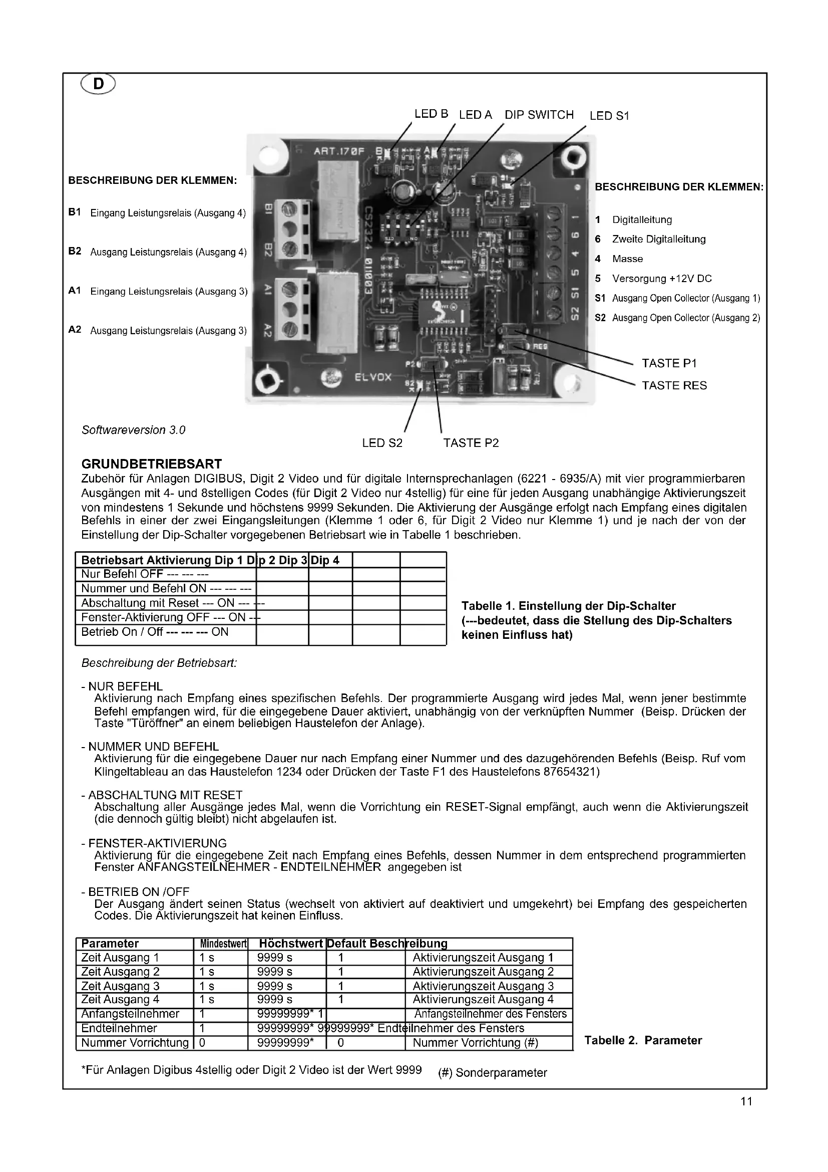 wählen zu können, welcher Ausgang und/oder Parameter programmiert werden soll, wie in Tabelle 3 beschrieben. Jedes Mal, wenn die Taste P2 gedrückt wird, hat man etwa 5 Sekunden Zeit, um die Wahl zu ändern bzw. unverändert zu lassen. Beispiel 1: Aktivierung Ausgang 3 der Vorrichtung 170F für 5 Sekunden nach Empfang des Befehls TÜRÖFFNER von einem Haustelefon eines DIGIBUS-Systems innerhalb des Intervalls 4000 - 6000 von Anfangs- und Endteilnehmer. Die Dip-Schalter wie in Tabelle 1, "Fenster-Aktivierung", beschrieben einstellen. Zunächst müssen die Daten des Anfangs- und des Endteilnehmers der Vorrichtung 170F programmiert werden. Anschließend die Programmierungsprozedur befolgen: alle 4 Leds einschalten und von einer Zahlentastatur einer Türstation zunächst die Zahl 4000, und nach dem Blinken der Leds die Zahl 6000 eingeben. Man kann das Programmiergerät 950B oder den PC benutzen oder die Tasten einer Türstation mit Einzeltasten drücken, die zuvor mit den Softwarezahlen 4000 und 6000 programmiert wurden. Um von einem Digibus-Haustelefon den Befehl Türöffner zu senden, muss dieses aktiv sein, dann mit einem beliebigen Haustelefon der Anlage anrufen. Wenn ein Programmiergerät oder ein PC zur Verfügung stehen, ist dieser Vorgang nicht erforderlich. Nun muss der Ausgang 3 in Programmierung gesetzt werden: die Led A einschalten, die Taste Türöffner des Haustelefons drücken (oder den Befehl senden) und anschließend die Aktivierungszeit eingeben. Dazu nach 5 Sekunden Blinken die Taste P1 drücken oder die Zahl 5 von einer Türstation oder von einem Programmiergerät oder auch vom Haustelefon Nummer 5 der Anlage senden. Das Erlöschen der Led A zeigt das Ende der Programmierungsprozedur an. Beispiel 2: Aktivierung Ausgang 4 der Vorrichtung 170F in Modus ON/OFF nach Empfang des vom Haustelefon Art. 6221 Nummer 4578 erteilten Befehls TREPPENHAUSBELEUCHTUNG . Die Dip-Schalter DIP1 auf ON; DIP2 auf OFF; DIP3 auf OFF; DIP4 auf ON setzen. Den Ausgang 4 der Vorrichtung 170F in Programmierung setzen und nur die Led B einschalten. Nach dem Blinken vom Haustelefon Art. 6221 Nummer 4578 die Taste der Funktion "Treppenhausbeleuchtung" drücken . Die Aktivierungszeit hat in diesem Fall keinen Einfluss, die Vorrichtung wartet aber trotzdem weiterhin auf die Zusendung der Zahl der Aktivierungssekunden. Dann die Taste P1 der Vorrichtung 170F drücken, oder einen Ruf von der Türstation durchführen, oder eine Funktionstaste eines Haustelefons drücken. Wenn die Led B erlischt, ist die Programmierung abgeschlossen. Bei jedem Druck auf die Taste "Treppenhausbeleuchtung" des Haustelefons Nummer 4578 ändert der Ausgang 4 seinen Status (d.h. wechselt von aktiviert auf deaktiviert und umgekehrt) Zu programmierender Parameter aufleuchtende Leds Code und Aktivierungszeit Ausgang 1 S1 Code und Aktivierungszeit Ausgang 2 S2 Code und Aktivierungszeit Ausgang 3 A Code und Aktivierungszeit Ausgang 4 B Anfangsteilnehmer und Endteilnehmer S1, S2, A, B Nummer Vorrichtung S1, S2 Tabelle 3. Aufleuchten der Leds während der Programmierung