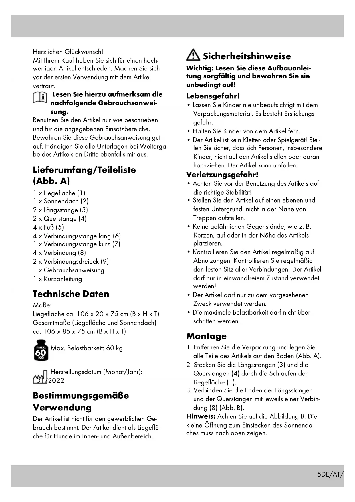 Max. Belastbarkeit: 60 kg Herstellungsdatum (Monat/Jahr): 01/2022 Bestimmungsgemäße Verwendung Der Artikel ist nicht für den gewerblichen Ge- brauch bestimmt. Der Artikel dient als Liegeflä- che für Hunde im Innen- und Außenbereich. Sicherheitshinweise Wichtig: Lesen Sie diese Aufbauanlei- tung sorgfältig und bewahren Sie sie unbedingt auf! Lebensgefahr!