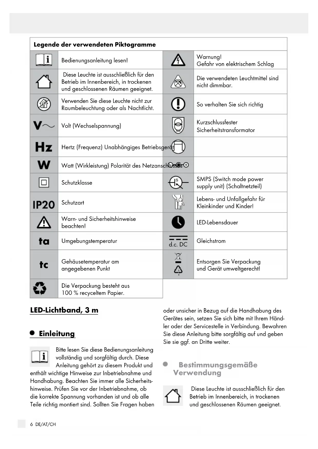 KINDER UND KINDER! Lassen Sie Kinder niemals unbeaufsichtigt mit dem Verpackungsmaterial. Es besteht Erstickungs- gefahr durch Verpackungsmaterial. Kinder un- terschätzen häufig die Gefahren. Dieses Gerät kann von Kindern ab 8 Jahren und darüber sowie von Personen mit verringerten physischen, sensorischen oder mentalen Fähig- keiten oder Mangel an Erfahrung und Wissen benutzt werden, wenn sie beaufsichtigt oder bezüglich des sicheren Gebrauchs des Gerätes unterwiesen wurden und die daraus resultieren- den Gefahren verstehen. Kinder dürfen nicht mit dem Gerät spielen. Reinigung und Benutzer- wartung dürfen nicht von Kindern ohne Beauf- sichtigung durchgeführt werden. Einleitung / SicherheitEinleitung8 DE/AT/CH Vermeiden Sie Lebensgefahr durch elektrischen Schlag Überprüfen Sie vor jedem Gebrauch das LED- Band auf etwaige Beschädigungen. Benutzen Sie Ihr LED-Band niemals, wenn Sie irgendwelche Beschädigungen feststellen. Eine beschädigte Netzanschlussleitung bedeutet Lebensgefahr durch elektrischen Schlag. Wenden Sie sich bei Beschädigungen, Reparaturen oder anderen Problemen an die Servicestelle oder eine Elektrofachkraft. Die Netzanschlussleitung dieses Gerätes kann nicht ersetzt werden. Bei Beschädigung der Leitung ist das Gerät zu ver- schrotten. Das Gerät enthält keine Teile, welche vom Verbraucher gewartet werden können. Vergewissern Sie sich vor der Benutzung, dass die vorhandene Netzspannung mit der benötigten Betriebsspannung des Artikels übereinstimmt (siehe „Technische Daten“). Vermeiden Sie unbedingt die Berührung der netzspannungsführenden Leitungen und Kon- takte mit Wasser oder anderen Flüssigkeiten. Öffnen Sie niemals eines der elektrischen Betriebs- mittel oder stecken irgendwelche Gegenstände in dieselben. Derartige Eingriffe bedeuten Lebens- gefahr durch elektrischen Schlag. Montieren Sie die Leuchte nicht auf feuchten oder leitenden Untergründen. Dieses LED-Band darf mit einem anderen LED- Band nicht elektrisch verbunden werden. Die Lichtquelle dieser Leuchte ist nicht ersetzbar. Wenn die Leuchte ihr Lebensdauerende erreicht hat, ersetzen Sie die gesamte Leuchte. Vermeiden Sie ein übermäßiges Knicken des LED-Bandes. Schützen Sie das Produkt vor scharfen Kanten, mechanischen Belastungen und heißen Ober- flächen. Nicht mit scharfen Klammern oder Nägeln befestigen. Ziehen Sie immer den Netzstecker vor der Montage, Demontage oder Reinigung aus der Steckdose. Fassen Sie niemals den Netzstecker oder das LED-Band mit nassen Händen an. Verwenden Sie ausschließlich die mitgelieferten Einzelteile, ansonsten erlöschen alle Gewähr- leistungsansprüche. Das LED-Band darf nicht mit dem Stromnetz verbunden werden, während es in der Verpa- ckung ist. Legen Sie den Artikel vollständig aus, bevor Sie ihn an das Stromnetz anschließen. Den Lichtschlauch nicht öffnen oder aufschnei- den / aufschlitzen. Benutzen Sie das LED-Band nicht, wenn es mit Gegenständen abgedeckt oder in eine Ober- fläche eingelegt ist. Vermeiden Sie Brand- und Verletzungsgefahr Dieser Artikel enthält keine Teile, die vom Verbraucher gewartet werden können. Die LEDs können nicht ausgetauscht werden. Sollten die LEDs am Ende ihrer Lebensdauer ausfallen, muss der ganze Artikel ersetzt werden. Die verbauten LEDs sind nicht geeig- net für Dimmer und elektronische Schalter. Bei Betrieb nicht aus kurzem Abstand in die LEDs schauen. Die LEDs nicht mit einem optischen Instrument (z. B. Lupe) betrachten. So verhalten Sie sich richtig Lassen Sie das LED-Band oder Verpackungsma- terial nicht achtlos liegen. Es besteht Erstickungs- gefahr durch Verpackungsmaterial und Lebensgefahr durch Strangulation. Montieren Sie das LED-Band so, dass es vor Verschmutzung und zu starker Erwärmung ge- schützt ist. Seien Sie stets aufmerksam! Achten Sie immer darauf was Sie tun und gehen Sie stets mit Vernunft vor. Verwenden Sie das LED-Band in keinem Fall, wenn Sie unkonzentriert sind oder sich unwohl fühlen. Machen Sie sich vor der Verwendung mit allen Anweisungen und Abbildungen in dieser Anlei- tung sowie mit dem LED-Band selbst vertraut. Sicherheit Sicherheit / Inbetriebnahme / LED-Band montieren / Wartung und Reinigung9 DE/AT/CH Um das LED-Band vollständig von der Strom- versorgung zu trennen, muss der Netzadapter aus der Steckdose gezogen werden. Inbetriebnahme Entfernen Sie alle Verpackungsmaterialien vor dem ersten Gebrauch. Das LED-Band darf nicht mit dem Versorgungs- netz verbunden werden, während es in der Verpackung ist. LED-Band kürzen / verbinden Sie haben die Möglichkeit, das LED-Band individuell zu kürzen und zu verbinden. LEBENSGEFAHR DURCH ELEKTRISCHEN SCHLAG! Trennen Sie die Leuchte vor sämtlichen Arbeiten am LED-Band