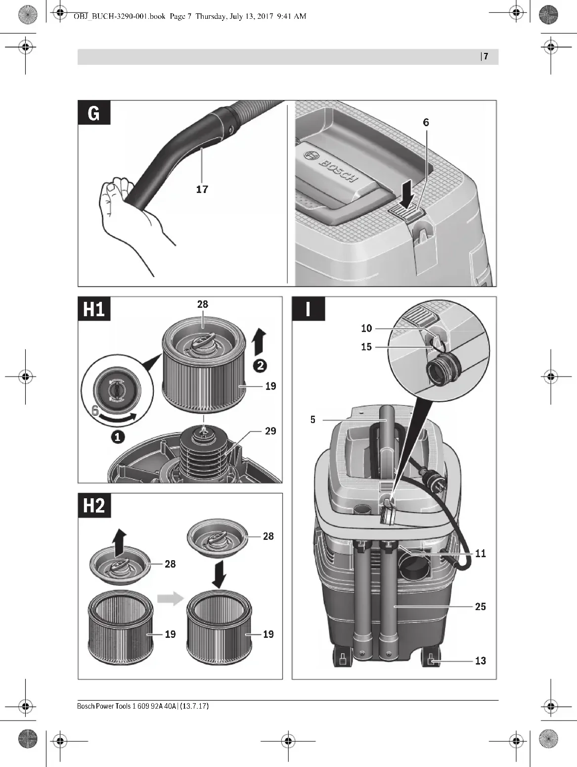 - Angabe der zulässigen Anschlussleistung des angeschlossenen Elekt-rowerkzeugs (länderspezifisch) OBJ_BUCH-3290-001.book Page 10 Thursday, July 13, 2017 9:41 AMDeutsch | 11 Bosch Power Tools 1 609 92A 40A | (13.7.17) Saugschlauch montieren Saugfunktion (siehe Bild B1) – Stecken Sie den Saugschlauch 17 in die Schlauchaufnah- me 2 und drehen Sie ihn im Uhrzeigersinn bis zum An- schlag. Hinweis: Beim Saugen entsteht durch die Reibung des Staubs im Saugschlauch und -zubehör eine elektrostatische Aufladung, die der Benutzer in Form von statischer Entladung spüren kann (abhängig von Umwelteinflüssen und körperli- chem Empfinden). Generell empfiehlt Bosch einen antistatischen Saugschlauch (Zubehör) beim Saugen von Feinstäuben und trockenen Ma- terialien zu verwenden. Ausblasfunktion (siehe Bild B2) Der Sauger verfügt über eine Ausblasfunktion. Blasen Sie die Abluft nicht in den freien Raum. Verwenden Sie die Ausblasfunktion nur mit einem sauberen Schlauch. Stäube können gesundheitsgefährdend sein. – Schalten Sie den Sauger für mindestens 5 s ein (GAS 15: Ein-/Ausschalter 5 auf „On“; GAS 15 PS: Betriebsarten- Wahlschalter 4 auf das Symbol „Saugen“), um den Saug- schlauch 17 von abgelagerten Stäuben zu säubern. – Drehen Sie den Saugschlauch 17 gegen den Uhrzeigersinn bis zum Anschlag und ziehen Sie ihn aus der Schlauchauf- nahme 2. – Stecken Sie den Saugschlauch 17 in die Schlauchaufnah- me 13 und drehen Sie ihn im Uhrzeigersinn bis zum An- schlag. Plastiksack oder Staubbeutel einsetzen/entneh- men (Trockensaugen) (siehe Bilder C1–C4) Zum Trockensaugen können Sie einen Plastiksack 19 oder ei- nen Staubbeutel (Zubehör) in den Sauger einsetzen. Dadurch wird die Entsorgung des Staubes erleichtert. Plastiksack einsetzen – Öffnen Sie die Verschlüsse 9 und nehmen Sie das Sauger- oberteil 8 ab. – Legen Sie den Plastiksack 19 mit der Einfüllöffnung nach vorne in den Behälter 1 ein. Befestigen Sie den Plastiksack unter der Ansaugöffnung mit Hilfe der Klammern 28. – Stellen Sie sicher, dass der Plastiksack 19 komplett an den Innenwänden des Behälters 1 anliegt. – Schlagen Sie den Rest des Plastiksacks 19 über den Rand des Behälters 1. – Setzen Sie das Saugeroberteil 8 wieder auf und schließen Sie die Verschlüsse 9. Plastiksack entnehmen und verschließen – Öffnen Sie die Verschlüsse 9 und nehmen Sie das Sauger- oberteil 8 ab. – Ziehen Sie den Rand des vollen Plastiksacks 19 nach hin- ten aus den Klammern 28. – Nehmen Sie den Plastiksack 19 vorsichtig, ohne ihn zu be- schädigen, aus dem Sauger. Achten Sie dabei darauf, dass der Plastiksack nicht an der Ansaugöffnung oder an anderen scharfen Gegenständen streift. Staubbeutel wechseln/einsetzen (Zubehör) – Öffnen Sie die Verschlüsse 9 und nehmen Sie das Sauger- oberteil 8 ab. – Ziehen Sie den vollen Staubbeutel 18 vom Anschluss- flansch nach hinten ab. Verschließen Sie die Öffnung des Staubbeutels durch Umklappen des Deckels. Nehmen Sie den verschlossenen Staubbeutel aus dem Sauger. – Stülpen Sie den neuen Staubbeutel über den Anschluss- flansch des Saugers. Stellen Sie sicher, dass der Staub- beutel in seiner vollen Länge an der Innenwand des Behäl- ters 1 anliegt. – Setzen Sie das Saugeroberteil 8 wieder auf und schließen Sie die Verschlüsse 9. Gummilippe einsetzen (Nasssaugen) (siehe Bild D) – Heben Sie die Bürstenstreifen 24 mit einem geeigneten Werkzeug aus der Bodendüse 25. – Setzen Sie die Gummilippen 23 in die Bodendüse 25. Hinweis: Die strukturierte Seite der Gummilippen muss nach außen zeigen. Nassfilter einsetzen (Nasssaugen) (siehe Bilder E1–E2) – Öffnen Sie die Verschlüsse 9 und nehmen Sie das Sauger- oberteil 8 ab. – Drehen Sie den Filterhalter 29 bis zum Anschlag in Dreh- richtung „ “ und entnehmen Sie den Filterhalter zuam- men mit dem Filter 20 aus dem Behälter 1. – Stülpen Sie den Nassfilter 21 über den Filterkorb 30. – Setzen Sie das Saugeroberteil 8 wieder auf und schließen Sie die Verschlüsse 9. Betrieb Inbetriebnahme Beachten Sie die Netzspannung! Die Spannung der Stromquelle muss mit den Angaben auf dem Typenschild des Saugers übereinstimmen. Bitte informieren Sie sich über die gültigen Regelun- gen/Gesetze bezüglich des Umgangs mit gesundheits- gefährdenden Stäuben in Ihrem Land. Der Sauger darf grundsätzlich nicht in explosionsgefährdeten Räumen eingesetzt werden. Um Energie zu sparen, schalten Sie den Sauger nur ein, wenn Sie ihn benutzen. Um eine optimale Saugleistung zu gewährleisten, müssen Sie den Saugschlauch 17 immer komplett vom Saugeroberteil 8 abwickeln. Trockensaugen Aufsaugen von abgelagerten Stäuben GAS 15: –Um den Sauger einzuschalten, stellen Sie den Ein-/Ausschalter 5 auf „On“. OBJ_BUCH-3290-001.book Page 11 Thursday, July 13, 2017 9:41 AM12 | Deutsch 1 609 92A 40A | (13.7.17) Bosch Power Tools –Um den Sauger auszuschalten, stellen Sie den Ein-/Ausschalter 5 auf „Off“. GAS 15 PS: –Um den Sauger einzuschalten, stellen Sie den Be- triebsarten-Wahlschalter 4 auf das Symbol „Sau- gen“. –Um den Sauger auszuschalten, stellen Sie den Betriebsarten-Wahlschalter 4 auf das Symbol „Ausschalten“. Absaugen der anfallenden Stäube von laufenden Elektrowerkzeugen (nur für GAS 15 PS) (siehe Bild F) Es muss eine ausreichende Luftwechselrate (L) in dem Raum vorhanden sein, wenn die Abluft in den Raum zu- rückgeht. Beachten Sie entsprechende nationale Vor- schriften. In den Sauger ist eine Schutzkontakt-Steckdose 3 integriert. Sie können dort ein externes Elektrowerkzeug anschließen. Beachten Sie die maximal zulässige Anschlussleistung des an- geschlossenen Elektrowerkzeugs. – Montieren Sie die Werkzeugmuffe 15 (siehe „Монтаж муфти для електроінструментів“, Seite 122). – Stecken Sie die Werkzeugmuffe14 in den Absaugstutzen des Elektrowerkzeugs. Hinweis: Beim Arbeiten mit Elektrowerkzeugen, deren Luft- zufuhr in den Saugschlauch gering ist (