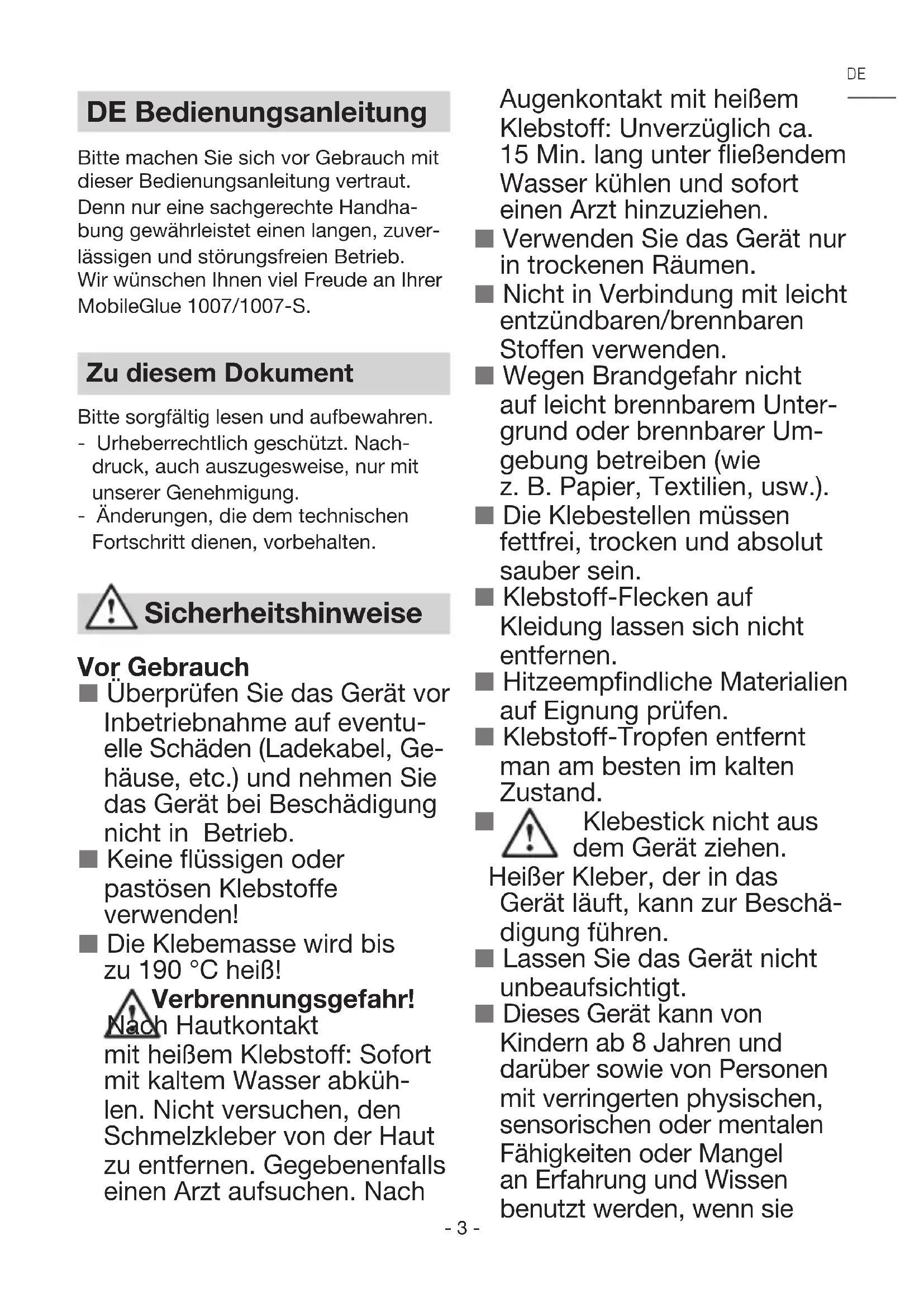 DE Bedienungsanleitung Bitte machen Sie sich vor Gebrauch mit dieser Bedienungsanleitung vertraut. Denn nur eine sachgerechte Handha- bung gewährleistet einen langen, zuver- lässigen und störungsfreien Betrieb. Wir wünschen Ihnen viel Freude an Ihrer MobileGlue 1007/1007-S. Zu diesem Dokument Bitte sorgfältig lesen und aufbewahren. - Urheberrechtlich geschützt. Nach- druck, auch auszugesweise, nur mit unserer Genehmigung. - Änderungen, die dem technischen Fortschritt dienen, vorbehalten. Vor Gebrauch Überprüfen Sie das Gerät vor Inbetriebnahme auf eventu- elle Schäden (Ladekabel, Ge- häuse, etc.) und nehmen Sie das Gerät bei Beschädigung nicht in Betrieb. Keine flüssigen oder pastösen Klebstoffe verwenden! Die Klebemasse wird bis zu 190 °C heiß! Verbrennungsgefahr! Nach Hautkontakt mit heißem Klebstoff: Sofort mit kaltem Wasser abküh- len. Nicht versuchen, den Schmelzkleber von der Haut zu entfernen. Gegebenenfalls einen Arzt aufsuchen. Nach Sicherheitshinweise Augenkontakt mit heißem Klebstoff: Unverzüglich ca. 15 Min. lang unter fließendem Wasser kühlen und sofort einen Arzt hinzuziehen. Verwenden Sie das Gerät nur in trockenen Räumen. Nicht in Verbindung mit leicht entzündbaren/brennbaren Stoffen verwenden. Wegen Brandgefahr nicht auf leicht brennbarem Unter- grund oder brennbarer Um- gebung betreiben (wie z. B. Papier, Textilien, usw.). Die Klebestellen müssen fettfrei, trocken und absolut sauber sein. Klebstoff-Flecken auf Kleidung lassen sich nicht entfernen. Hitzeempfindliche Materialien auf Eignung prüfen. Klebstoff-Tropfen entfernt man am besten im kalten Zustand. Klebestick nicht aus dem Gerät ziehen. Heißer Kleber, der in das Gerät läuft, kann zur Beschä- digung führen. Lassen Sie das Gerät nicht unbeaufsichtigt. Dieses Gerät kann von Kindern ab 8Jahren und darüber sowie von Personen mit verringerten physischen, sensorischen oder mentalen Fähigkeiten oder Mangel an Erfahrung und Wissen benutzt werden, wenn sie DE- 4 - beaufsichtigt oder bezüglich des sicheren Gebrauchs des Gerätes unterwiesen wurden und die daraus resultierenden Gefahren verstehen. Kinder dürfen nicht mit dem Gerät spielen. Reinigung und Benutzer-Wartung dürfen nicht von Kindern ohne Beaufsichtigung durchgeführt werden. Eine einwandfreie Funktion wird nur beim Einsatz von original STEINEL-Sticks gewährleistet. USB-Ladekabel Halten Sie das Ladekabel sauber. Durch Verschmut- zung besteht die Gefahr eines elektrischen Schlages. Lagern Sie das Gerät im Temperaturbereich von 0 °C bis 35 °C. Laden Sie das Gerät nur mit dem mitgelieferten USB-Ladekabel (vom Typ 15.3841) auf. Laden Sie keine Fremd-Akkus. Anson- sten besteht Brand- und Explosionsgefahr. Akku Öffnen Sie das Gerät und den Akku nicht. Es besteht die Gefahr eines Kurzschlus- ses. Der Akku darf nicht ent- nommen werden. Wenden Sie sich bei Proble- men an Ihre Verkaufsstelle. Bestimmungsgemäßer Gebrauch Dieses Elektrowerkzeug ist nur zum lösungsmittelfreien Kleben üblicher Bastelmaterialien und Modellbauteilen im Haushalt bestimmt. Der Lithium-Ionen-Akku kann jederzeit aufgeladen werden, ohne die Lebensdauer zu verkürzen. Eine Unterbre- chung des Ladevorganges schädigt den Akku nicht. Das Gerät bei längerem Nichtgebrauch mit gelade- nem Akku weglegen. Das verlängert die Lebensdauer des Lithium-Ionen-Akkus. Bei unsachgemäßem Ge- brauch und bei Beschädi- gung des Akkus können Dämpfe austreten. Suchen Sie bei Beschwerden einen Arzt auf und führen Sie Frischluft zu. Die Dämpfe können die Atemwege reizen. Einsatzbereich Akku-Heißklebestift mit Lithium-Ionen Akku. Der ideale Alleskleber beim Repa- rieren, Dekorieren und Basteln. Geeignet für: Papier, Pappe, Kork, Holz, Leder, Textilien, Plastik, Keramik, Ka- cheln...- 5 - Gerätebeschreibung USB-Ladekabel LED Anzeige Buchse für Ladekabel Taster EIN/AUS Vorschub-Abzug Klebestick Funktion und Handhabung ■ Bei Erstinbetriebnahme vollständig (2-3 Std.) laden, um die Lebensdauer des Akkus zu verlängern. (s. Laden/ Betrieb) ■ Klebestick hinten in den Heizkanal stecken. ■ Bei Erstbetriebnahme ist eine mehr- malige Betätigung des Vorschubs notwendig, um die Heizkammer mit Kleber zu füllen. Gegebenenfalls ist dabei ein kurzes Nachdrücken des Klebesticks notwendig. ■ Um das Gerät nicht unbeabsichtigt einzuschalten, muss der Taster für ca. 2 Sek. gedrückt werden. Grüne LED blinkt für 15 Sek. ■ Vorschub betätigen und den Kleber einseitig auftragen. ■ Die zu klebenden Materialien kräftig anpressen und eventuell korrigieren. ■ Bereits nach kürzester Zeit (ca. 2 Minuten) ist die Klebestelle voll belastbar! ■ Punktförmige Klebung empfiehlt sich bei großflächigen, langen Werkstücken. ■ Auch Styropor lässt sich problemlos verarbeiten. Dabei ist lediglich zu be- rücksichtigen, dass der heiße Kleber auf den Untergrund und nicht etwa auf das Styropor aufgetragen wird. ■ Zum Verkleben von Textilien o. ä. Materialien wird ein Auftragen des Heißklebers in „Schlangenlinien“ empfohlen. ■ Gerät nach Gebrauch abkühlen lassen. Laden / Betrieb Der Akku der MobileGlue 1007/1007-S wird teilgeladen ausgeliefert. Den Akku vor dem ersten Einsatz vollständig auf- laden (ca. 2-3 Stunden), damit die volle Leistung gewährleistet ist. Während des Ladevorgangs kann die MobileGlue 1007/1007-S nicht genutzt werden. Eine Unterbrechung des Ladevorgangs schädigt den Akku nicht. Er kann jeder- zeit aufgeladen werden, ohne die Lebensdauer des Akkus zu verkürzen. Durch die "Elektronic Cell Protection (ECP)" ist der Akku gegen Tiefenent- ladung geschützt. Ist der Akku entladen, wird die MobileGlue 1007/1007-S durch eine Schutzschaltung abgeschaltet und der Klebstoff nicht mehr erhitzt. Ladevorgang USB-Ladegerät Taster LED rot LED grün AN/AUS Ladevorgang Akku Gerät zeitlich begrenzt betriebsbereit Ladevorgang beendet, Akku vollständig geladen DE- 6 - Betrieb/Kleben Taster LED rot LED grün AN Einschalten. Taster für ca. 2 Sek. drück