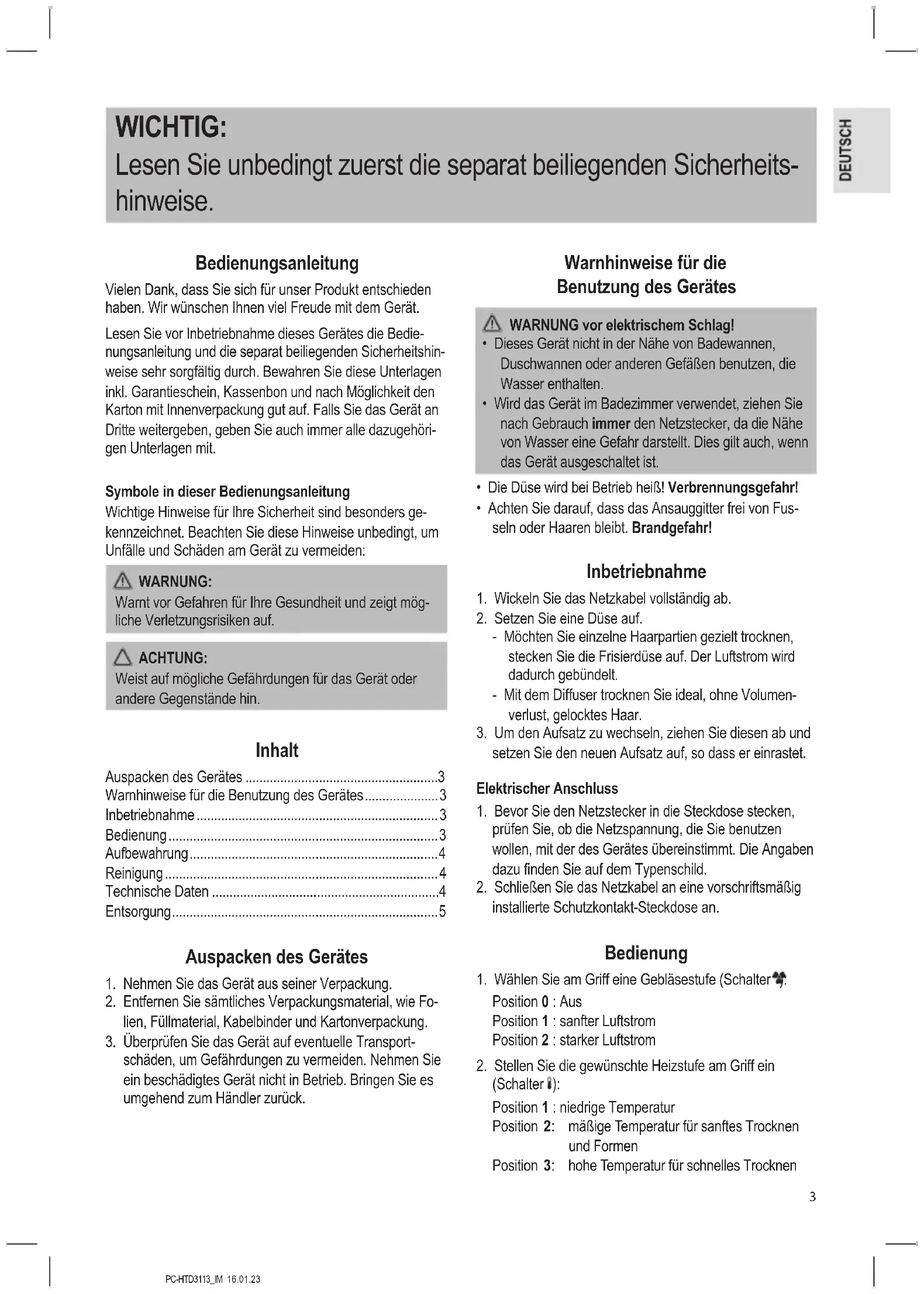 Position 1 : niedrige Temperatur Position 2 : mäßige Temperatur für sanftes Trocknen und Formen Position 3 : hohe Temperatur für schnelles Trocknen4 PC-HTD3113_IM 16.01.23 COOL (Kaltluft) Mit dieser Taste unterbrechen Sie den Heizvorgang. Halten Sie die Taste entsprechend der gewünschten Inter- valllänge in dieser Position fest. Beim Loslassen der Taste geht diese automatisch wieder in die Ausgangsstellung zurück. Ionisierungsfunktion – Reduzierung von elektrisch aufgeladenen Haaren Zusätzlich ist das Gerät mit einem Ionisator ausgestattet, der beim Einschalten Negativ-Ionen mit der ausströmenden Luft abgibt. Dieses Verfahren unterstützt die schonende Trocknung der Haare, gleichzeitig fördert es die Verbesse- rung der Haarstruktur, das Erlangen von mehr Volumen, einen seidigen Glanz und reduziert zusätzlich die statische Auadung der Haare. Besonders schonend ist dieses Verfahren für strapaziertes Haar.