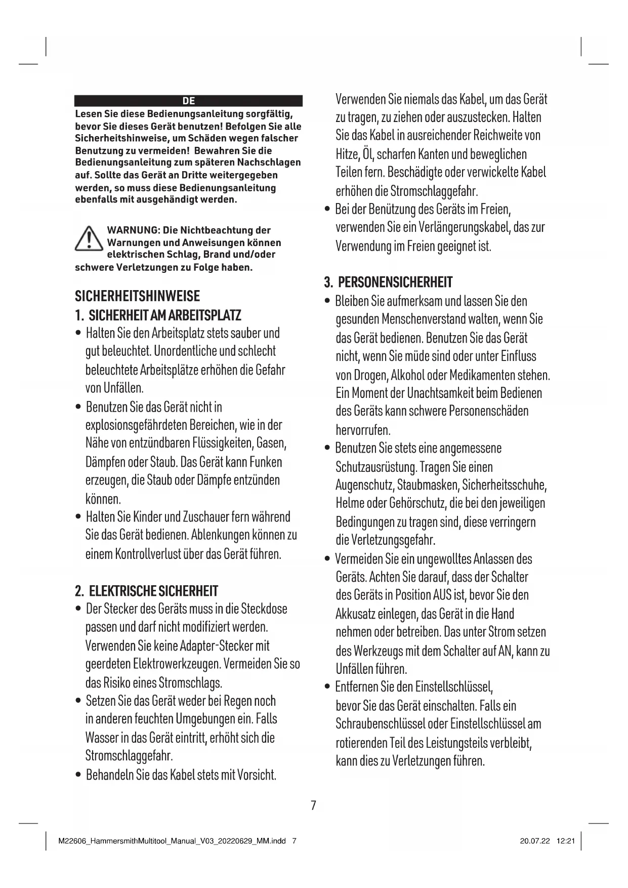 - Ein für ein anders bestimmtes Akkupack geeignetes Ladegerät kann eine Feuergefahr hervorrufen, wenn damit ein fremdes Akkupack geladen wird. M22606_HammersmithMultitool_Manual_V03_20220629_MM.indd 8M22606_HammersmithMultitool_Manual_V03_20220629_MM.indd 8 20.07.22 12:2120.07.22 12:218