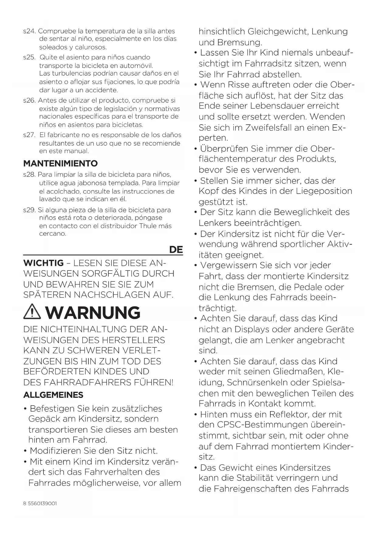 - Entfernen Sie den angehängten Schlüsselring nicht; dessen Größe vermeidet die Erstickungsgefahr für Ihr Kind, da er ein Verschlucken verhindert. INSTALLATION s1. Vergewissern Sie sich, dass Ihr Fahrrad mit diesem Kindersitz kompatibel ist. Wenn Sie Fragen haben, lesen Sie die zum Fahrrad gehörende. Dokumentation oder fragen Sie einen Fahrradhändler oder -hersteller. s2. Nur am Lenkerschaft befestigen. Montieren Sie den Sitz wie in der Montageanweisung beschrieben. Beachten Sie dabei den kleinsten und größten durchmesser. s3. Stellen Sie sicher, dass die Schrauben der Halterung und Befestigungspunkte fest angezogen sind, undüberprüfen Sie dies immer wieder. s4. Dieses Produkt ist nicht zur Verwendung auf einem Moped geeignet. s5. Achten Sie für optimalen Komfort und Sicherheit darauf, dass der Sitz nicht nach vorne geneigt ist, da das Kind sonst von der Sitzfläche rutschen könnte. Der Sitz sollte leicht nach hinten geneigt sein. s6. Vorn befestigte Fahrradkindersitze verringern die Manövrierfähigkeit desFahrrads. s7. Ein montierter Sitz kann die Beweglichkeit der Lenkstange beeinträchtigen. Wenn der Sitz denLenkwinkel in beide Richtungen auf weniger als 45° einschränkt, wechseln Sie zu einem Lenkstangentyp, der eine korrekte Funktionalität gewährleistet. s8. Stellen Sie sicher, dass das Fahrrad bei montiertem Sitz voll funktionsfähig ist. BENUTZUNG s9. Dieses Produkt ist zugelassen für Kinder im Alter von 9Monaten bis 3Jahren und einem Gewicht von 9-15kg und einer maximalen Höhe von 93 cm (36,61 Zoll). Nehmen Sie kein Kind auf dem Fahrrad mit, das noch zu jung dafür ist. Fragen Sie stets einen Kinderarzt, bevor Sie ein Kind unter 1Jahr auf dem Fahrrad transportieren. Nehmen Sie nur Kinder mit, die längere Zeit – mindestens für die beabsichtigte Fahrtdauer – ohne Hilfe sitzen können. Das Kind muss unabhängig von seinem Alter den Kopf beim Tragen eines geeigneten Fahrradhelms eigenständig halten können. Überprüfen Sie regelmäßig, dass das Kind die maximale Größe und das maximale Gewicht nicht überschreitet. s10. Überprüfen Sie vor jedem Gebrauch alle Schrauben und Befestigungspunkte, um sicherzustellen, dass der Kindersitz sicher am Fahrrad befestigt ist. s11. Wenn Sie zum ersten Mal mit montiertem Fahrradkindersitz fahren, testen Sie das Fahrrad in einer sicheren/ruhigen Umgebung, bevor Sie auf der Straße fahren. s12. Berücksichtigen Sie sorgfältig die Stabilität/ das Gleichgewicht, wenn Sie das Kind in den Sitz des Fahrrads einsetzen. s13. Achten Sie darauf, dass Sie und Ihr Kind während der Fahrt einen Fahrradhelm tragen, der EN 1078 entspricht. s14. Achten Sie regelmäßig auf Ihr Kind während der Fahrt. s15. Lassen Sie das Kind niemals unbeaufsichtigt im Kindersitz. s16. Lassen Sie Ihr Kind niemals im Fahrradsitz sitzen, wenn Sie Ihr Fahrrad abstellen und es nur mittels Fahrradständer abgestützt ist. s17. Fahren Sie nachts niemals ohne geeignete Fahrradbeleuchtung. s18. Bitte beachten Sie, dass das Auf- und Absteigen auf das Fahrrad durch den Kindersitz erschwert sein könnte. s19. Stellen Sie vor jeder Fahrt sicher, dass Sie der montierte Fahrradsitz nicht beim Bremsen, Treten oder Lenken beeinträchtigt. s20. Schnallen Sie Ihr Kind immer an und achten Sie darauf, dass der Gurt richtig sitzt. Gurt und Fußschlaufen dürfen nicht locker sein und nicht in bewegliche Teile wie Radspeichen gelangen. Dies gilt auch dann, wenn sich das Kind nicht im montierten Fahrradsitz befindet.10 5560139001 s21. Stellen Sie sicher, dass weder Ihr Kind noch Kleidungsstücke, Schuhe oder Spielsachen in die beweglichen Teile des Fahrrads wie Speichen, Gänge oder Sattelfedern geraten können. Überprüfen Sie dies regelmäßig mit zunehmendem Alter des Kindes. Sattelfedern können mit einem Sattelfederschutz gesichertwerden. s22. Achten Sie darauf, dass sich scharfe Gegenstände wie etwa zerschlissene Drähte außerhalb der Reichweite des Kindes befinden. s23. Das im Kindersitz transportierte Kind muss häufig wärmer gekleidet sein als der aktive Fahrer. Schützen Sie sich und Ihr Kind mit angemessener, wetterfester Kleidung. Fahren Sie niemals bei widrigen Wetterverhältnissen wie großer Kälte, da dies zu Erfrierungen führen kann. s24. Prüfen Sie die Temperatur des Sitzes, bevor Sie Ihr Kind hineinsetzen, vor allem an heißen, sonnigen Tagen. s25. Nehmen Sie den Kindersitz ab, bevor Sie Ihr Fahrrad auf dem Auto transportieren. Die auftretenden Luftverwirbelungen könnten den Sitz oder die Befestigungen beschädigen, was zu Unfällen führen kann. s26. Beachten Sie die gesetzlichen Bestimmungen Ihres Landes hinsichtlich des Transports von Kindern in Fahrradkindersitzen. s27. Der Hersteller haftet nicht für Schäden aufgrund einer Benutzung, die über die Empfehlungen in dieser Bedienungsanleitung hinausgeht. WARTUNG s28. Reinigen Sie den Kindersitz nur mit lauwarmem Seifenwasser. Die Polsterung ist waschbar; beachten Sie dabei die entsprechenden Pflegehinweise. s29. Sollten Teile des Kindersitzes beschädigt oder defekt sein, wenden Sie sich bitte an Ihren Thule Händler.