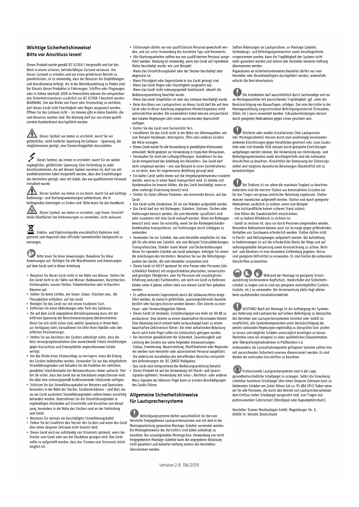 - English • Deutsch • Français • Italiano • EspañolVersion 2.8 08/2019 Wichtige Sicherheitshinweise! Bitte vor Anschluss lesen! Dieses Produkt wurde gemäß IEC 62368-1 hergestellt und hat das Werk in einem sicheren, betriebsfähigen Zustand verlassen. Um diesen Zustand zu erhalten und um einen gefahrlosen Betrieb zu gewährleisten, ist es notwendig, dass der Benutzer die Empfehlungen und Warnhinweise befolgt, die in der Betriebsanleitung zu finden sind. Bei Einsatz dieses Produktes in Fahrzeugen, Schiffen oder Flugzeugen, oder in Höhen oberhalb 2000 m Meereshöhe müssen die entsprechen- den Sicherheitsstandards zusätzlich zur IEC 62368-1 beachtet werden. WARNUNG: Um das Risiko von Feuer oder Stromschlag zu verhüten, darf dieses Gerät nicht Feuchtigkeit oder Regen ausgesetzt werden. Öffnen Sie das Gehäuse nicht – im Inneren gibt es keine Bauteile, die vom Benutzer wartbar sind. Die Wartung darf nur von einem qualifi- ziertem Kundendienst durchgeführt werden. Dieses Symbol, wo immer es erscheint, warnt Sie vor gefährlicher, nicht isolierter Spannung im Gehäuse – Spannung, die möglicherweise genügt, eine Stromschlaggefahr darzustellen. Dieses Symbol, wo immer es erscheint, warnt Sie vor außen zugänglicher, gefährlicher Spannung. Eine Verbindung zu jeder Anschlussklemme, die mit diesem Symbol versehen ist, darf nur mit konfektioniertem Kabel hergestellt werden, dass den Empfehlungen des Herstellers genügt, oder mit Kabel, das von qualifiziertem Personal installiert wurde. Dieses Symbol, wo immer es erscheint, macht Sie auf wichtige Bedienungs- und Wartungsanweisungen aufmerksam, die in beiliegenden Unterlagen zu finden sind. Bitte lesen Sie das Handbuch. Dieses Symbol, wo immer es erscheint, sagt Ihnen: Vorsicht! Heiße Oberfläche! Um Verbrennungen zu vermeiden, nicht anfassen. Elektro- und Elektronikgeräte einschließlich Batterien sind getrennt vom Hausmüll über offizielle Sammelstellen fachgerecht zu entsorgen. Bitte lesen Sie diese Anweisungen. Bewahren Sie diese Anweisungen auf. Befolgen Sie alle Warnhinweise und Anweisungen auf dem Gerät und in dieser Anleitung.
