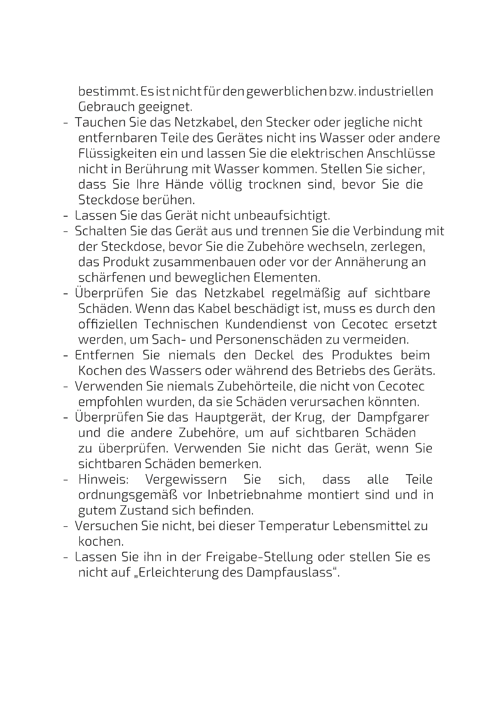Dieses Produkt hat eine Garantie von 2 Jahren ab Kaufdatum. Solange die Kaufrechnung aufbewahrt und versandt wird, bendet sich das Produkt in einwandfreiem Zustand und wird ordnungsgemäß verwendet, wie in dieser Bedienungsanleitung angegeben. Die Garantie deckt keine Schäden wenn: - Wenn das Produkt über seine Kapazität oder Brauchbarkeit hinaus benutzt, falsch behandelt, geschlagen, Feuchtigkeit ausgesetzt, in eine Flüssigkeit oder korrosive Mittel getaucht wurde, sowie bei jedem anderen Fehler, der dem Verbraucher zuzuschreiben ist. - Das Produkt von Personen demontiert, repariert oder modiziert wurde, die nicht vom ofziellen Technischen Kundendienst durch Cecotec autorisiert worden sind. - Der Grund hierfür durch die normale Abnutzung und Verschleiß der Teile und des Zubehörs entstanden ist. Die Garantieleistung deckt alle Herstellungsbedingten Schäden und Fehler Ihres Produktes für die Dauer von 2 Jahren, nach geltendem Recht. Im Falle einer falsche Benutzung ist der Garantieservice nicht für die Reparatur verantwortlich. Sollte unerwartet eine Störung auftreten oder haben Sie Fragen über Ihrem Produkt, können Sie sich mit dem Kundendienst in Verbindung setzen über die Telefonnummer: +34 96321072886 ITALIANO