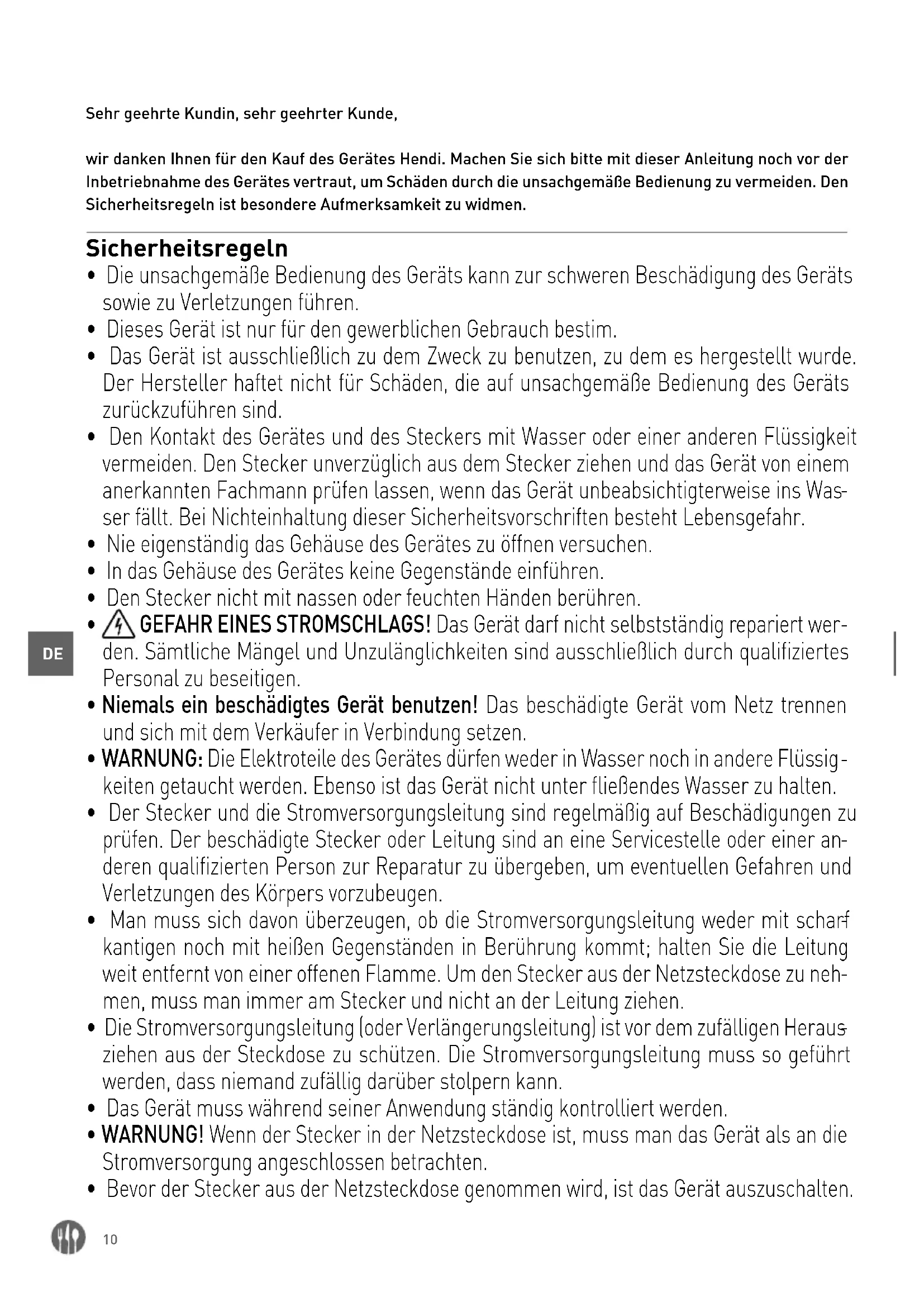 Sehr geehrte Kundin, sehr geehrter Kunde, wir danken Ihnen für den Kauf des Gerätes Hendi. Machen Sie sich bitte mit dieser Anleitung noch vor der Inbetriebnahme des Gerätes vertraut, um Schäden durch die unsachgemäße Bedienung zu vermeiden. Den Sicherheitsregeln ist besondere Aufmerksamkeit zu widmen. Sicherheitsregeln