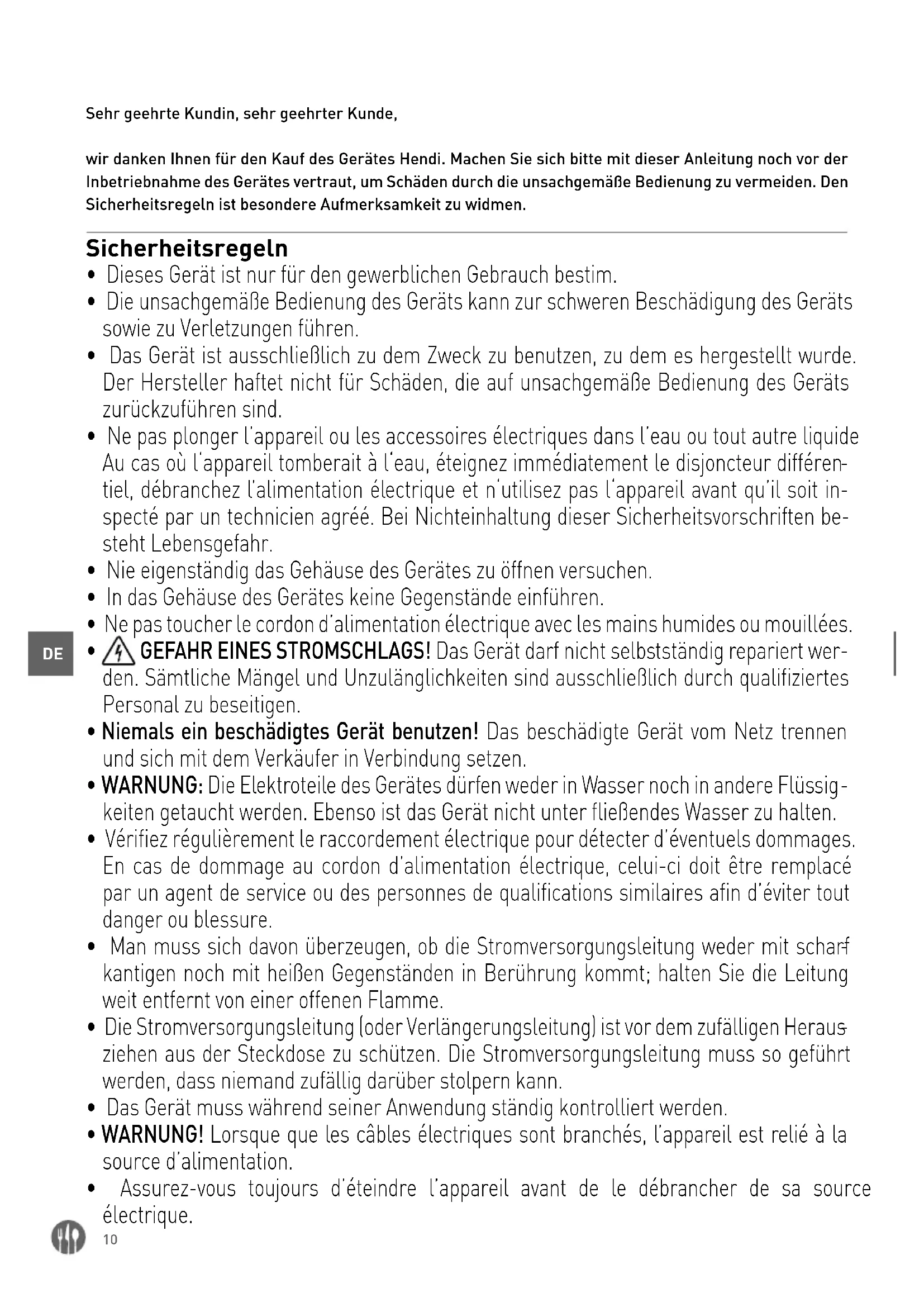 Sehr geehrte Kundin, sehr geehrter Kunde, wir danken Ihnen für den Kauf des Gerätes Hendi. Machen Sie sich bitte mit dieser Anleitung noch vor der Inbetriebnahme des Gerätes vertraut, um Schäden durch die unsachgemäße Bedienung zu vermeiden. Den Sicherheitsregeln ist besondere Aufmerksamkeit zu widmen. Sicherheitsregeln