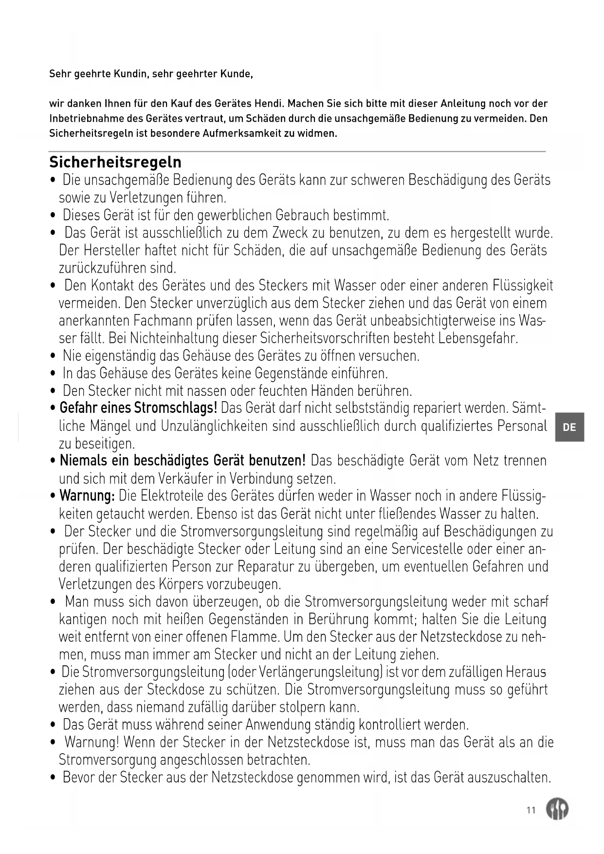 Sehr geehrte Kundin, sehr geehrter Kunde, wir danken Ihnen für den Kauf des Gerätes Hendi. Machen Sie sich bitte mit dieser Anleitung noch vor der Inbetriebnahme des Gerätes vertraut, um Schäden durch die unsachgemäße Bedienung zu vermeiden. Den Sicherheitsregeln ist besondere Aufmerksamkeit zu widmen. Sicherheitsregeln