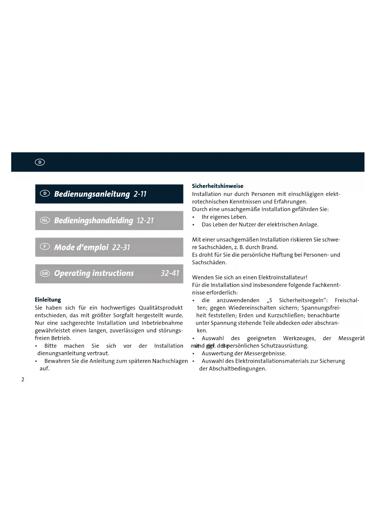 - BewahrenSiedieAnleitungzumspäterenNachschlagen auf. Sicherheitshinweise Installation nur durch Personen mit einschlägigen elekt- rotechnischen Kenntnissen und Erfahrungen. Durch eine unsachgemäße Installation gefährden Sie: