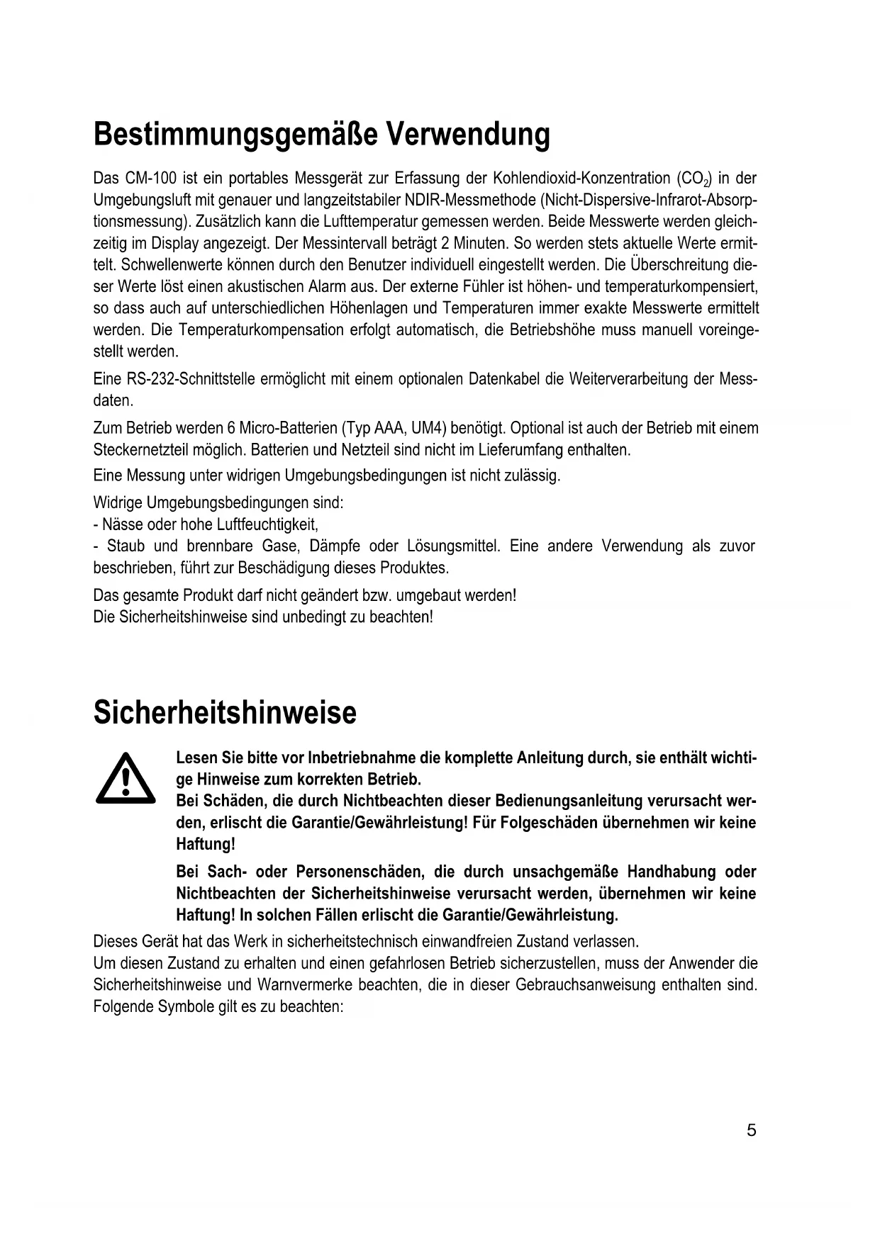 ) in der Umgebungsluft mit genauer und langzeitstabiler NDIR-Messmethode (Nicht-Dispersive-Infrarot-Absorp- tionsmessung). Zusätzlich kann die Lufttemperatur gemessen werden. Beide Messwerte werden gleich- zeitig im Display angezeigt. Der Messintervall beträgt 2 Minuten. So werden stets aktuelle Werte ermit- telt. Schwellenwerte können durch den Benutzer individuell eingestellt werden. Die Überschreitung die- ser Werte löst einen akustischen Alarm aus. Der externe Fühler ist höhen- und temperaturkompensiert, so dass auch auf unterschiedlichen Höhenlagen und Temperaturen immer exakte Messwerte ermittelt werden. Die Temperaturkompensation erfolgt automatisch, die Betriebshöhe muss manuell voreinge- stellt werden. Eine RS-232-Schnittstelle ermöglicht mit einem optionalen Datenkabel die Weiterverarbeitung der Mess- daten. Zum Betrieb werden 6 Micro-Batterien (Typ AAA, UM4) benötigt. Optional ist auch der Betrieb mit einem Steckernetzteil möglich. Batterien und Netzteil sind nicht im Lieferumfang enthalten. Eine Messung unter widrigen Umgebungsbedingungen ist nicht zulässig. Widrige Umgebungsbedingungen sind: - Nässe oder hohe Luftfeuchtigkeit, - Staub und brennbare Gase, Dämpfe oder Lösungsmittel. Eine andere Verwendung als zuvor beschrieben, führt zur Beschädigung dieses Produktes. Das gesamte Produkt darf nicht geändert bzw. umgebaut werden! Die Sicherheitshinweise sind unbedingt zu beachten! Sicherheitshinweise