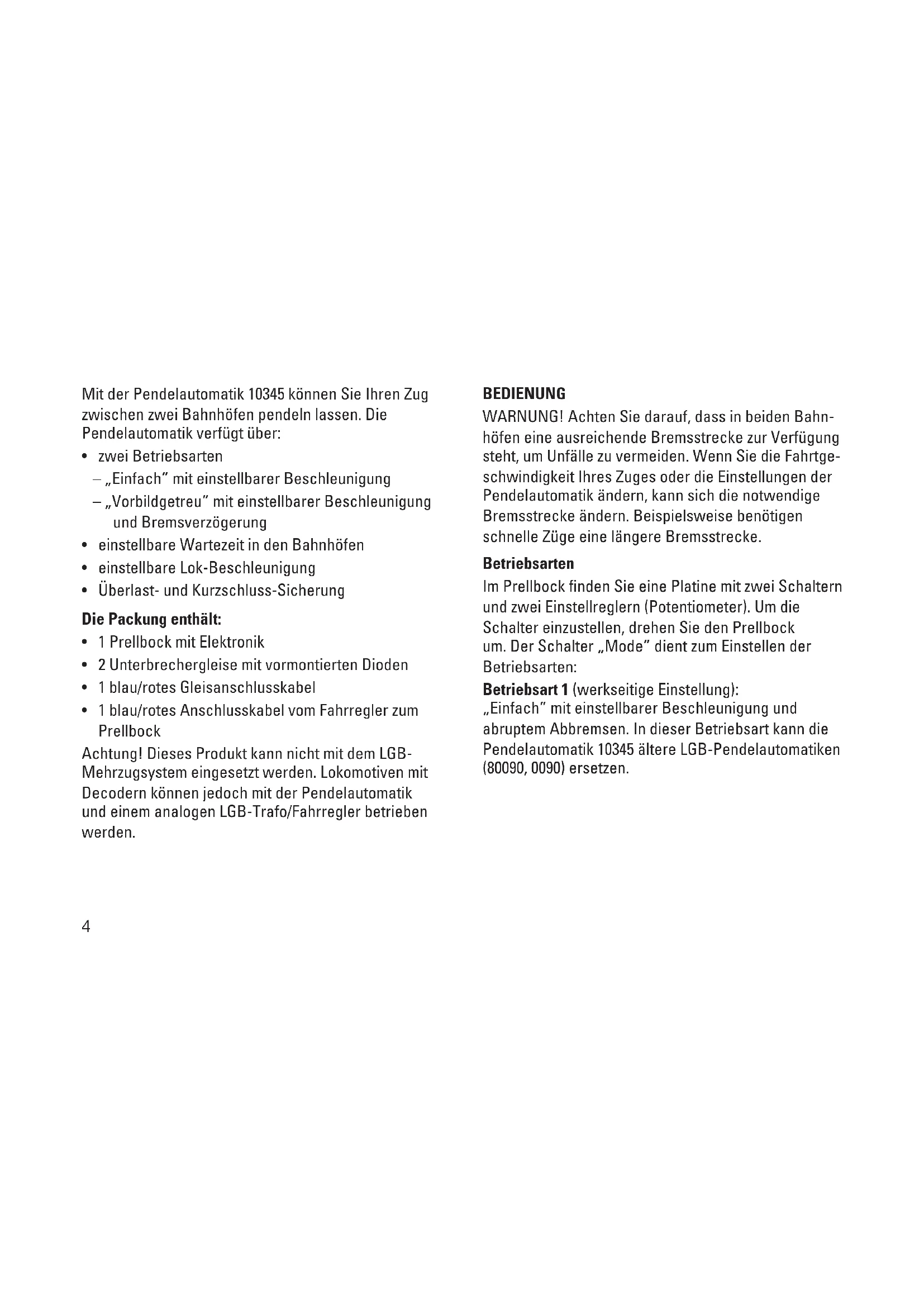 - 1 blau/rotes Anschlusskabel vom Fahrregler zum Prellbock Achtung! Dieses Produkt kann nicht mit dem LGB- Mehrzugsystem eingesetzt werden. Lokomotiven mit Decodern können jedoch mit der Pendelautomatik und einem analogen LGB-Trafo/Fahrregler betrieben werden. BEDIENUNG WARNUNG! Achten Sie darauf, dass in beiden Bahn- höfen eine ausreichende Bremsstrecke zur Verfügung steht, um Unfälle zu vermeiden. Wenn Sie die Fahrtge- schwindigkeit Ihres Zuges oder die Einstellungen der Pendelautomatik ändern, kann sich die notwendige Bremsstrecke ändern. Beispielsweise benötigen schnelle Züge eine längere Bremsstrecke. Betriebsarten Im Prellbock finden Sie eine Platine mit zwei Schaltern und zwei Einstellreglern (Potentiometer). Um die Schalter einzustellen, drehen Sie den Prellbock um. Der Schalter „Mode” dient zum Einstellen der Betriebsarten: Betriebsart 1 (werkseitige Einstellung): „Einfach” mit einstellbarer Beschleunigung und abruptem Abbremsen. In dieser Betriebsart kann die Pendelautomatik 10345 ältere LGB-Pendelautomatiken (80090, 0090) ersetzen.5 Betriebsart 2 „Mit vorbildgetreuem Abbremsen”: einstellbare Beschleunigung und Abbremsung. Achtung! Eine neue Betriebsart wird erst wirksam, nachdem die Betriebsspannung mindestens 15 Sekun- den lang ausgeschaltet ist. Hinweis: Die Schienenreinigungslok 20670 kann auf der Pendelstrecke nicht mit der Reinigungsfunktion betrieben werden. BETRIEBSART 1 („EINFACH“) Vorbereitung