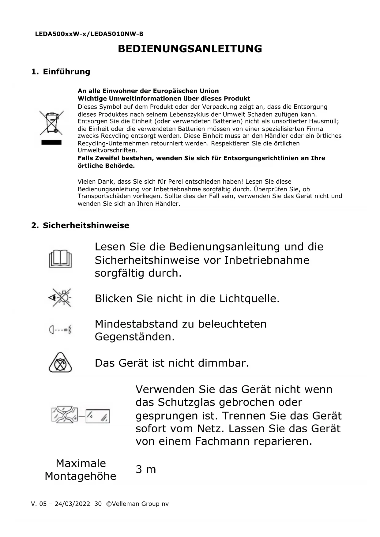 Finden Sie kostenlos die Bedienungsanleitung des Geräts LEDA5010NWB Perel als PDF.