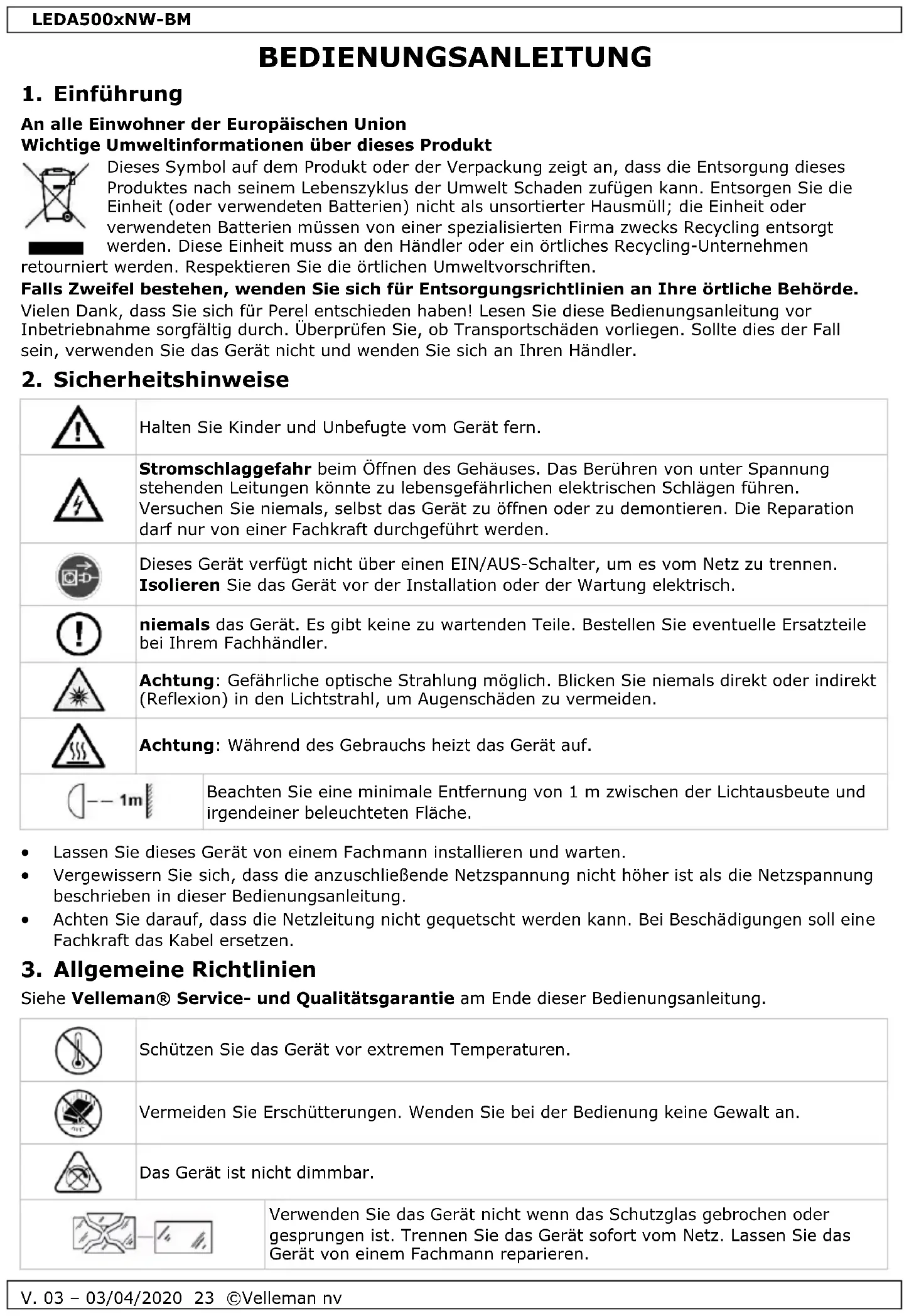 RED Konformitätserklärung Hiermit erklärt Velleman NV, dass der Funkanlagentyp LEDA5001NW-BM + LEDA5002NW-BM + LEDA5003NW-BM + LEDA5005NW-BM der Richtlinie 2014/53/EU entspricht. Der vollständige Text der EU-Konformitätserklärung ist unter der folgenden Internetadresse verfügbar: www.velleman.eu. Verwenden Sie dieses Gerät nur mit originellen Zubehörteilen. Velleman NV übernimmt keine Haftung für Schaden oder Verletzungen bei (falscher) Anwendung dieses Gerätes. Für mehr Informationen zu diesem Produkt und die neueste Version dieser Bedienungsanleitung, siehe www.velleman.eu. Alle Änderungen ohne vorherige Ankündigung vorbehalten. © URHEBERRECHT Velleman NV besitzt das Urheberrecht für diese Bedienungsanleitung. Alle weltweiten Rechte vorbehalten. Ohne vorherige schriftliche Genehmigung des Urhebers ist es nicht gestattet, diese Bedienungsanleitung ganz oder in Teilen zu reproduzieren, zu kopieren, zu übersetzen, zu bearbeiten oder zu speichern.LEDA500xNW-BM