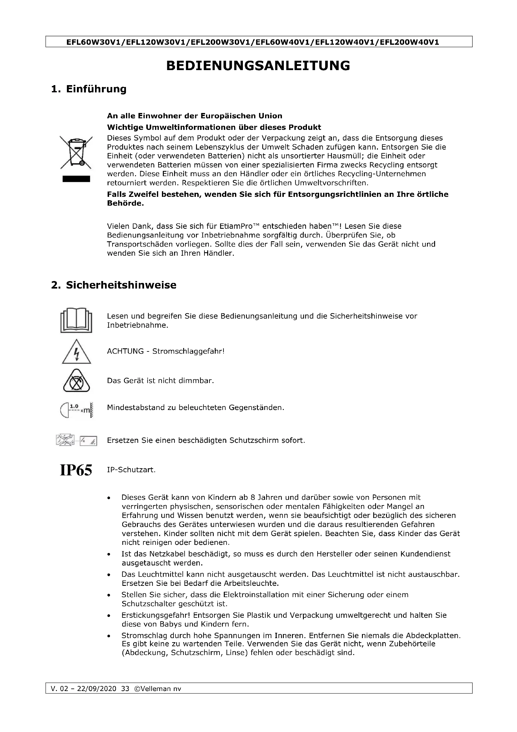 © URHEBERRECHT Velleman NV besitzt das Urheberrecht für diese Bedienungsanleitung. Alle weltweiten Rechte vorbehalten. Ohne vorherige schriftliche Genehmigung des Urhebers ist es nicht gestattet, diese Bedienungsanleitung ganz oder in Teilen zu reproduzieren, zu kopieren, zu übersetzen, zu bearbeiten oder zu speichern.EFL60W30V1/EFL120W30V1/EFL200W30V1/EFL60W40V1/EFL120W40V1/EFL200W40V1