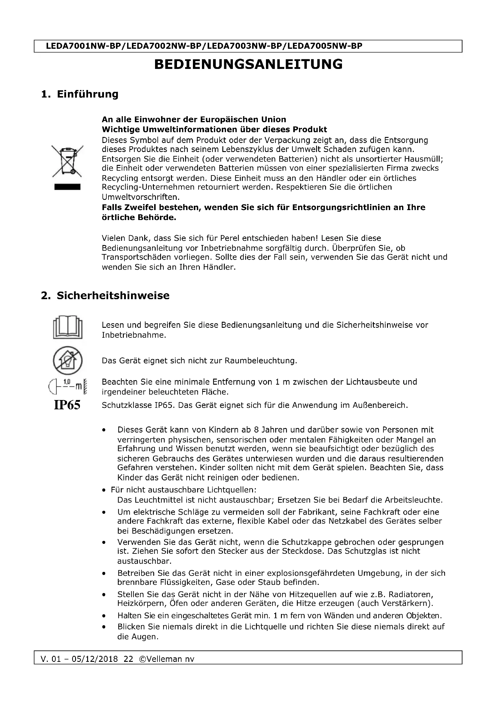 Velleman NV besitzt das Urheberrecht für diese Bedienungsanleitung. Alle weltweiten Rechte vorbehalten. Ohne vorherige schriftliche Genehmigung des Urhebers ist es nicht gestattet, diese Bedienungsanleitung ganz oder in Teilen zu reproduzieren, zu kopieren, zu übersetzen, zu bearbeiten oder zu speichern.LEDA7001NW-BP/LEDA7002NW-BP/LEDA7003NW-BP/LEDA7005NW-BP