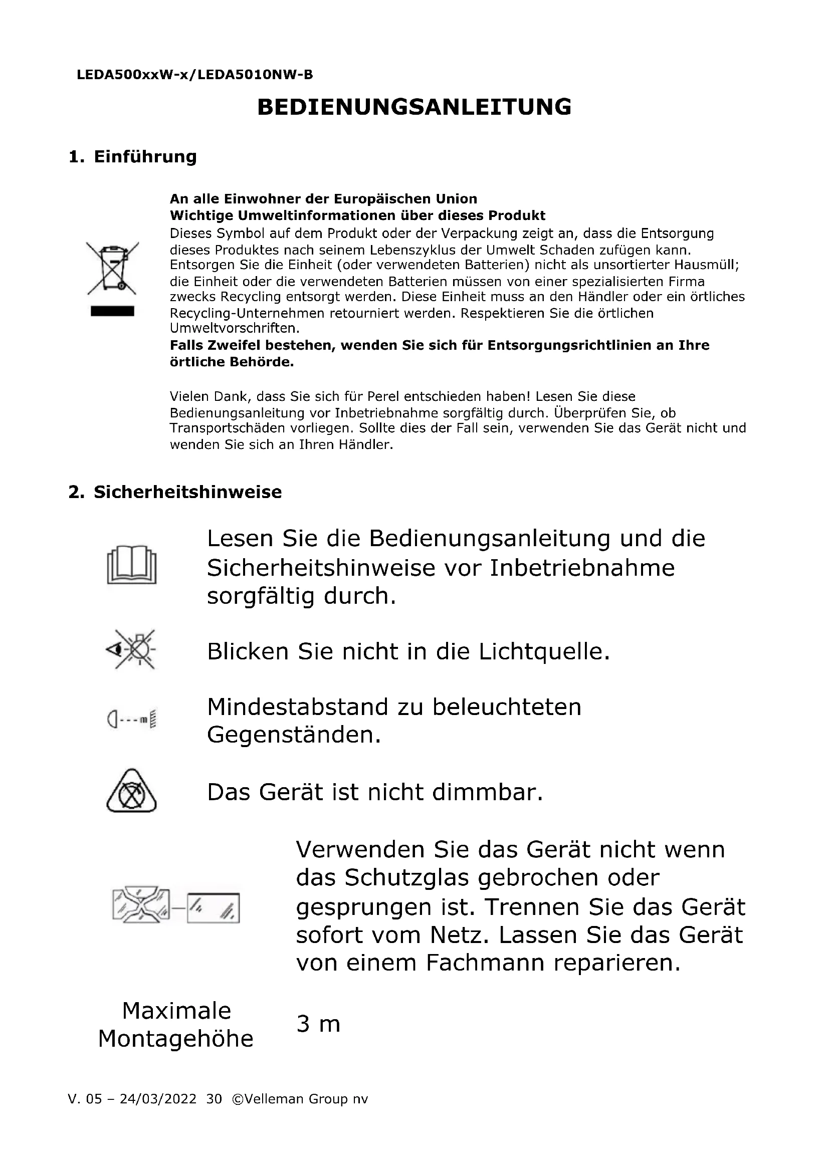 Finden Sie kostenlos die Bedienungsanleitung des Geräts LEDA5002WWB Perel als PDF.