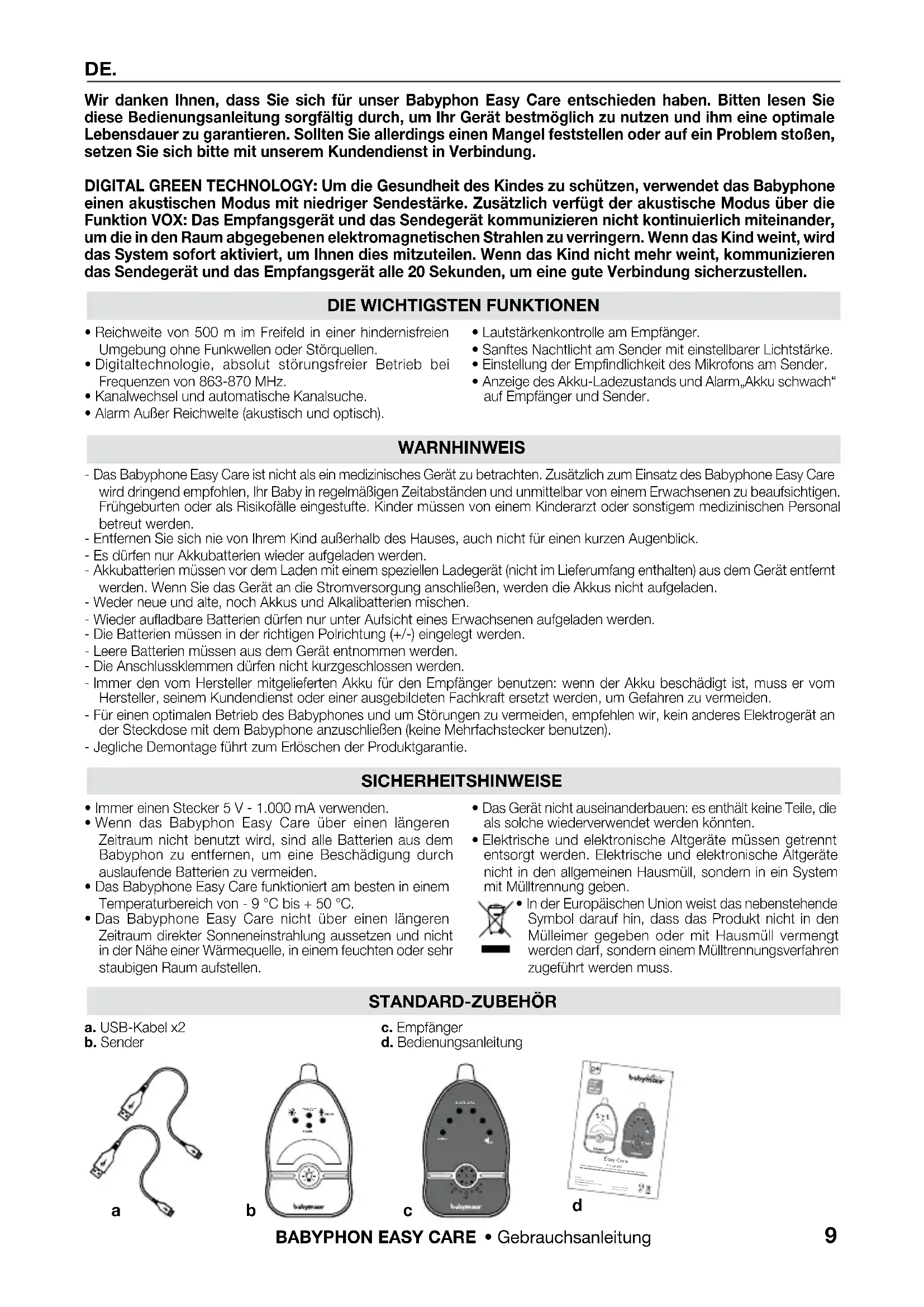 DE. Wir danken Ihnen, dass Sie sich für unser Babyphon Easy Care entschieden haben. Bitten lesen Sie diese Bedienungsanleitung sorgfältig durch, um Ihr Gerät bestmöglich zu nutzen und ihm eine optimale Lebensdauer zu garantieren. Sollten Sie allerdings einen Mangel feststellen oder auf ein Problem stoßen, setzen Sie sich bitte mit unserem Kundendienst in Verbindung. DIGITAL GREEN TECHNOLOGY: Um die Gesundheit des Kindes zu schützen, verwendet das Babyphone einen akustischen Modus mit niedriger Sendestärke. Zusätzlich verfügt der akustische Modus über die Funktion VOX: Das Empfangsgerät und das Sendegerät kommunizieren nicht kontinuierlich miteinander, um die in den Raum abgegebenen elektromagnetischen Strahlen zu verringern. Wenn das Kind weint, wird das System sofort aktiviert, um Ihnen dies mitzuteilen. Wenn das Kind nicht mehr weint, kommunizieren das Sendegerät und das Empfangsgerät alle 20 Sekunden, um eine gute Verbindung sicherzustellen.