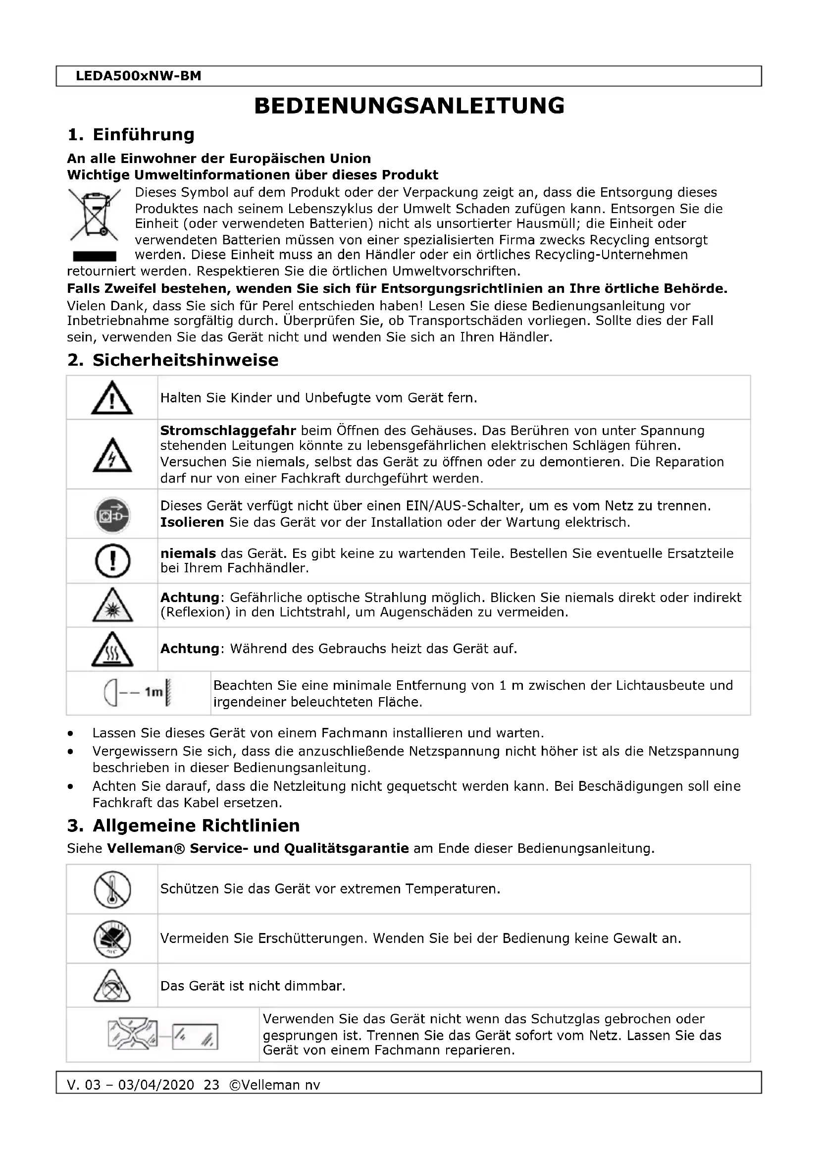 Verwenden Sie das Gerät nicht wenn das Schutzglas gebrochen oder gesprungen ist. Trennen Sie das Gerät sofort vom Netz. Lassen Sie das Gerät von einem Fachmann reparieren.LEDA500xNW-BM
