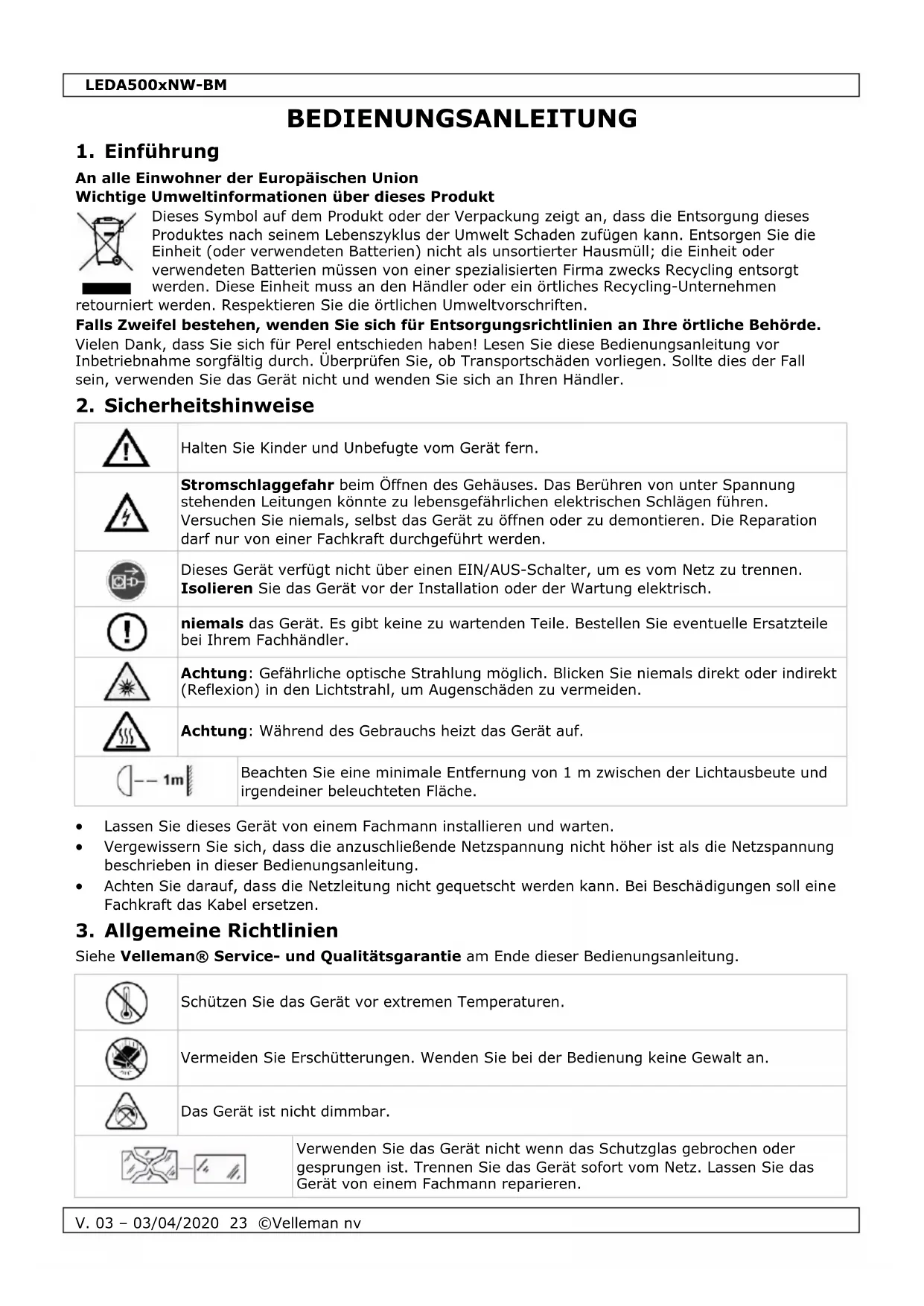 RED Konformitätserklärung Hiermit erklärt Velleman NV, dass der Funkanlagentyp LEDA5001NW-BM + LEDA5002NW-BM + LEDA5003NW-BM + LEDA5005NW-BM der Richtlinie 2014/53/EU entspricht. Der vollständige Text der EU-Konformitätserklärung ist unter der folgenden Internetadresse verfügbar: www.velleman.eu. Verwenden Sie dieses Gerät nur mit originellen Zubehörteilen. Velleman NV übernimmt keine Haftung für Schaden oder Verletzungen bei (falscher) Anwendung dieses Gerätes. Für mehr Informationen zu diesem Produkt und die neueste Version dieser Bedienungsanleitung, siehe www.velleman.eu. Alle Änderungen ohne vorherige Ankündigung vorbehalten. © URHEBERRECHT Velleman NV besitzt das Urheberrecht für diese Bedienungsanleitung. Alle weltweiten Rechte vorbehalten. Ohne vorherige schriftliche Genehmigung des Urhebers ist es nicht gestattet, diese Bedienungsanleitung ganz oder in Teilen zu reproduzieren, zu kopieren, zu übersetzen, zu bearbeiten oder zu speichern.LEDA500xNW-BM