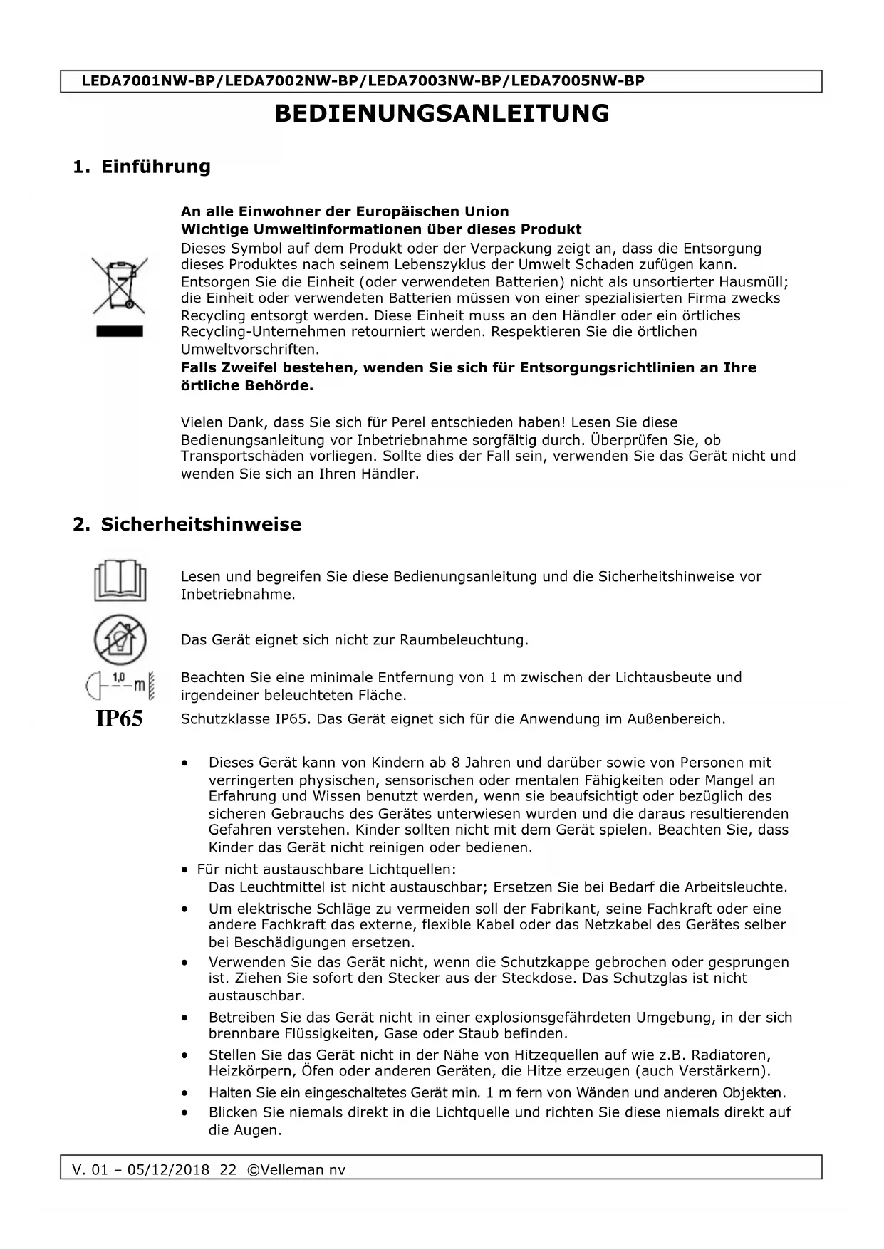 Velleman NV besitzt das Urheberrecht für diese Bedienungsanleitung. Alle weltweiten Rechte vorbehalten. Ohne vorherige schriftliche Genehmigung des Urhebers ist es nicht gestattet, diese Bedienungsanleitung ganz oder in Teilen zu reproduzieren, zu kopieren, zu übersetzen, zu bearbeiten oder zu speichern.LEDA7001NW-BP/LEDA7002NW-BP/LEDA7003NW-BP/LEDA7005NW-BP