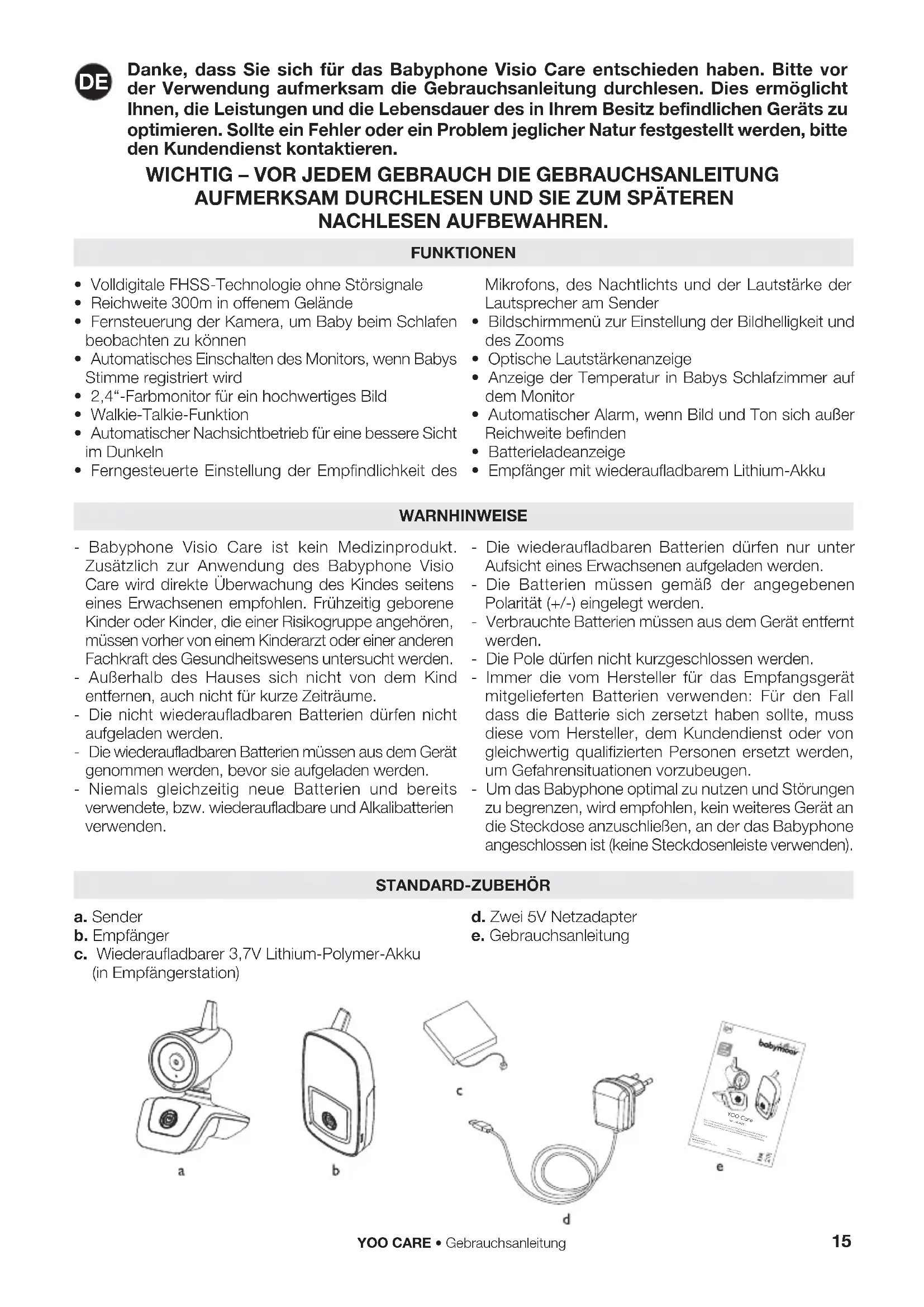 - Empfänger mit wiederaufladbarem Lithium-Akku WARNHINWEISE - Babyphone Visio Care ist kein Medizinprodukt. Zusätzlich zur Anwendung des Babyphone Visio Care wird direkte Überwachung des Kindes seitens eines Erwachsenen empfohlen. Frühzeitig geborene Kinder oder Kinder, die einer Risikogruppe angehören, müssen vorher von einem Kinderarzt oder einer anderen Fachkraft des Gesundheitswesens untersucht werden. - Außerhalb des Hauses sich nicht von dem Kind entfernen, auch nicht für kurze Zeiträume. - Die nicht wiederaufladbaren Batterien dürfen nicht aufgeladen werden. - Die wiederaufladbaren Batterien müssen aus dem Gerät genommen werden, bevor sie aufgeladen werden. - Niemals gleichzeitig neue Batterien und bereits verwendete, bzw. wiederaufladbare und Alkalibatterien verwenden. - Die wiederaufladbaren Batterien dürfen nur unter Aufsicht eines Erwachsenen aufgeladen werden. - Die Batterien müssen gemäß der angegebenen Polarität (+/-) eingelegt werden. - Verbrauchte Batterien müssen aus dem Gerät entfernt werden. - Die Pole dürfen nicht kurzgeschlossen werden. - Immer die vom Hersteller für das Empfangsgerät mitgelieferten Batterien verwenden: Für den Fall dass die Batterie sich zersetzt haben sollte, muss diese vom Hersteller, dem Kundendienst oder von gleichwertig qualifizierten Personen ersetzt werden, um Gefahrensituationen vorzubeugen. - Um das Babyphone optimal zu nutzen und Störungen zu begrenzen, wird empfohlen, kein weiteres Gerät an die Steckdose anzuschließen, an der das Babyphone angeschlossen ist (keine Steckdosenleiste verwenden). STANDARD-ZUBEHÖR a. Sender b. Empfänger c. Wiederaufladbarer 3,7V Lithium-Polymer-Akku (in Empfängerstation) d. Zwei 5V Netzadapter e. Gebrauchsanleitung BabymoovParc Industriel des Gravanches16, rue Jacqueline Auriol63051 Clermont-Ferrand cedex 2 - Francewww.babymoov.comDesigned and engineer by Babymoov in FranceRéf. : A014422YOO CareNotice d’utilisation • Instructions for use • Benutzungsanleitung • Gebruikshandleiding Instrucciones de uso • Istruzioni per l’uso • Instruções de uso • Návod k použitíHasználati utasítások • Instrucțiuni de utilizare • Instrukcje użycia • Brugsanvisning16 BEDIENELEMENTE