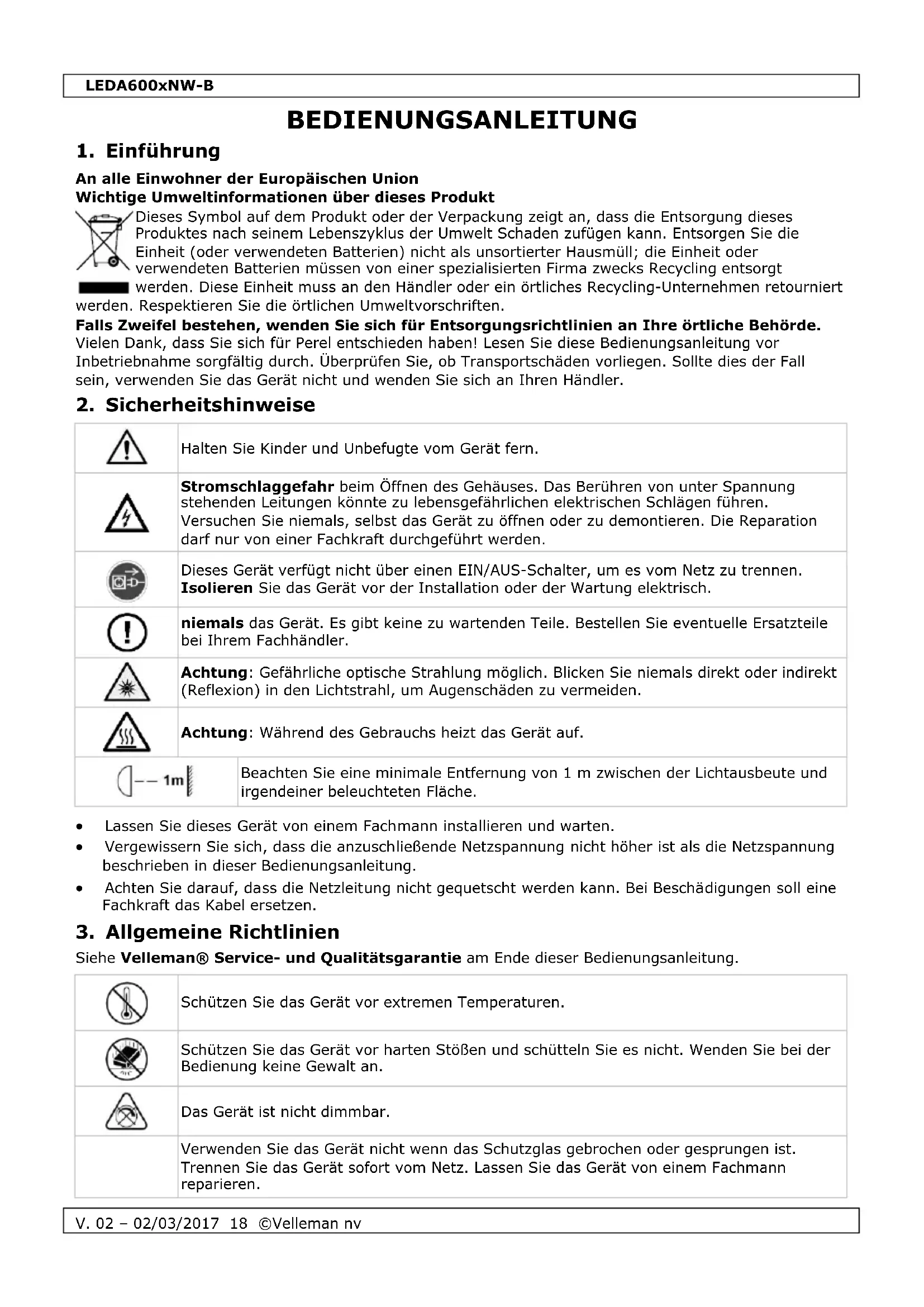 Verwenden Sie dieses Gerät nur mit originellen Zubehörteilen. Velleman NV übernimmt keine Haftung für Schaden oder Verletzungen bei (falscher) Anwendung dieses Gerätes. Für mehr Informationen zu diesem Produkt und die neueste Version dieser Bedienungsanleitung, siehe www.perel.eu. Alle Änderungen ohne vorherige Ankündigung vorbehalten. © URHEBERRECHT Velleman NV besitzt das Urheberrecht für diese Bedienungsanleitung. Alle weltweiten Rechte vorbehalten. Ohne vorherige schriftliche Genehmigung des Urhebers ist es nicht gestattet, diese Bedienungsanleitung ganz oder in Teilen zu reproduzieren, zu kopieren, zu übersetzen, zu bearbeiten oder zu speichern.LEDA600xNW-B