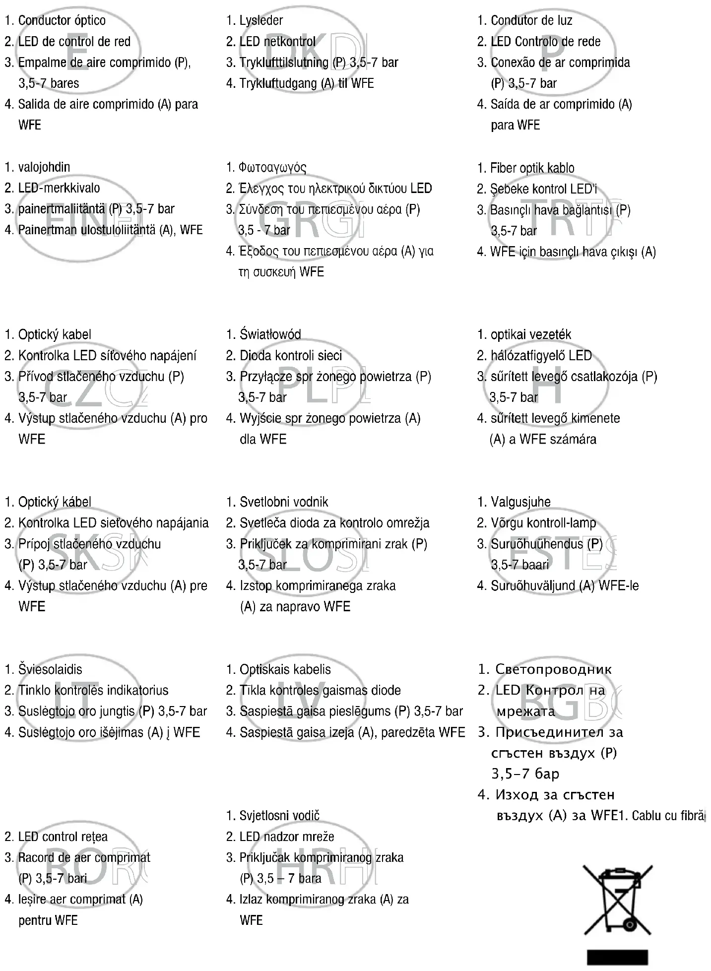 Überprüfen Sie, ob die Netzspannung mit der Angabe auf dem Typenschild übereinstimmt. Bei korrekter Netzspannung das Steuergerät mit dem Netz verbinden. Grüne LED (2) zeigt die Betriebsbereitschaft an. Das Steuergerät ist für den Betrieb von 2 Lötkolbenablagen ausgerüstet. Beim Betrieb mit nur einer Lötkolbenablage, muß der zweite Lichtleitereingang verschlossen bleiben. Zum Anschluß des Lichtleiters (1) die Klemmutter lösen und den Lichtleiter bis zum Anschlag einführen, danach die Mutter handfest anziehen. Anschließend die Druckluftversorgung (3) und den WFE P an den Druckluftausgang (4) einstecken und einschalten. KHP : FE-Lötkolben in der Lötkolbenablage ablegen und darauf achten, daß der Lichteintritt (1) vollständig durch den Lötkolben abgedeckt ist. KHP 81: Den Lötkolben mit dem Anschlußstecker in die Buchse der Schaltablage einstecken. Das Anschlußkabel der Schaltablage mit der Lötstation verbinden. Zur einwandfreien Funktion der Nachlaufsteuerung muss sich der Lötkolben im Regelbereich der Temperatur befinden. Die Lötrauchabsaugung WFE schaltet nach ca. 20 sec. ab. Beim Herausnehmen des Lötkolbens aus der Lötkolbenablage startet der WFE wieder. Standardsetback (bei digitalen Lötstationen) Bei Nichtgebrauch des Lötwerkzeuges wird die Temperatur nach 20 min. automatisch auf den Standby Wert von 150°C (300°F) abgesenkt. Nach dreifacher Setbackzeit (60 min.) wird die „AUTO OFF“ Funktion aktiviert. Der Lötkolben wird abge- schalten.