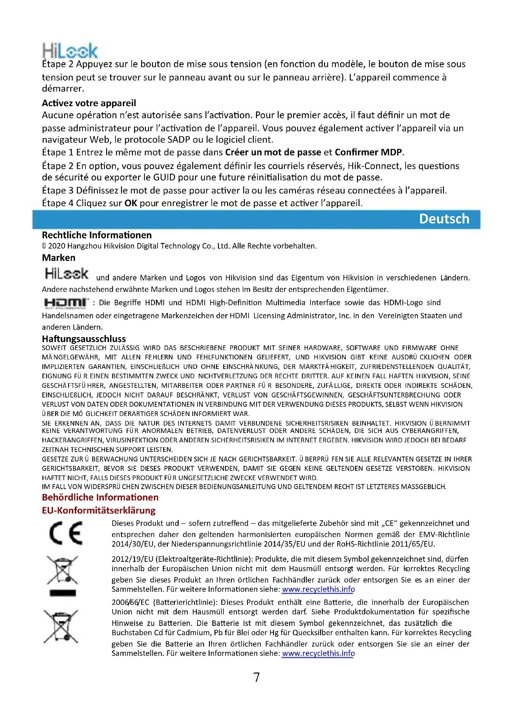 2006/66/EC (Batterierichtlinie): Dieses Produkt enthält eine Batterie, die innerhalb der Europäischen Union nicht mit dem Hausmüll entsorgt werden darf. Siehe Produktdokumentation für spezifische Hinweise zu Batterien. Die Batterie ist mit diesem Symbol gekennzeichnet, das zusätzlich die Buchstaben Cd für Cadmium, Pb für Blei oder Hg für Quecksilber enthalten kann. Für korrektes Recycling geben Sie die Batterie an Ihren örtlichen Fachhändler zurück oder entsorgen Sie sie an einer der Sammelstellen. Für weitere Informationen siehe: www.recyclethis.info8 Sicherheitshinweise ● Die korrekte Konfiguration aller Passwörter und anderer Sicherheitseinstellungen liegen in der Verantwortung des Installateurs und/oder Endbenutzers. ● Schließen Sie den Stecker fest an einer geeigneten Steckdose an. Schließen Sie nicht mehrere Geräte an ein Netzteil an. Schalten Sie das Gerät aus, bevor Sie Zubehörteile und Peripheriegeräte anschließen oder trennen. ● Stromschlaggefahr! Trennen Sie vor Wartungsarbeiten alle Stromquellen. ● Das Gerät muss an eine geerdete Steckdose angeschlossen werden. ● Die Steckdose sollte sich in der Nähe des Geräts befinden und muss einfach zugänglich sein. ● weist auf eine gefährliche Spannung hin, die externe Verkabelung muss von einer Fachkraft vorgenommen werden. ● Stellen Sie das Gerät keinesfalls an einem unsicheren Ort auf. Es könnte umfallen und schwere oder sogar tödliche Verletzungen verursachen. ● Die Eingangsspannung muss SELV (Schutzkleinspannung) und LPS (Stromquelle mit begrenzter Leistung) nach IEC60950-1 entsprechen. ● Hoher Berührungsstrom! Vor Anschluss an die Stromversorgung erden. ● Sollten sich Rauch, Gerüche oder Geräusche in dem Gerät entwickeln, so schalten Sie es unverzüglich aus und ziehen Sie den Netzstecker; dann wenden Sie sich an den Kundendienst. ● Verwenden Sie das Gerät möglichst in Verbindung mit einer unterbrechungsfreien Stromversorgung (USV) und verwenden Sie eine vom Hersteller empfohlene Festplatte. ● Dieses Produkt enthält eine Knopfzelle. Falls die Batterie verschluckt wird, kann sie in nur 2 Stunden schwere interne Verbrennungen verursachen und zum Tod führen. ● Das Gerät ist nicht für den Einsatz an Orten geeignet, an denen sich wahrscheinlich Kinder aufhalten. ● VORSICHT: Bei Austausch der Batterie durch einen falschen Typ besteht Explosionsgefahr. ● Unsachgemäßer Austausch einer Batterie durch einen falschen Typ kann eine Schutzvorrichtung umgehen (z. B. bei einigen Lithium-Batterietypen). ● Batterien nicht durch Verbrennen, in einem heißen Ofen oder Zerkleinern oder Zerschneiden entsorgen. Das kann zu einer Explosion führen. ● Bewahren Sie Batterien nicht in einer Umgebung mit extrem hoher Temperatur auf. Das kann zu einer Explosion oder zum Auslaufen von entflammbarer Flüssigkeit oder Gas führen. ● Setzen Sie Batterien keinem extrem niedrigen Luftdruck aus. Das kann zu einer Explosion oder zum Auslaufen von entflammbarer Flüssigkeit oder Gas führen. ● Entsorgen Sie Altbatterien gemäß den Anleitungen. ● Halten Sie Körperteile von Lüfterflügeln und Motoren fern. Unterbrechen Sie die Stromversorgung während der Wartung. Sicherheits- und Warnhinweise Bevor Sie Ihr Gerät anschließen und in Betrieb nehmen, beachten Sie bitte die folgenden Hinweise: ● Das Gerät ist nur für die Verwendung in Innenräumen vorgesehen. Installieren Sie es in einer gut belüfteten, staubfreien und trockenen Umgebung. ● Achten Sie darauf, dass der Rekorder ordnungsgemäß in einem Baugruppenträger oder Regal montiert ist. Größere Stöße oder Erschütterungen des Rekorders durch Herunterfallen können zu Schäden an der empfindlichen Elektronik im Rekorder führen. ● Das Gerät darf nicht Tropf- oder Spritzwasser ausgesetzt werden und es dürfen keine mit Flüssigkeiten gefüllten Gegenstände, wie Vasen, auf das Gerät gestellt werden. ● Stellen Sie keine offenen Flammen (wie brennende Kerzen) auf dem Gerät ab.9 ● Die Belüftung darf nicht durch Abdecken der Lüftungsöffnungen mit Gegenständen behindert werden, wie z. B. Zeitungen, Tischdecken, Vorhänge usw. Die Ö ffnungen dürfen niemals dadurch blockiert werden, indem das Gerät auf ein Bett, Sofa, einen Teppich oder eine ähnliche Oberfläche gestellt wird. ● Bei bestimmten Modellen ist die korrekte Anschlussverdrahtung der Klemmen für den Anschluss an ein Stromnetz zu gewährleisten. ● Bei bestimmten Modellen wurden die Geräte für den Anschluss an ein IT-Stromverteilungssystem ausgelegt und bei Bedarf modifiziert. ● Verwenden Sie nur Stromversorgungen, die im Benutzerhandbuch oder in der Bedienungsanleitung aufgeführt sind. ● Bei hohen Betriebstemperaturen (45 °C bis 55 °C) kann sich die Stromversorgung einiger Netzteile verringern. Hochfahren Die ordnungsgemäße Inbetriebnahme ist entscheidend für die lange Lebensdauer von NVR/DVRs. Schritt 1 Schließen Sie das Netzteil an einer Steckdose an. Schritt 2 Drücken Sie die Ein/Aus-Taste (bei bestimmten Modellen kann sich die Ein/Aus-Taste auf der Vorder- oder Rückseite befinden). Das Gerät fährt hoch. Gerät aktivieren Vor der Aktivierung ist kein Betrieb möglich. Für den erstmaligen Gebrauch ist es erforderlich, ein Administrator-Passwort für die Geräteaktivierung einzurichten. Sie können das Gerät auch über einen Webbrowser, SADP oder Client-Software aktivieren. Schritt 1 Geben Sie dasselbe Passwort in Neues Kennwort erstellen und Kennwort bestätigen ein. Schritt 2 Richten Sie optional reservierte E-Mail, Hik-Connect und Sicherheitsfragen ein oder exportieren Sie die GUID für eine zukünftige Passwortrücksetzung. Schritt 3 Richten Sie das Passwort ein, um die an das Gerät angeschlossene(n) Netzwerkkamera(s) zu aktivieren. Schritt 4 Klicken Sie auf OK, um das Passwort zu speichern und das Gerät zu aktivieren. Español Información legal © 2020 Hangzhou Hikvision Digital Technology Co., Ltd. Todos los derechos rese