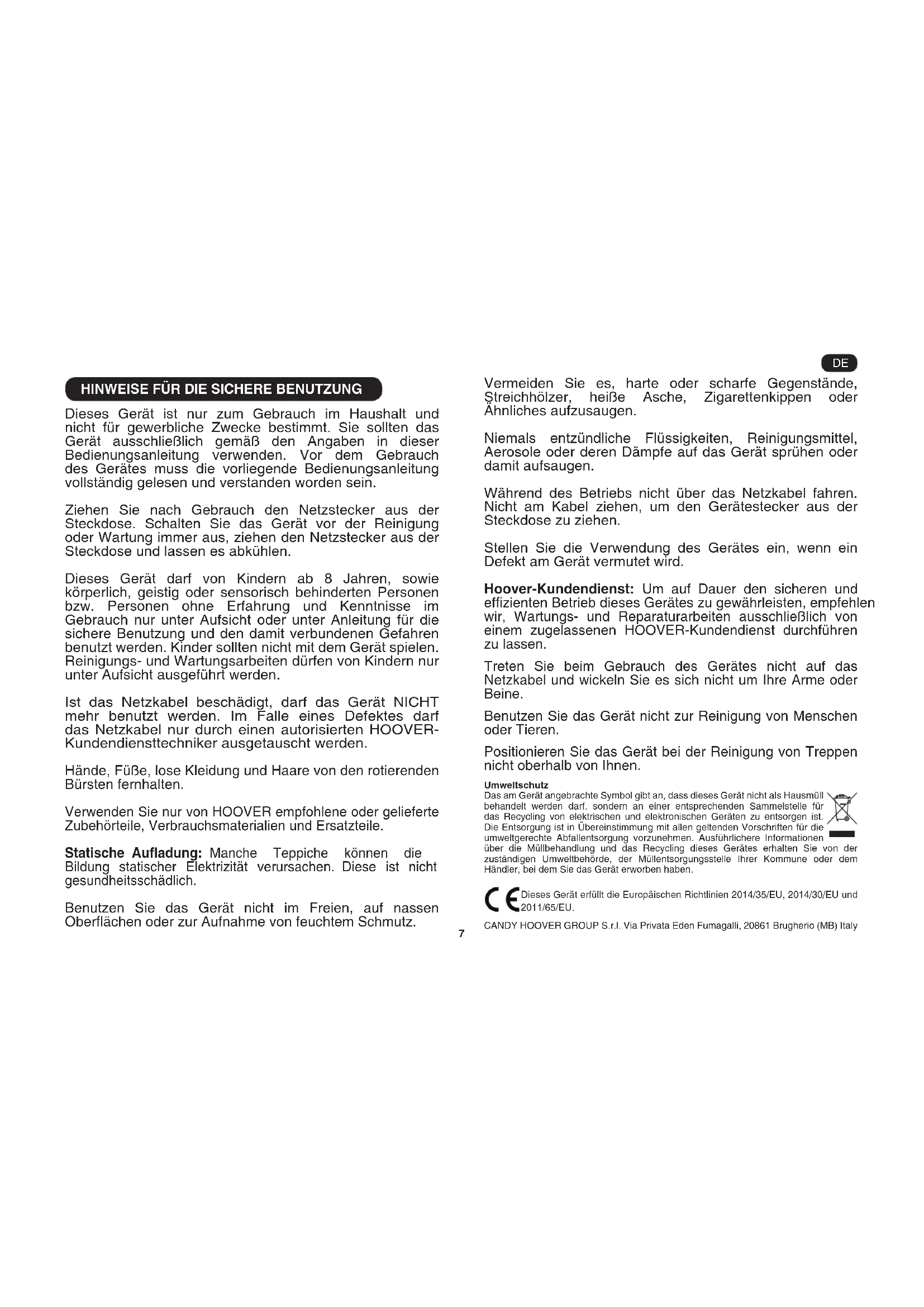 Dieses Gerät ist nur zum Gebrauch im Haushalt und nicht für gewerbliche Zwecke bestimmt. Sie sollten das Gerät ausschließlich gemäß den Angaben in dieser Bedienungsanleitung verwenden. Vor dem Gebrauch des Gerätes muss die vorliegende Bedienungsanleitung vollständig gelesen und verstanden worden sein. Ziehen Sie nach Gebrauch den Netzstecker aus der Steckdose. Schalten Sie das Gerät vor der Reinigung oder Wartung immer aus, ziehen den Netzstecker aus der Steckdose und lassen es abkühlen. Dieses Gerät darf von Kindern ab 8 Jahren, sowie körperlich, geistig oder sensorisch behinderten Personen bzw. Personen ohne Erfahrung und Kenntnisse im Gebrauch nur unter Aufsicht oder unter Anleitung für die sichere Benutzung und den damit verbundenen Gefahren benutzt werden. Kinder sollten nicht mit dem Gerät spielen. Reinigungs- und Wartungsarbeiten dürfen von Kindern nur unter Aufsicht ausgeführt werden. Ist das Netzkabel beschädigt, darf das Gerät NICHT mehr benutzt werden. Im Falle eines Defektes darf das Netzkabel nur durch einen autorisierten HOOVER- Kundendiensttechniker ausgetauscht werden. Hände, Füße, lose Kleidung und Haare von den rotierenden Bürsten fernhalten. Verwenden Sie nur von HOOVER empfohlene oder gelieferte Zubehörteile, Verbrauchsmaterialien und Ersatzteile. Statische Auadung: Manche Teppiche können die Bildung statischer Elektrizität verursachen. Diese ist nicht gesundheitsschädlich. Benutzen Sie das Gerät nicht im Freien, auf nassen Oberächen oder zur Aufnahme von feuchtem Schmutz. Vermeiden Sie es, harte oder scharfe Gegenstände, Streichhölzer, heiße Asche, Zigarettenkippen oder Ähnliches aufzusaugen. Niemals entzündliche Flüssigkeiten, Reinigungsmittel, Aerosole oder deren Dämpfe auf das Gerät sprühen oder damit aufsaugen. Während des Betriebs nicht über das Netzkabel fahren. Nicht am Kabel ziehen, um den Gerätestecker aus der Steckdose zu ziehen. Stellen Sie die Verwendung des Gerätes ein, wenn ein Defekt am Gerät vermutet wird. Hoover-Kundendienst: Um auf Dauer den sicheren und efzienten Betrieb dieses Gerätes zu gewährleisten, empfehlen wir, Wartungs- und Reparaturarbeiten ausschließlich von einem zugelassenen HOOVER-Kundendienst durchführen zu lassen. Treten Sie beim Gebrauch des Gerätes nicht auf das Netzkabel und wickeln Sie es sich nicht um Ihre Arme oder Beine. Benutzen Sie das Gerät nicht zur Reinigung von Menschen oder Tieren. Positionieren Sie das Gerät bei der Reinigung von Treppen nicht oberhalb von Ihnen. Umweltschutz Das am Gerät angebrachte Symbol gibt an, dass dieses Gerät nicht als Hausmüll behandelt werden darf. sondern an einer entsprechenden Sammelstelle für das Recycling von elektrischen und elektronischen Geräten zu entsorgen ist. Die Entsorgung ist in Übereinstimmung mit allen geltenden Vorschriften für die umweltgerechte Abfallentsorgung vorzunehmen. Ausführlichere Informationen über die Müllbehandlung und das Recycling dieses Gerätes erhalten Sie von der zuständigen Umweltbehörde, der Müllentsorgungsstelle Ihrer Kommune oder dem Händler, bei dem Sie das Gerät erworben haben. Dieses Gerät erfüllt die Europäischen Richtlinien 2014/35/EU, 2014/30/EU und 2011/65/EU. CANDY HOOVER GROUP S.r.l. Via Privata Eden Fumagalli, 20861 Brugherio (MB) Italy DE8 *Geräteausstattung ist modellabhängig **Die Ausführung der Düse kann je nach Modell unterschiedlich ausfallen GERÄTEBESCHREIBUNG