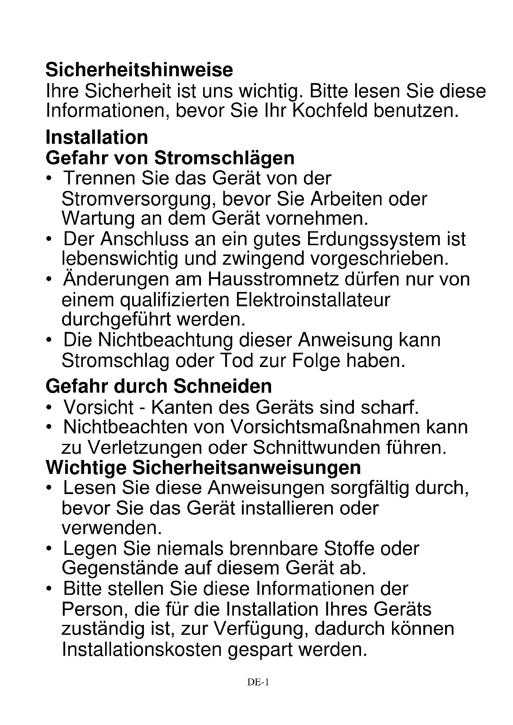 - Använd kärl vars diameter är lika stor som grafiken för den zon du valt.DE-1 Sicherheitshinweise Ihre Sicherheit ist uns wichtig. Bitte lesen Sie diese Informationen, bevor Sie Ihr Kochfeld benutzen. Installation Gefahr von Stromschlägen
