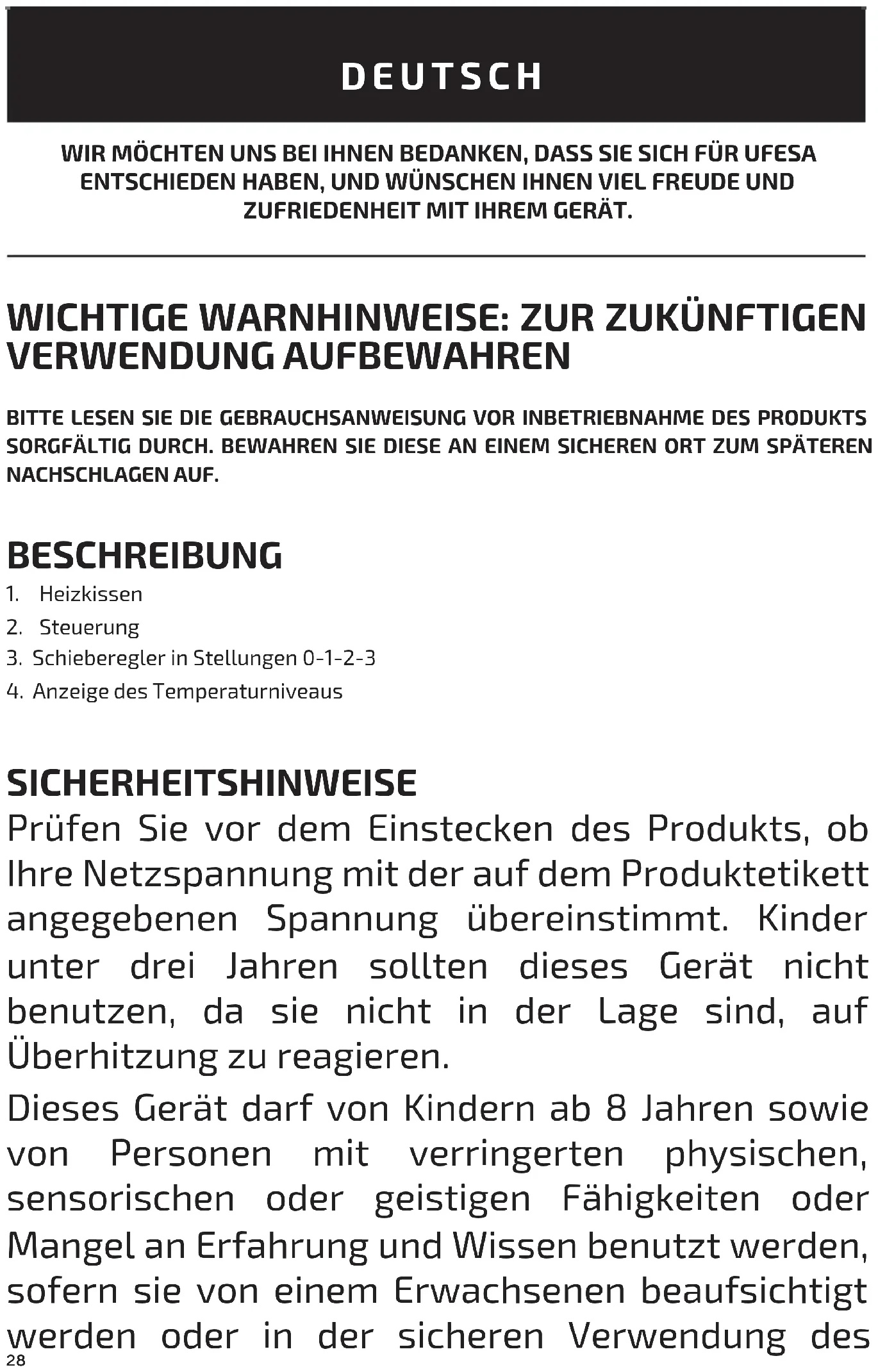 Ziehen Sie den Netzstecker und entfernen Sie den Regler, bevor Sie das Gerät reinigen. Alle Teile des Produkts, mit Ausnahme des Reglers, können von Hand oder in der Maschine gewaschen werden, wobei Flüssigseife bei einer Temperatur von nicht mehr als 30 °C zu verwenden ist und ein Programm für das Waschen empfindlicher Kleidungsstücke zu wählen ist. GERÄTEENTSORGUNG Entsorgen Sie das Wärmekissen am Ende seiner Nutzungszeit nicht im Hausmüll. Wenden Sie sich dazu gemäß der Richtlinie 2012/19/EU über Elektro- und Elektronik-Altgeräte (WEEE) an die Ihrem Wohnort nächstgelegene Bio- Sammelstelle, um zum Schutz der Umwelt beizutragen. Detaillierte Information über die aktuellen Methoden zur Entsorgung von Verpackungen und gebrauchten Geräten erhalten Sie bei Ihrem Händler. Wir hoffen, dass Sie mit diesem Produkt zufrieden sein werden..33 БЛАГОДАРИМ ВИ, ЧЕ ИЗБРАХТЕ UFESA, НАДЯВАМЕ СЕ ТОЗИ ПРОДУКТ ДА ВИ Е ПОЛЕЗЕН И УДОБЕН ЗА РАБОТА. ВАЖНО ПРЕДУПРЕЖДЕНИЕ: ПАЗЕТЕ ЗА БЪДЕЩА СПРАВКА МОЛЯ, ПРОЧЕТЕТЕ ВНИМАТЕЛНО ИНСТРУКЦИИТЕ ЗА УПОТРЕБА ПРЕДИ ДА ИЗПОЛЗВАТЕ ПРОДУКТА. СЪХРАНЯВАЙТЕ ГИ НА БЕЗОПАСНО МЯСТО ЗА БЪДЕЩА