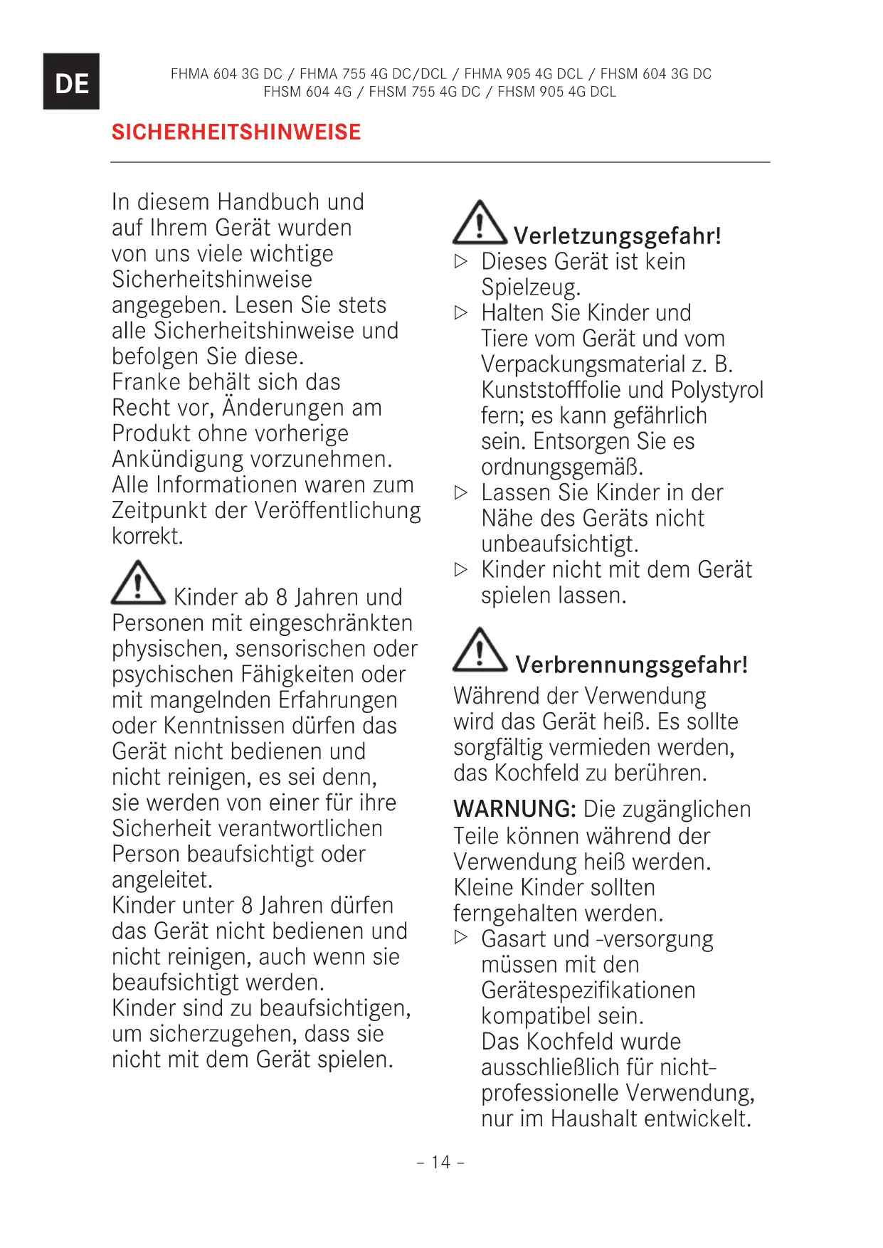 SICHERHEITSHINWEISE In diesem Handbuch und auf Ihrem Gerät wurden von uns viele wichtige Sicherheitshinweise angegeben. Lesen Sie stets alle Sicherheitshinweise und befolgen Sie diese. Franke behält sich das Recht vor, Änderungen am Produkt ohne vorherige Ankündigung vorzunehmen. Alle Informationen waren zum Zeitpunkt der Veröffentlichung korrekt. Kinder ab 8 Jahren und Personen mit eingeschränkten physischen, sensorischen oder psychischen Fähigkeiten oder mit mangelnden Erfahrungen oder Kenntnissen dürfen das Gerät nicht bedienen und nicht reinigen, es sei denn, sie werden von einer für ihre Sicherheit verantwortlichen Person beaufsichtigt oder angeleitet. Kinder unter 8 Jahren dürfen das Gerät nicht bedienen und nicht reinigen, auch wenn sie beaufsichtigt werden. Kinder sind zu beaufsichtigen, um sicherzugehen, dass sie nicht mit dem Gerät spielen. Verletzungsgefahr!