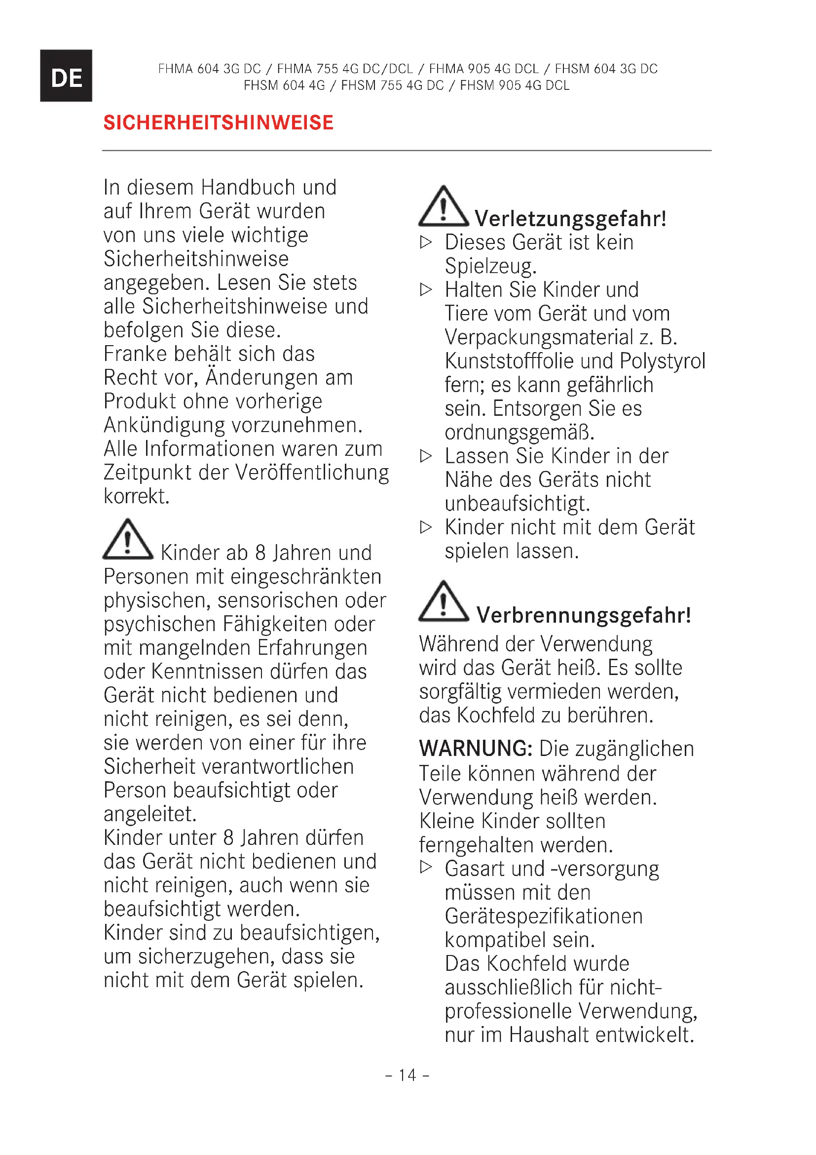 Lagern Sie keine Gegenstände auf den Kochflächen. WARNUNG: Unbeaufsichtigtes oder automatisches Erhitzen von Fett oder Öl auf einem Kochfeld stellt eine Gefahr dar und kann Feuer zur Folge haben. Heißes Öl entzündet sich schnell.– 17 – FHMA 604 3G DC / FHMA 755 4G DC/DCL / FHMA 905 4G DCL / FHSM 604 3G DC FHSM 604 4G / FHSM 755 4G DC / FHSM 905 4G DCL